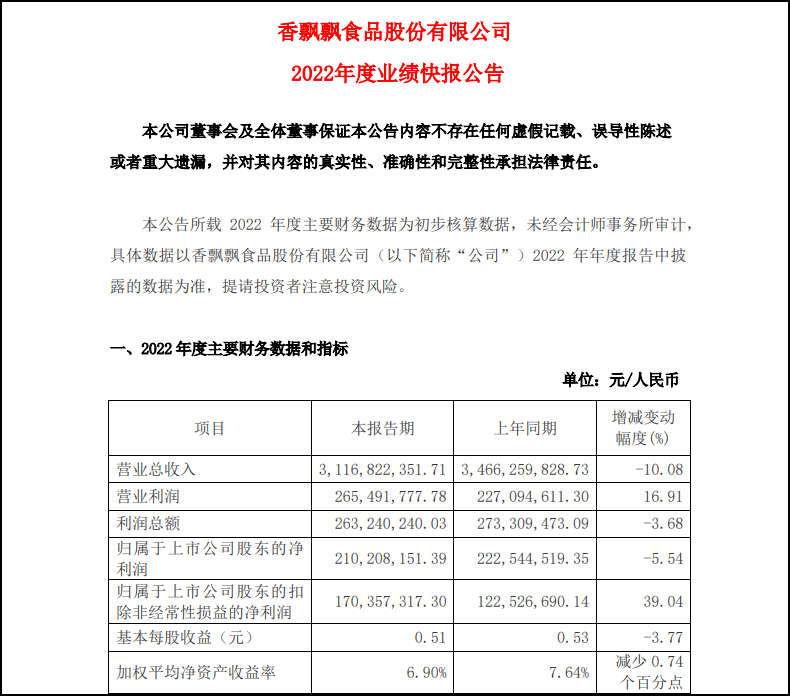 2月6日,香飄飄發(fā)布2022年業(yè)績快報(bào)顯示,公司實(shí)現(xiàn)營業(yè)總收入31.17億元,同比下降10.08%;歸屬于上市公司股東的凈利潤2.1億元,同比下降5.54%。 對于營收下滑,香飄飄表示主要原因是公司沖泡產(chǎn)品銷量雖同比下降,但產(chǎn)品毛利企穩(wěn)回升;此外,公司積極改善企業(yè)經(jīng)營管理效率,提升經(jīng)營質(zhì)量。 報(bào)告期內(nèi),香飄飄歸屬于上市公司股東的扣非凈利潤1.7億元,比上年同期增長39.04%,香飄飄稱,公司沖泡產(chǎn)品的毛利率2022年下半年開始企穩(wěn),同時(shí)費(fèi)用端積極控制,盈利能力得到改善。 |