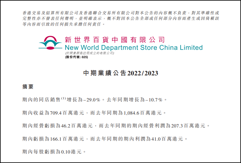 2月22日,新世界百貨中國(guó)(以下簡(jiǎn)稱(chēng)“新世界百貨”)公布截至2022年12月31日止六個(gè)月的中期業(yè)績(jī)。 根據(jù)公告,新世界百貨期間實(shí)現(xiàn)收益約7.09億港元,去年同期為10.85億港元;期內(nèi)經(jīng)營(yíng)虧損為1.66億港元,去年同期盈利4100.2萬(wàn)港元;同店銷(xiāo)售同比下滑29%,去年同期同店銷(xiāo)售下滑10.7%。 按類(lèi)別劃分,新世界集團(tuán)期內(nèi)收益以租金收入為主,占比42.6%;其次為專(zhuān)柜銷(xiāo)售傭金收入,占比30.2%;自營(yíng)貨品銷(xiāo)售占比25.9%;而作為出租人的融資租賃利息收入則占1.3%。 報(bào)告期內(nèi),新世界百貨先后關(guān)閉西安時(shí)尚廣場(chǎng)以及昆明店。 截至2022年12月31日,新世界百貨于中國(guó)內(nèi)地營(yíng)運(yùn)24家百貨公司及購(gòu)物中心,覆蓋全中國(guó)13個(gè)主要地點(diǎn),包括北京、上海、重慶、武漢、南京、天津、長(zhǎng)沙、鄭州、 煙臺(tái)、瀋陽(yáng)、蘭州、燕郊以及綿陽(yáng),概約總樓面面積為978,900平方米。 此外,新世界百貨共營(yíng)運(yùn)四家大型綜合類(lèi)超市“新世界超市”(分別位于北京、武漢、蘭州及煙臺(tái))以及五家LOL(Love . Original . Life()“LOL”)原創(chuàng)生活概念店,其中三家位于上海,兩家位于北京。 |