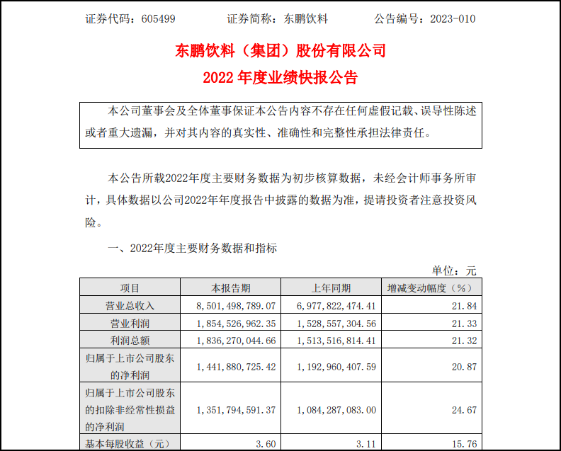 2月20日晚間,東鵬飲料發(fā)布2022年度業(yè)績快報(bào)。東鵬飲料預(yù)計(jì),2022年?duì)I業(yè)收入約85.01億元,同比增加21.84%;歸屬于上市公司股東的凈利潤約14.42億元,同比增加20.87%。 據(jù)此前披露的三季報(bào)測算,去年四季度,東鵬飲料實(shí)現(xiàn)營收 18.57 億元,同比增長31.01%;歸母凈利潤 2.76 億元,同比增長40.34%。 該公司披露,預(yù)計(jì)2022年網(wǎng)點(diǎn)增幅約 30%,支撐四季度終端動(dòng)銷穩(wěn)健;同時(shí),生產(chǎn)自動(dòng)化程度及組織效率較高,12 月感染過峰階段,生產(chǎn)備貨仍正常進(jìn)行,疊加今年春節(jié)提前,渠道補(bǔ)庫積極使得四季度營收增長再度提速。其中,預(yù)計(jì)西南、華中等返鄉(xiāng)大省增速領(lǐng)跑整體。 據(jù)悉,下一步,東鵬飲料準(zhǔn)備將東鵬大咖推進(jìn)全國布局。此外,東鵬金罐、由柑檸檬茶、 電解質(zhì)水等新品也在儲(chǔ)備中。 公開資料顯示,東鵬飲料是深圳老字號(hào)飲料生產(chǎn)企業(yè),上交所主板上市公司。2003年完成全民所有制企業(yè)改制,改制后高速發(fā)展。2021年4月,中國證監(jiān)會(huì)按法定程序核準(zhǔn)了東鵬飲料(集團(tuán))股份有限公司的首發(fā)申請。2021年5月27日,被稱為中國“功能飲料第一股”的東鵬飲料正式登陸A股市場。 值得注意的是,近年來,雖然東鵬飲料業(yè)績有回暖,但增速卻在放緩。 2019年-2021年三年間,東鵬飲料分別實(shí)現(xiàn)營收42.09億元、49.59億元和69.78億元,同比上漲38.56%、17.81%和40.72%;凈利潤則分別為5.71億元、8.12億元和11.93億元,增速則分別為164.36%、42.32%和46.90%。 2022年上半年,東鵬飲料實(shí)現(xiàn)營收42.91億元,同比增長16.54%;凈利潤為7.55億元,同比增長11.66%。截至2022年9月底,東鵬飲料的營收和凈利潤分別為66.44億元和11.6億元,分別同比上漲19.5%和17.01%,與之前的業(yè)績相比,其增速有所下降。 |