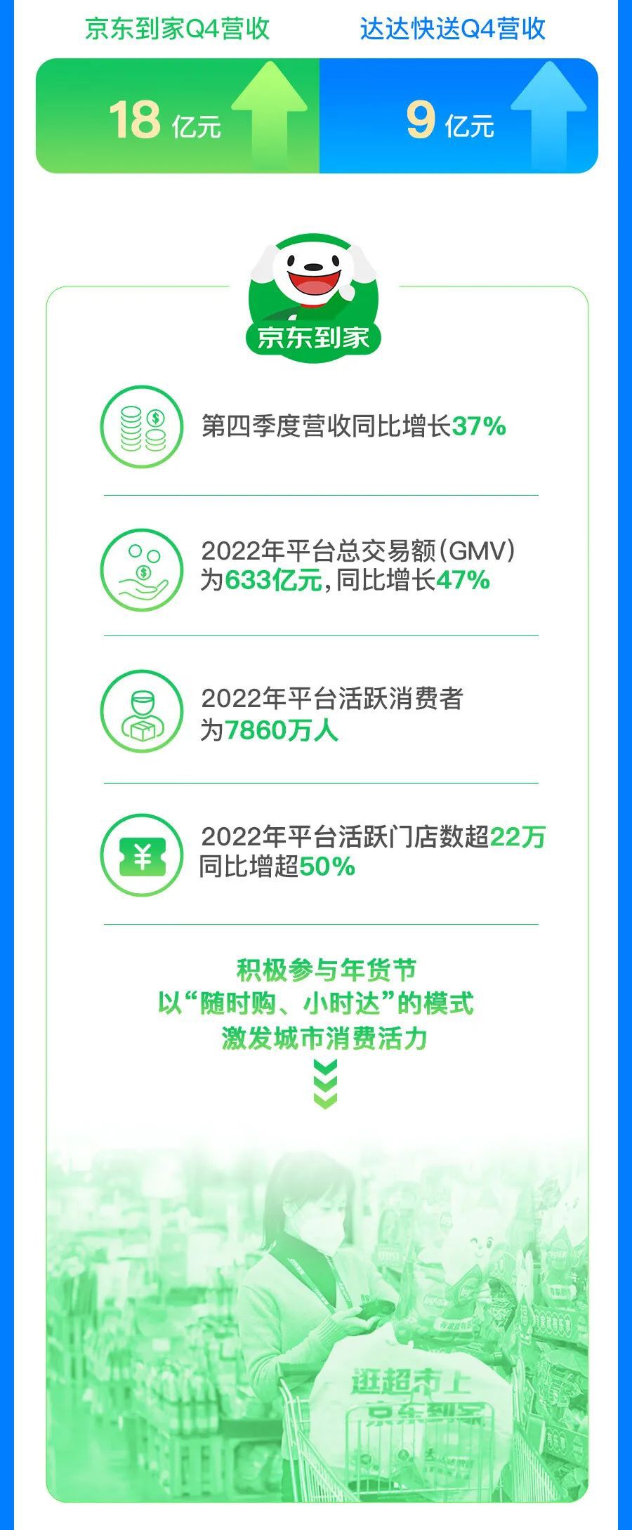 3月9日消息,達(dá)達(dá)集團(tuán)今日發(fā)布其截至2022年12月31日未經(jīng)審計(jì)的2022財(cái)年第四季度和全年業(yè)績。 四季度,達(dá)達(dá)集團(tuán)總營收達(dá)27億元,同比增長32%,調(diào)整后經(jīng)營利潤率同比改善超17個(gè)百分點(diǎn)。2022全年達(dá)達(dá)集團(tuán)總營收達(dá)94億元,同比增長36%,并在2022下半年實(shí)現(xiàn)正向自由現(xiàn)金流。 從全年維度來看,2022年,京東到家平臺(tái)總交易額達(dá)人民幣633億元,同比增長46.9%;京東到家平臺(tái)活躍用戶數(shù)為7860萬,2021年活躍用戶數(shù)為6230萬。 |