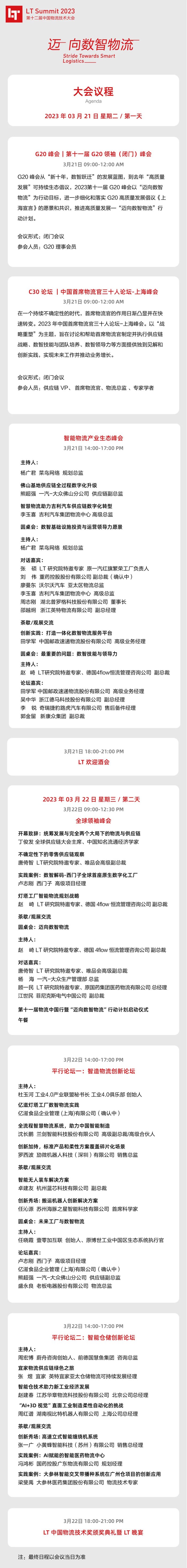 為深入貫徹二十大精神,落實(shí)“十四五”發(fā)展規(guī)劃,加快推動(dòng)數(shù)智物流建設(shè)和高質(zhì)量發(fā)展。2023第十二屆中國(guó)物流技術(shù)大會(huì)(LT Summit 2023,簡(jiǎn)稱(chēng):LT大會(huì) )將于2023年3月21-22日在上海召開(kāi)。 在“十四五”高質(zhì)量發(fā)展的新時(shí)期,“邁向數(shù)智物流”已成為企業(yè)數(shù)智轉(zhuǎn)型和美好生活的迫切需求,LT大會(huì)提出從“數(shù)智躍遷”的新十年藍(lán)圖到物流業(yè)高質(zhì)量發(fā)展倡議《上海宣言》,致力于未來(lái)的物流生態(tài)體系建設(shè),需要全行業(yè)、全鏈路的生態(tài)企業(yè),通過(guò)共建、共創(chuàng),共同面對(duì)推動(dòng)高質(zhì)量發(fā)展所面臨的機(jī)遇與挑戰(zhàn)。 本屆LT大會(huì)以“邁向數(shù)智物流”為主題,近一步落實(shí)高質(zhì)量發(fā)展的新要求,從企業(yè)數(shù)智化轉(zhuǎn)型戰(zhàn)略、首席物流官角色轉(zhuǎn)變到圍繞數(shù)智物流建設(shè)的前瞻趨勢(shì)、創(chuàng)新方案、落地實(shí)踐等全方面、多角度的深度探討,攜手全鏈路生態(tài)企業(yè)共建數(shù)智物流生態(tài)創(chuàng)新體系,加快推動(dòng)“邁向數(shù)智物流”建設(shè)和企業(yè)高質(zhì)量發(fā)展。 會(huì)議安排 3月20日 星期一 14:00 PM-20:00 PM 會(huì)議報(bào)到 報(bào)到地址 上海中庚聚龍酒店(地址:閔行區(qū)閔虹路80號(hào)) 3月21日 星期二 第一天 09:00 AM-12:00 PM G20峰會(huì)|第十一屆G20領(lǐng)袖(閉門(mén))峰會(huì)(僅限邀請(qǐng)) 09:00 AM-12:00 PM C30論壇|中國(guó)首席物流官三十人論壇-上海峰會(huì) 14:00 AM-17:00 PM 智能物流產(chǎn)業(yè)生態(tài)峰會(huì) 18:00 PM-21:00 PM LT之夜歡迎酒會(huì)(LT Networks / VIP會(huì)員) 3月22日 星期三 第二天 09:00 AM-12:00 PM 全球領(lǐng)袖峰會(huì) 14:00 PM-17:00 PM 分論壇一:智造物流創(chuàng)新論壇 分論壇二:智能倉(cāng)儲(chǔ)創(chuàng)新論壇 18:00 PM-21:00 PM 第十一/二屆LT中國(guó)物流技術(shù)獎(jiǎng)?lì)C獎(jiǎng)盛典 關(guān)于展覽 LT大集以用戶(hù)需求和未來(lái)產(chǎn)業(yè)視角,采用“智選模式”聚焦物流數(shù)智化全場(chǎng)景生態(tài)的創(chuàng)新技術(shù)、解決方案和創(chuàng)新成果的展覽展示,努力呈現(xiàn)一幅致力于未來(lái)物流的“產(chǎn)業(yè)生態(tài)地圖”,推動(dòng)生態(tài)連接與合作。 LT積極廣泛的聯(lián)合創(chuàng)新實(shí)踐者展示和推廣創(chuàng)新技術(shù)與最新成果,致力于成為技術(shù)規(guī);瘧(yīng)⽤的重要推手。 搭建時(shí)間:3月20日 16:00-24:00( 以搭建通知為準(zhǔn)) 搭建聯(lián)系人:徐小山 13718941707 會(huì)議日程 參會(huì)嘉賓 LT密切關(guān)注全球技術(shù)趨勢(shì)及前瞻性的熱點(diǎn)話(huà)題,LT組織對(duì)前沿科技與物流深度融合的熱點(diǎn)、趨勢(shì)、企業(yè)戰(zhàn)略、 技術(shù)選型、技術(shù)研發(fā),市場(chǎng)化應(yīng)用創(chuàng)新進(jìn)行研討和分享,每年都吸引來(lái)自制造、零售、醫(yī)藥、食品等物流與供應(yīng)鏈高端決策者、物流系統(tǒng)集成商、物流裝備與信息技術(shù)提供商等高層與會(huì)。 參會(huì)人群 企業(yè)總裁、總經(jīng)理等企業(yè)負(fù)責(zé)人 物流/供應(yīng)鏈負(fù)責(zé)人 采購(gòu)決策者、采購(gòu)負(fù)責(zé)人 制造及生產(chǎn)負(fù)責(zé)人 物流倉(cāng)儲(chǔ)及配送負(fù)責(zé)人 客服履約及協(xié)作負(fù)責(zé)人 供應(yīng)鏈物流/技術(shù)專(zhuān)家和規(guī)劃負(fù)責(zé)人 研究、設(shè)計(jì)機(jī)構(gòu)相關(guān)人員 注冊(cè)參會(huì) LT大會(huì)是物流技術(shù)領(lǐng)域的TOP盛會(huì),每年一度的LT大會(huì)吸引來(lái)⾃各行業(yè)的物流供應(yīng)鏈核心決策者,贊助LT Summit 2023,讓您的企業(yè)成為核心焦點(diǎn),幫助您選擇與參會(huì)者互動(dòng)的最佳方式,讓您獲享最佳的互動(dòng)體驗(yàn)。 聯(lián)系我們,即可了解有關(guān)參會(huì)等詳細(xì)信息,包括根據(jù)貴公司目標(biāo)和預(yù)算量身定制的內(nèi)容。 贊助合作:張新云 M:18500738856 E:zhangxy@Soo56.com 報(bào)名參會(huì):常小麗 M:15210959700 E:changxl@Soo56.com 報(bào)名參會(huì):徐小山 M:13718941707 E:xuzw@Soo56.com 頒獎(jiǎng)典禮 LT獎(jiǎng)是物流領(lǐng)域最重要的獎(jiǎng)項(xiàng)之一,創(chuàng)立于 2011年,旨在表彰物流領(lǐng)域的創(chuàng)新成就,以"公平、公正、公開(kāi)、公益"的評(píng)獎(jiǎng)原則著稱(chēng)。LT獎(jiǎng)自創(chuàng)辦之日起,所堅(jiān)持的公益性和評(píng)審的獨(dú)立性,保證了獎(jiǎng)項(xiàng)的影響力和社會(huì)公信力,是公認(rèn)的物流領(lǐng)域最重要的獎(jiǎng)項(xiàng)之一,被譽(yù)為“物流界奧斯卡”。 2022第十一屆和2023第十二屆LT中國(guó)物流技術(shù)獎(jiǎng)經(jīng)過(guò)報(bào)名、用戶(hù)初審、專(zhuān)家終審,將于2023年03月22日在上海舉行隆重的頒獎(jiǎng)典禮。 關(guān)于LT LT是一個(gè)致力于科技與應(yīng)用創(chuàng)新平臺(tái)。通過(guò)舉辦LT大會(huì),LT大獎(jiǎng),發(fā)展會(huì)員網(wǎng)絡(luò)、組織行業(yè)活動(dòng)和應(yīng)用創(chuàng)新研究等方式,推動(dòng)科技與產(chǎn)業(yè)的深度融合,幫助會(huì)員之間及潛在合作伙伴發(fā)展可信賴(lài)的關(guān)系網(wǎng)絡(luò)。 LT 