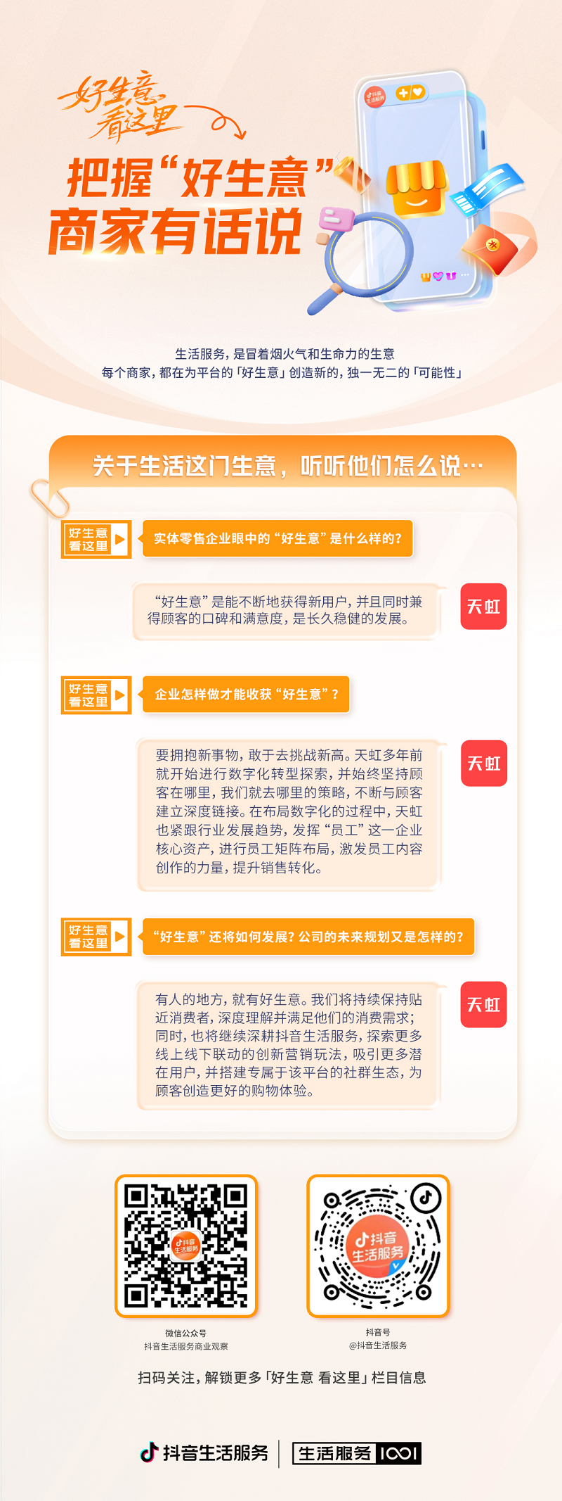 「好生意 看這里」 「好生意 看這里」是抖音生活服務(wù)推出的一檔系列商業(yè)紀(jì)錄片,欄目聚焦商業(yè)價(jià)值,真實(shí)記錄生活服務(wù)商家數(shù)字化轉(zhuǎn)型的全過程。通過展現(xiàn)商家的經(jīng)營全景,為不同地域、不同規(guī)模的行業(yè)商家提供經(jīng)營理念參考。 近年來,中國消費(fèi)市場變化不斷,線上消費(fèi)逆勢上揚(yáng),新賽道持續(xù)涌現(xiàn)。變化之下,線上線下一體化成為零售行業(yè)的新發(fā)展趨勢。 很多傳統(tǒng)商場、百貨企業(yè)紛紛加快數(shù)字化轉(zhuǎn)型步伐,掘金線上海量流量,提升到店客流和交易轉(zhuǎn)化。在2013年就開始進(jìn)行全渠道變革的天虹數(shù)科商業(yè)股份有限公司(以下簡稱“天虹”),經(jīng)過多年的數(shù)字化經(jīng)營,已經(jīng)積累上千萬會員客戶!暗琅f期待獲得更多的新客戶”。 實(shí)體零售企業(yè)如何抓住線上線下不斷融合的機(jī)遇,開辟全新增長曲線?面對海量流量,該怎樣抓住用戶眼球并獲得其青睞?又該如何將“捕捉”的網(wǎng)絡(luò)用戶真正沉淀為自己的忠實(shí)顧客? 在「好生意 看這里」欄目首期視頻中,實(shí)體零售企業(yè)天虹帶來了它的發(fā)展經(jīng)驗(yàn)。 顧客在哪兒,我們就想辦法在哪兒 社會發(fā)展進(jìn)程中,個(gè)體與整體的相互作用,帶來了不斷變化的消費(fèi)場景。對新一代消費(fèi)者來說,他們成長的年代,物質(zhì)及精神文化產(chǎn)品愈發(fā)充裕、消費(fèi)渠道更加多元,消費(fèi)不僅僅是選購商品,更是自我態(tài)度的表達(dá)。全新消費(fèi)趨勢下,以內(nèi)容為載體,全方位呈現(xiàn)品牌的多維價(jià)值,激發(fā)消費(fèi)潛在需求,成為零售企業(yè)新的增長點(diǎn)。 “我們發(fā)現(xiàn),內(nèi)容種草,已經(jīng)深度地影響顧客去做消費(fèi)行為決策了!痹谡J(rèn)識到越來越多的用戶開始習(xí)慣于線上內(nèi)容種草模式之后,天虹將目光瞄向了抖音生活服務(wù)平臺,借助其內(nèi)容優(yōu)勢,實(shí)現(xiàn)更大范圍的用戶拓新,并提升老用戶對品牌的好感。 “顧客他喜歡什么樣的渠道,我們就會到顧客需要的地方!比腭v抖音生活服務(wù)之后,天虹不斷加強(qiáng)自身的內(nèi)容孵化和直播能力,并建立天虹門店矩陣號,夯實(shí)潛在顧客觸達(dá)基礎(chǔ)。經(jīng)過不斷的嘗試和調(diào)整,天虹在抖音生活服務(wù)摸索出了適合自己的經(jīng)營策略,并獲得突破性的銷售增長。2022年,天虹在抖音生活服務(wù)實(shí)現(xiàn)的GMV高達(dá)1.3億,并創(chuàng)下12天內(nèi)攬收1000萬成交額的佳績。 可觀的銷售業(yè)績,讓天虹對深耕抖音生活服務(wù)的策略更加篤定!(在一場直播中)4小時(shí),我們賣出了3000多張券,把所有人都征服了,也讓我們真正認(rèn)識到,原來這個(gè)平臺可以給我們帶來這么大的流量!碧旌鐢(shù)字資產(chǎn)經(jīng)營中心資深策劃經(jīng)理時(shí)玉杰表示。 從流量時(shí)代走向“留量”時(shí)代 他山之石,或可攻玉。天虹還借助了抖音生活服務(wù)什么樣的優(yōu)勢?又沉淀下來了哪些值得零售企業(yè)參考借鑒的經(jīng)營方法? 緊貼客戶需求,豐富貨品品類。巨量算數(shù)數(shù)據(jù)顯示,超過2/3的年輕人在網(wǎng)上購物時(shí),會重點(diǎn)考慮商品質(zhì)量和價(jià)格,拒絕沖動(dòng)購物和智商稅。新一代消費(fèi)者在種草之余也更加注重“物有所值”。在抖音生活服務(wù),天虹早期在直播間內(nèi)僅銷售百貨通用券。伴隨粉絲數(shù)量的增多,有不少用戶開始在天虹直播間內(nèi)及短視頻的評論區(qū)中詢問能否多一些面向超市零售、黃金珠寶等品類的優(yōu)惠。洞察到消費(fèi)者需求之后,天虹及時(shí)調(diào)整了貨品策略,豐富了代金券的種類,增加了餐飲券、零食券、購物卡券等多種產(chǎn)品,精準(zhǔn)滿足不同用戶的個(gè)性化需求,推動(dòng)用戶消費(fèi)興趣提升。 線上線下聯(lián)動(dòng),構(gòu)建完整消費(fèi)鏈路。在抖音生活服務(wù),為提升線上到線下的轉(zhuǎn)化率,天虹采取了多種策略加強(qiáng)線上線下的聯(lián)動(dòng),搭建起了完整的消費(fèi)鏈路。在直播開始前,會先在私域社群進(jìn)行預(yù)告引流,提升直播間的活躍度;同時(shí),天虹也會在線下門店設(shè)計(jì)豐富的營銷活動(dòng)對應(yīng)線上代金券的推廣,進(jìn)一步激發(fā)用戶消費(fèi)欲望。“顧客可能買到的券是 1000 塊錢,但實(shí)際上他到店之后的消費(fèi)肯定遠(yuǎn)不止這 1000 塊錢!本上至線下完整鏈路的搭建,進(jìn)一步推動(dòng)了天虹整體GMV提升。 搭建員工矩陣,激活傳統(tǒng)零售企業(yè)核心優(yōu)勢。伴隨直播、短視頻的快速發(fā)展和各行各業(yè)數(shù)字化轉(zhuǎn)型步伐的提速,店員變身帶貨達(dá)人,在鏡頭里帶領(lǐng)顧客“云逛街”的職人模式正在上演。職人模式,是指將企業(yè)內(nèi)部員工發(fā)展為具備短視頻及直播帶貨能力的內(nèi)容創(chuàng)作者,使其成為企業(yè)自己的“達(dá)人”,既滿足了員工內(nèi)容創(chuàng)作的興趣,也為企業(yè)和員工本人帶來更多營收。通過抖音生活服務(wù),企業(yè)在職員工可以得到職人認(rèn)證,職人內(nèi)容亦可得到更多平臺支持,更好發(fā)揮多員工優(yōu)勢,撬動(dòng)更多潛在顧客。 “員工對于我們來說,是一