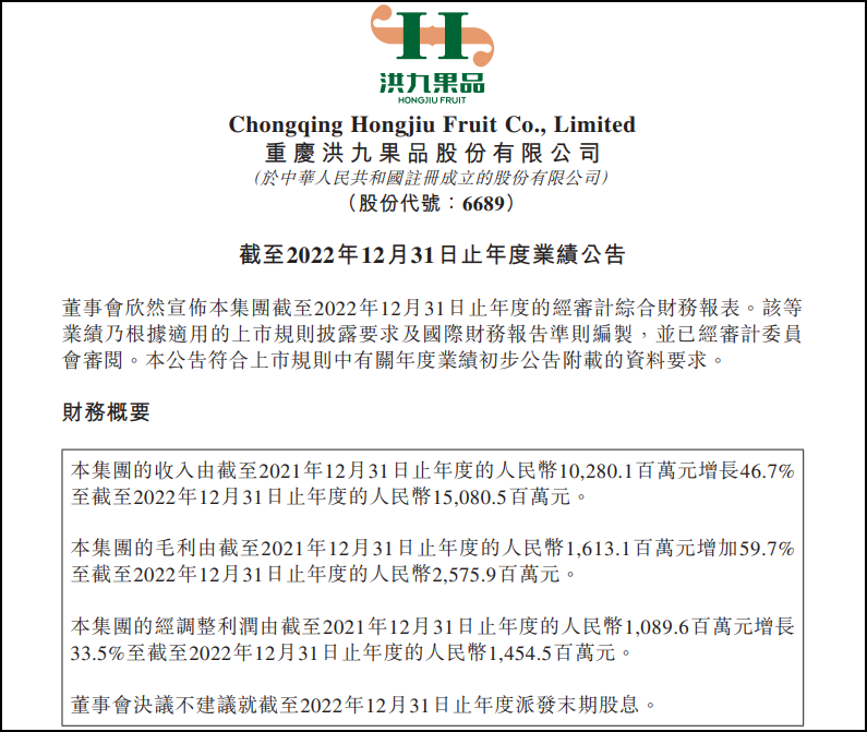 3月20日,洪九果品公布2022年度業(yè)績顯示,實(shí)現(xiàn)營收150.81億元,同比增長46.70%;毛利為25.76億元,同比增長59.69%;經(jīng)調(diào)整利潤為14.55億元,同比增長33.49%。這也是洪九果品發(fā)布上市后首份年度成績單。 截至2022年底,集團(tuán)已在全國設(shè)立了23家銷售分公司及60個分揀中心,覆蓋了超過300個城市,觸達(dá)終端批發(fā)商、新興零售商、商超客戶及直銷等不同類型客戶。根據(jù)灼識咨詢的報(bào)告,按照2022年銷售收入計(jì)算,洪九果品已經(jīng)成為中國最大的水果分銷商。 |