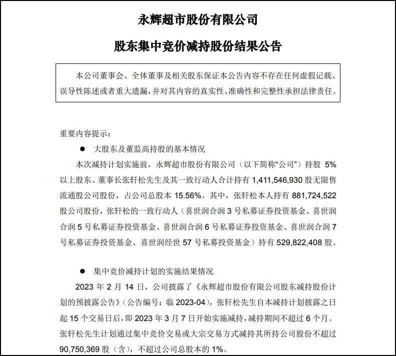 3月23日消息,永輝超市股份有限公司 今日發(fā)布股東集中競價(jià)減持股份結(jié)果公告。 公告稱,公司于近日收到張軒松先生出具的《關(guān)于股份減持計(jì)劃實(shí)施結(jié)果的函》,截至2023年3月22日,張軒松先生通過集中競價(jià)方式合計(jì)減持了90,482,224股,占公司當(dāng)前總股本的1%,本次減持計(jì)劃已實(shí)施完畢。 |