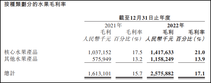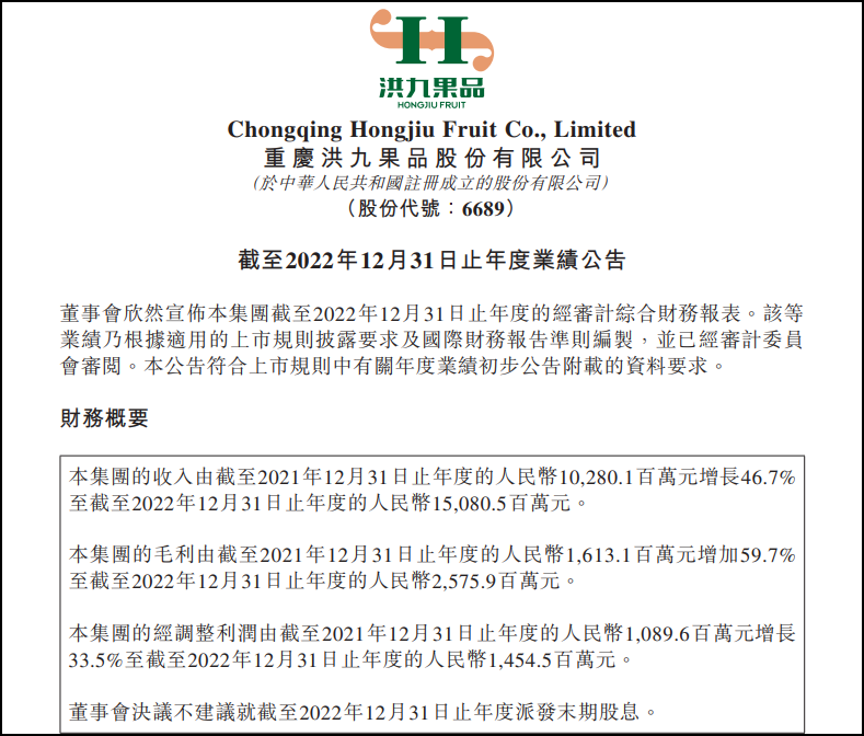 3月21日,港股上市水果分銷公司重慶洪九果品股份有限公司(簡稱“洪九果品”)發(fā)布上市后首份年報(bào)。 報(bào)告期內(nèi),洪九果品實(shí)現(xiàn)營收150.81億元,同比增長46.70%;公司權(quán)益股東應(yīng)占利潤14.52億元,同比增長397.95%,平均每日的利潤約為398萬元;經(jīng)調(diào)整后的凈利潤為14.55億元,同比增長33.5%。 而在2019年,洪九果品的營收和歸母凈利潤分別僅為20.78億元及1.63億元,至2022年的復(fù)合年增長率分別高達(dá)約93.61%及107.3%,短短幾年時(shí)間整體營收規(guī)模和利潤水平直線“狂飆”。 洪九果品表示,報(bào)告期內(nèi)收入增加,主要是由于進(jìn)一步拓寬銷售網(wǎng)絡(luò),新進(jìn)入哈爾濱、南京、鄭州及保定等地區(qū);“端到端”的供應(yīng)鏈保證了持續(xù)、穩(wěn)定的水果供應(yīng),獲得更多客戶認(rèn)可;戰(zhàn)略性對(duì)水果品類的選擇,特別是核心水果品類依然有著強(qiáng)勁的消費(fèi)者需求;其他水果品類也得到快速增長。 洪九果品官網(wǎng)顯示,該公司成立于2002年,創(chuàng)始人為鄧洪九,主要業(yè)務(wù)為與全球優(yōu)質(zhì)水果基地的合作及優(yōu)質(zhì)水果資源的整合,擁有覆蓋全國的多種銷售渠道。 2022年9月5日,洪九果品成功在港交所掛牌上市,成為“中國水果第一股”。2023年3月13日起,洪九果品被正式納入恒生綜合指數(shù)及恒生港股通指數(shù)。 分產(chǎn)品來看,2022年,洪九果品核心水果產(chǎn)品(榴蓮、火龍果、龍眼、葡萄、車?yán)遄印⑸街瘢╀N售金額為67.62億元,較2021年上升14.4%。其中榴蓮的銷售金額為39.65億元,較2021年上升13.9%;瘕埞匿N售金額為8.25億元,較2021年下降2.4%;葡萄的銷售金額為7.12億元,較2021年上升42.2%。 洪九果品在榴蓮、山竹、龍眼、火龍果等14個(gè)主要水果品類中成功打造了18個(gè)水果品牌。2022年,洪九果品繼續(xù)堅(jiān)持品牌戰(zhàn)略,品牌水果產(chǎn)品的銷售額由去年的75.33億元增長42.8%,至107.54億元,品牌水果占總收入的71.3%。 洪九果品毛利率穩(wěn)步提升。公司毛利由2021年的16.13億元增加59.7%,至2022年的25.76億元,毛利率達(dá)17.1%,其中品牌水果產(chǎn)品的毛利率由2021年的16.7%,上升至2022年的18.3%。公司部分核心水果品類毛利率亦有較好表現(xiàn)。其中,榴蓮的毛利率由去年的20.7%,上升至2022年的24.5%;火龍果的毛利率由去年的11.5%,上升至2022年的14.1%;車?yán)遄拥拿视扇ツ甑?.4%,上升至2022年的19.4%。 據(jù)了解,截至2022年底,集團(tuán)已在全國設(shè)立了23家銷售分公司及60個(gè)分揀中心,覆蓋了超過300個(gè)城市,觸達(dá)終端批發(fā)商、新興零售商、商超客戶及直銷等不同類型客戶。 截至2022年底,集團(tuán)位于泰國和越南的當(dāng)?shù)氐膯T工近400人,并在越南和泰國當(dāng)?shù)剡\(yùn)營了16個(gè)水果加工工廠。2022年,公司將核心產(chǎn)品榴蓮的采購區(qū)域拓展至越南,與泰國榴蓮的成熟季節(jié)互補(bǔ),保障了公司對(duì)榴蓮這一核心單品的供應(yīng)。此外,集團(tuán)進(jìn)口火龍果與龍眼的數(shù)量占中國海關(guān)向越南進(jìn)口火龍果與向泰國進(jìn)口龍眼的份額分別為17.1%和13.4%。 根據(jù)灼識(shí)咨詢的報(bào)告,按照2022年銷售收入計(jì)算,洪九果品已經(jīng)成為中國最大的水果分銷商;同時(shí),按2022年相應(yīng)品類銷售收入計(jì)算,集團(tuán)繼續(xù)保持了中國最大的東南亞水果分銷商、最大的榴蓮分銷商以及最大的進(jìn)口火龍果分銷商的地位,也是第二大的進(jìn)口龍眼分銷商和市場領(lǐng)先的山竹、進(jìn)口車?yán)遄雍瓦M(jìn)口葡萄分銷商。 |