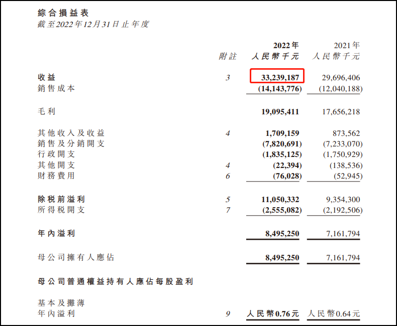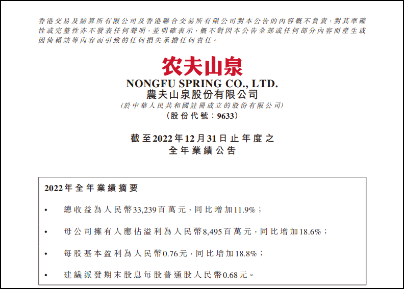 3月28日,農(nóng)夫山泉發(fā)布2022年業(yè)績。期內(nèi),總收益約為332.39億元,同比增加11.9%;母公司擁有人應(yīng)占溢利為84.95億元,同比增加18.6%。 而農(nóng)夫山泉2022年集團(tuán)毛利為190.95億元,增8.2%。毛利率則由去年同期的59.5%下降至57.4%。農(nóng)夫山泉表示,毛利率下降主要是由于國際原油價格變動導(dǎo)致集團(tuán)PET采購成本提高。 董事長鐘睒睒在業(yè)績報告中表示,2022年面對世界環(huán)境、新冠疫情等多重考驗,農(nóng)夫山泉繼續(xù)穩(wěn)中求進(jìn)。未來,將在繼續(xù)深耕研發(fā)、品牌、信息、渠道等方面建設(shè)的同時,進(jìn)一步加強對優(yōu)質(zhì)水資源和人才資源的發(fā)展和儲備。 去年,農(nóng)夫山泉幾乎全部飲料產(chǎn)品收益都錄得增長,但是飲用水和茶飲料占比呈一降一升。其中包裝飲用水仍舊是占到公司總收益的半壁江山。該類產(chǎn)品去年全年收益為182.63億元,同比增7.1%或超過12億元,但是占總收益比例下降2.5個百分點至54.9%。 農(nóng)夫山泉表示,2022 年包裝飲用水即飲渠道的銷售在疫情期間受到?jīng)_擊。為促進(jìn)中大規(guī)格包裝飲用水的銷售,其推出了4.5L、6L 等新容量規(guī)格產(chǎn)品,進(jìn)一步完善包裝飲用水的容量規(guī)格矩陣。 農(nóng)夫山泉的另一大增長引擎茶飲料在2022年突飛猛進(jìn)。去年,茶飲料收益69.06億元,比2021年大幅增加23.27億元,或同比增長50.8%;占總收益比例也達(dá)到了20.8%,或增加5.4個百分點。 疫情影響下,消費者戶外活動有所減少,但對維生素飲料產(chǎn)品的重視加強,去年其功能飲料產(chǎn)品的收益為38.38億元,增長3.9%,占去年總收益的11.5%;由于NFC果汁進(jìn)一步受到消費者的喜愛 ,去年其果汁飲料產(chǎn)品收益為28.79億元,增長10.1%,占總收益 8.7%。 不過,蘇打水飲料、含氣風(fēng)味飲料、咖啡飲料以及鮮果農(nóng)產(chǎn)品等其他產(chǎn)品是例外。去年,這一類別的收益同比下降22.7%,占2022年總收益的4.1%,全年收益達(dá)13.53億元。 此外,由于銷售的增長帶動存貨的周轉(zhuǎn),農(nóng)夫山泉去年底的存貨周轉(zhuǎn)天數(shù)由一年前的54.8天減少至50.5天。在薪酬方面,去年底該公司的員工總?cè)藬?shù)超過2萬名,2022年度員工福利開支總額(包括董事酬金)為人民幣32.61億元。 展望2023年,農(nóng)夫山泉表示“將繼續(xù)堅持提供健康天然的產(chǎn)品,并探索和開發(fā)更多創(chuàng)新優(yōu)質(zhì)的產(chǎn)品,滿足消費者不斷變化的需求,同時持續(xù)拓展銷售渠道,擴大市場份額”。 此外,疫情之后,大眾消費心理和模式也可能發(fā)生變化,公司將靈活適應(yīng)市場變化和更好地滿足消費者的需求。 |