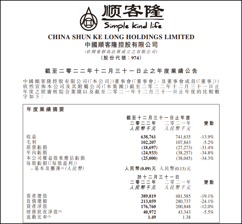 3月29日晚間,中國順客隆公布了2022年業(yè)績顯示,實(shí)現(xiàn)營收6.39億元,同比下降13.87%;實(shí)現(xiàn)凈虧損2500萬元,相比上一年度,虧損額進(jìn)一步收窄;毛利1.02億元,同比下降5.23%。 對于營收下降,中國順客隆在公告中給出的解釋是由于受到線上電商的沖擊及新冠疫情的雙重影響,中國順客隆關(guān)閉部分虧損門店、減少大宗批發(fā)業(yè)務(wù)以及結(jié)束部分經(jīng)營項(xiàng)目(如儲備肉業(yè)務(wù)),使本集團(tuán)零售及批發(fā)分銷業(yè)務(wù)銷售減少所致。凈虧損同比收窄的主要原因主要是由于2022財(cái)年內(nèi)管理費(fèi)用以及銷售及分銷成本減少所致。 2022年,中國順客隆新開1家零售店并關(guān)閉2家零售店。截至2022年12月31日,中國順客隆分別在中國廣東省有66家零售店及在中國澳門特別行政區(qū)有1家零售店。 |