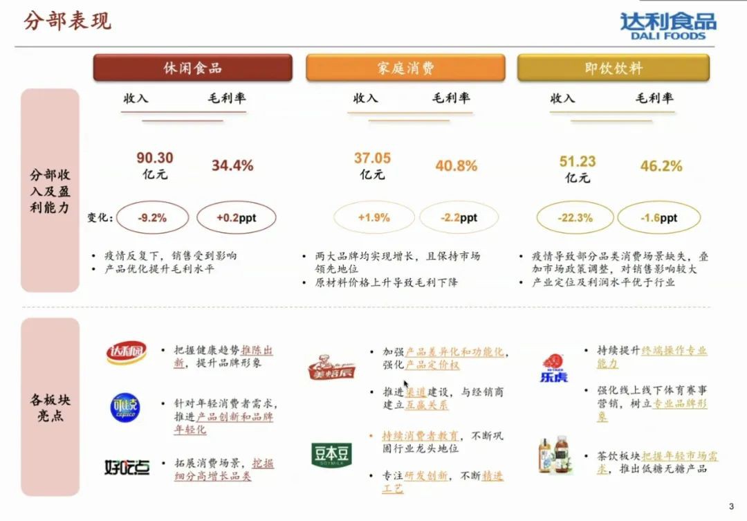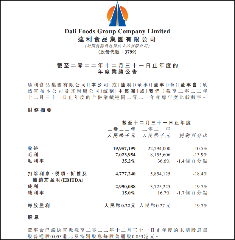 近日,達(dá)利食品發(fā)布截至2022年12月31日止年度業(yè)績,該集團(tuán)取得收益人民幣199.57億元(單位下同),同比減少10.5%;毛利70.24億元,同比減少13.9%;純利29.9億元,同比減少19.7%。 其中家庭消費分部收入同比上升1.9%至人民幣37.05億元,休閑食品分部收入下滑9.2%至人民幣90.30億元,即飲飲料分部收入同比下滑22.3%至人民幣51.23億元。 公司實現(xiàn)毛利人民幣70.24億元,同比下降13.9%;家庭消費、休閑食品及即飲飲料分部的毛利分別為人民幣15.12億元、31.04億元及23.69億元,同比分別下降3.3%、8.7%及24.8%。 |