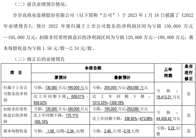 4月14日,步步高商業(yè)連鎖股份有限公司發(fā)布2022年度業(yè)績預告修正公告。 今年1月16日,步步高披露了《2022年業(yè)績預告》,預計2022年度歸屬于上市公司股東的凈利潤區(qū)間為虧損130,000萬元-195,000萬元;扣除非經(jīng)常性損益后的凈利潤區(qū)間為虧損120,000萬元-180,000萬元。 修正后,預計2022年度歸屬于上市公司股東的凈利潤區(qū)間為虧損205,000萬元-265,000萬元,比上年同期下降1013.33%-1339.18%;扣除非經(jīng)常性損益后的凈利潤區(qū)間為虧損195,000萬元-255,000萬元,比上年同期下降338.93%–473.98%。 公告顯示,修正主要原因在于隨著評估師對商譽減值評估工作的深入,結合目前實體零售消費復蘇緩慢等外部經(jīng)濟環(huán)境的影響,對預期進行了更謹慎性的判斷,在與評估師充分溝通后,公司預計目前商譽減值金額超過原預估金額約1.8億元。 其次,步步高超市從四川、江西市場退出、收縮后,對四川、江西地區(qū)的遞延所得稅資產(chǎn)進行了全部沖銷。對部分可彌補虧損金額確認的遞延所得稅資產(chǎn)進行沖回,調整金額約4.3億元。 此外,依據(jù)評估師對投資性房地產(chǎn)評估的進展情況,預計投資性房地產(chǎn)賬面價值與評估機構評估的公允價值存在差異,預計公允價值下降約0.5億元。 |