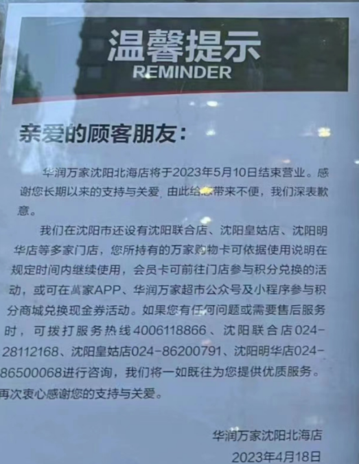4月20日消息,據(jù)沈陽公交網(wǎng)報(bào)道,4月18日,華潤萬家沈陽北海店宣布將于5月10日結(jié)束營業(yè)。 通知稱,該店關(guān)閉后,華潤萬家在沈陽還設(shè)有聯(lián)合店、皇姑店、明華店等多家門店。對(duì)于購物卡或積分問題,您可以將所持萬家購物卡可以依據(jù)使用說明在規(guī)定時(shí)間內(nèi)繼續(xù)使用,會(huì)員卡可前往門店參與積分兌換的活動(dòng)。 資料顯示,華潤萬家北海店的前身為樂購旗下的沈陽樂都匯,2013年8月開業(yè),2017年左右停業(yè)后被華潤萬家收購。 |