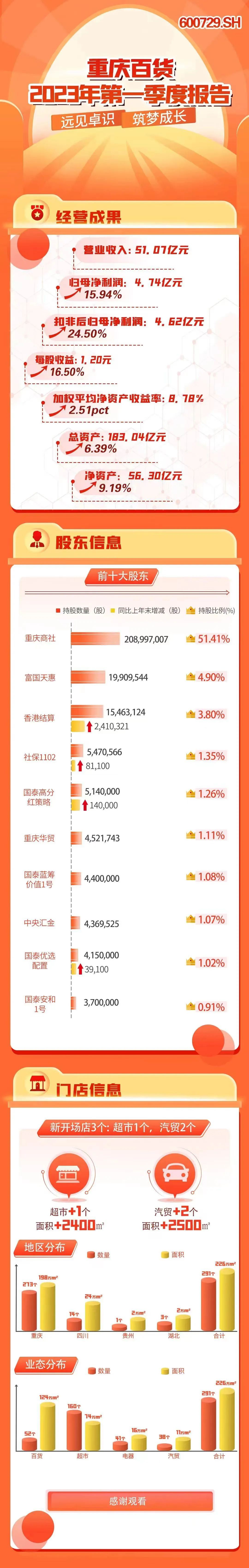 4月29日消息,重慶百貨發(fā)布2023一季度業(yè)績顯示,營收約51.07億元,同比減少3.18%;歸屬于上市公司股東的凈利潤約4.74億元,同比增長15.94%,扣非后凈利潤4.62億元,增幅24.50%。 展望2023年全年,重慶百貨表示,將全面提升商品經(jīng)營、業(yè)態(tài)/業(yè)務(wù)創(chuàng)新、全面數(shù)字化、會員運營、全渠道銷售、服務(wù)履約“六大能力”,全面推進數(shù)智化,徹底回歸商業(yè)本質(zhì),堅守零售底層邏輯,推進融合、變革、創(chuàng)新,持續(xù)激發(fā)組織活力,力爭取得更好的經(jīng)營業(yè)績,保持行業(yè)領(lǐng)先地位。 2022年1至12月份,重慶百貨的營業(yè)收入構(gòu)成為:超市業(yè)態(tài)占比35.75%,汽貿(mào)業(yè)態(tài)占比29.36%,電器業(yè)態(tài)占比13.38%,百貨業(yè)態(tài)占比10.12%,其他占比2.91%。 |