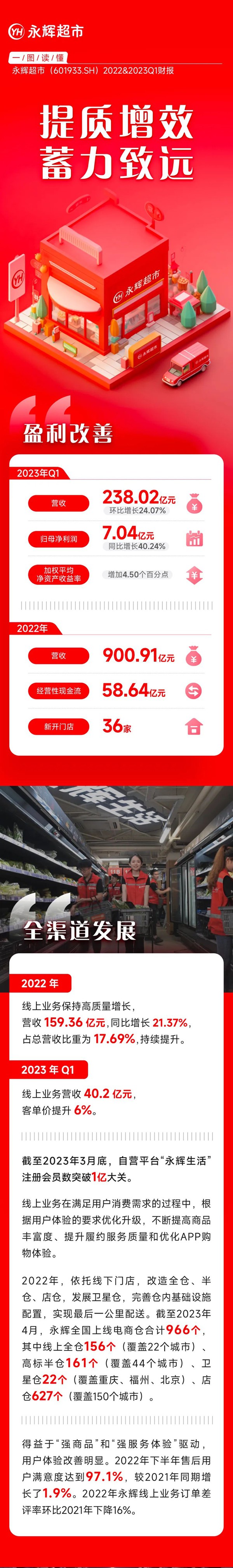 4月29日消息,永輝超市發(fā)布2023一季業(yè)績顯示,實現營業(yè)收入238.02億元,環(huán)比2022年第四季度增長24.07%;歸母凈利潤7.04億元,同比增長40.24%。 同時,永輝超市還披露了2022年年報顯示,實現營業(yè)收入900.91億元,同比下降1.07%;歸屬于上市公司股東的凈利潤-27.63億元,上年同期虧損39.44億元,相比減虧29.94%。 2022年,永輝新開36家門店,并通過精選+優(yōu)選優(yōu)質門店物業(yè)、淘汰部分尾部門店,主動開啟門店迭代時代。 線上業(yè)務方面,永輝超市2022年實現銷售額159.36億元,同比增長21.37%,占總收入比重為17.69%。2023年第一季度,公司線上業(yè)務銷售額達40.2億元,客單價提升6%。此外,截至2023年第一季度末,永輝超市自營平臺“永輝生活”注冊會員數已突破1億大關。 |