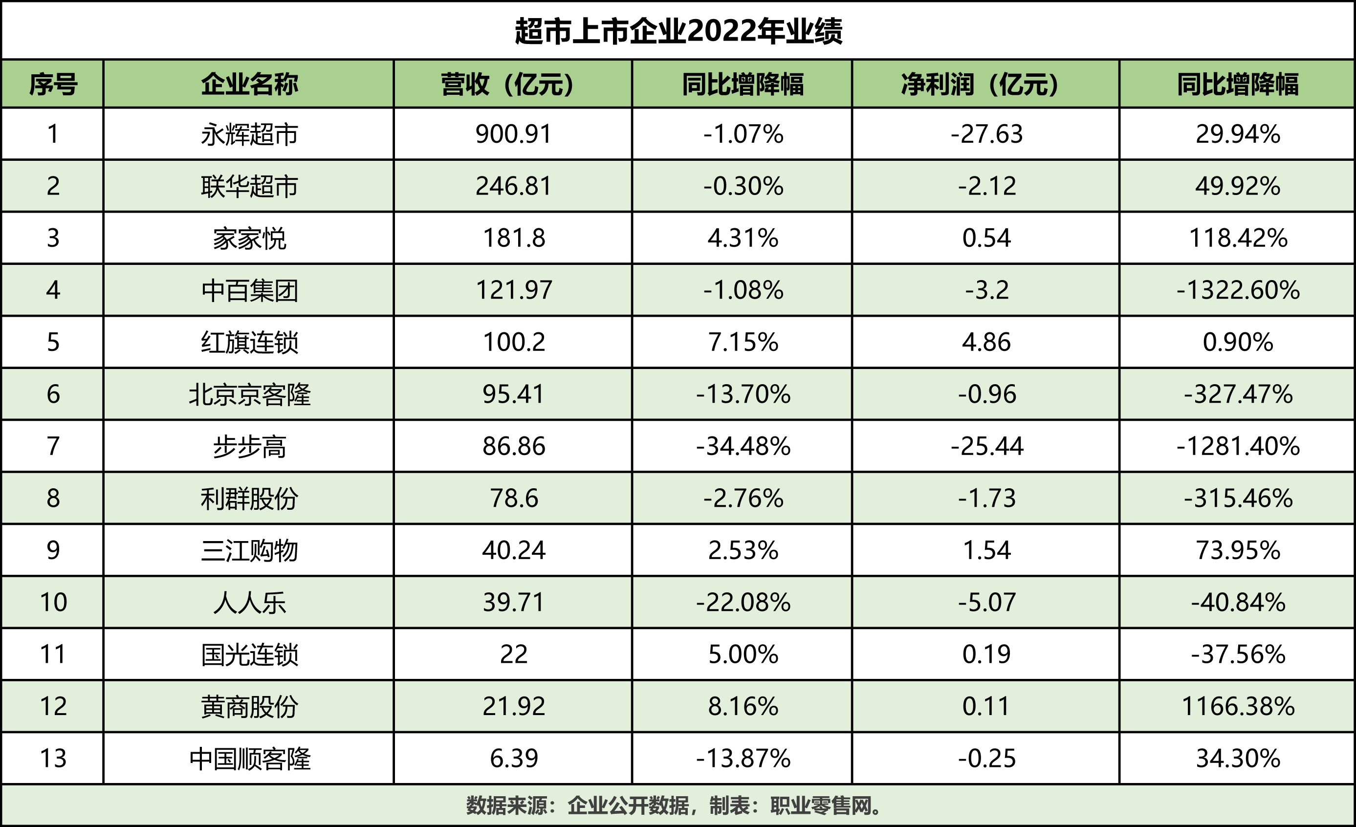 隨著4月的結(jié)束,超市上市企業(yè)2022年報(bào)發(fā)布也落下帷幕。 近日,永輝超市、家家悅、步步高、人人樂等13家上市超市,紛紛交出了2022年的“成績單”。 從統(tǒng)計(jì)表顯示,超市上市企業(yè)2022年?duì)I收、凈利潤大部分出現(xiàn)下滑、虧損。其中營收方面步步高下滑34.48%、人人樂下滑22.08%、順客隆下滑13.87%、北京京客隆下滑13.70%均出現(xiàn)兩位數(shù)下滑,而凈利潤方面永輝虧損27.63億,步步高虧損25.44億成為虧損最多的兩家超市。 而在營收和凈利潤都有增長的超市僅有4家,分別是家家悅、三江購物、紅旗連鎖、黃商股份。 值得注意的是,由于新華都和華聯(lián)綜超已剝離零售業(yè)務(wù),因此將不再統(tǒng)計(jì)相關(guān)數(shù)據(jù)。 下面我們一起看看,超市上市企業(yè)2022年業(yè)績、門店情況,以及2023年發(fā)展規(guī)劃。 1、永輝超市:營收900億,凈虧損27億 近日,永輝超市發(fā)布2022年年報(bào)顯示,實(shí)現(xiàn)營業(yè)收入900.91億元,同比下降1.07%;歸屬于上市公司股東的凈利潤-27.63億元,上年同期虧損39.44億元,相比減虧29.94%。 對于再次巨虧,永輝超市年報(bào)中表示,主要因收入下滑,毛利率偏低使得整體經(jīng)營尚處于虧損中;其次金融資產(chǎn)減值、股權(quán)投資減值以及虧損和關(guān)閉損失。 門店方面,2022年新開Bravo門店36家,關(guān)閉Bravo業(yè)態(tài)門店60家,新簽約門店10家。截至2022年底,超市業(yè)務(wù)已經(jīng)進(jìn)入全國29個省市,超市業(yè)態(tài)門店1033家。同時還擁有32個物流中心、1個產(chǎn)地倉,配送范圍已覆蓋全國29個省市,物流總運(yùn)作面積85萬平方米。 永輝超市表示,零售環(huán)境更為艱難的一年,公司為國內(nèi)少數(shù)仍保持開店勢頭的零售企業(yè),通過精選+優(yōu)選優(yōu)質(zhì)門店物業(yè)、淘汰關(guān)閉部分尾部門店,開啟門店迭代時代。 線上業(yè)務(wù)方面,永輝超市2022年實(shí)現(xiàn)銷售額159.36億元,同比增長21.37%,占總收入比重為17.69%,永輝透露將持續(xù)推進(jìn)全渠道業(yè)務(wù)戰(zhàn)略轉(zhuǎn)型。 對于2023的發(fā)展規(guī)劃,永輝超市在業(yè)績說明會上表示,將仍然繼續(xù)堅(jiān)持有質(zhì)量的開店,并關(guān)閉尾部門店,預(yù)期新開30+門店。 2、聯(lián)華超市:營收246.81億,凈虧損2.12億 日前,聯(lián)華超市發(fā)布2022年業(yè)績顯示,營收246.81億元,同比下降約0.3%;歸屬于公司股東的凈虧損約為2.12億元(2021年虧損4.23億),虧損同比大幅收窄,同比減少49.92%。 對于虧損大幅收窄,聯(lián)華超市表示,主要在于積極推進(jìn)供應(yīng)鏈建設(shè)及費(fèi)用管控,經(jīng)營利潤有所提升;在線業(yè)務(wù)通過立足上海區(qū)域,拓展外區(qū)市場,在2022年繼續(xù)保持較高增長;在2022年上半年疫情期間上海及浙江區(qū)域出色地完成保供任務(wù),保供銷售有效彌補(bǔ)了疫情封控期間的閉店損失。 門店方面,2022年,聯(lián)華超市新開門店348家,包括大型綜合超市2家、超級市場276家,其中,直營門店新開129家,加盟門店新開147家;便利店新開門店70家,其中直營門店新開30家,加盟門店新開40家。截至2022年12月31日,聯(lián)華超市擁有3352家門店。 3、家家悅:營收181.8億,凈利潤大增118.42% 4月28日,家家悅發(fā)布2022年業(yè)績顯示,實(shí)現(xiàn)營業(yè)總收入181.8億元,同比增長4.31%;歸屬于上市公司股東的凈利潤5405萬元,同比增長118.42%。 報(bào)告期內(nèi),家家悅有序擴(kuò)張,在山東市場繼續(xù)強(qiáng)化密度,縱深推進(jìn)城市社區(qū)網(wǎng)絡(luò)布局。并在京冀蒙、蘇皖兩翼有序拓店,推進(jìn)網(wǎng)絡(luò)布局,擴(kuò)大市場滲透能力和品牌影響力。 門店方面,2022年家家悅新開直營門店49家,其中山東39家,省外地區(qū)10家。截至2022年末,家家悅擁有直營門店967家、加盟店38家,門店總數(shù)1005家。直營門店中超市業(yè)態(tài)門店892家、百貨店14家、寶寶悅等其他業(yè)態(tài)門店61家。 門店經(jīng)營模式上,家家悅超市以自營為主,百貨店以出租為主。超市占公司主營業(yè)務(wù)收入比例超過90%。在全渠道經(jīng)營方面,家家悅線上線下聯(lián)動互相引流,發(fā)展線上業(yè)務(wù),提供到家、到店自提服務(wù)。 4、中百集團(tuán):營收121.97億,凈虧損3.2億 日前,中百集團(tuán)發(fā)布2022年業(yè)績顯示,實(shí)現(xiàn)營業(yè)收入121.97億元,同比下降1.08%,凈虧損3.2億元,虧損同比擴(kuò)大1322.6%。 對于業(yè)績下滑,中百集團(tuán)表示,報(bào)告期內(nèi),零售企業(yè)面臨著多重挑戰(zhàn),消費(fèi)需求受抑制的同時,購物渠道多元化導(dǎo)致線下實(shí)體店客流量減少。 線上渠道方面,中百集團(tuán)2022年全年線上業(yè)務(wù)實(shí)現(xiàn)銷售17.24億元,同比增長31.5%,實(shí)物團(tuán)購銷售同比增長12.73%。 門店方面,2022年關(guān)閉5家倉儲大賣場,新發(fā)展商業(yè)網(wǎng)點(diǎn)259家,較2021年底凈增144家。截至2022年末,中百集團(tuán)連鎖網(wǎng)點(diǎn)1683家。其中,大賣場及綜合超市197家、社區(qū)超市686家、便利店774家、百貨購物中心9家、電器專賣店17家。 對于2023年的計(jì)劃,中百集團(tuán)指出,2023年的網(wǎng)點(diǎn)發(fā)展目標(biāo)為新增商業(yè)網(wǎng)點(diǎn)300家,其中倉儲超市100家,便利店200家。同時還將加大對會員店、折扣店等新業(yè)態(t