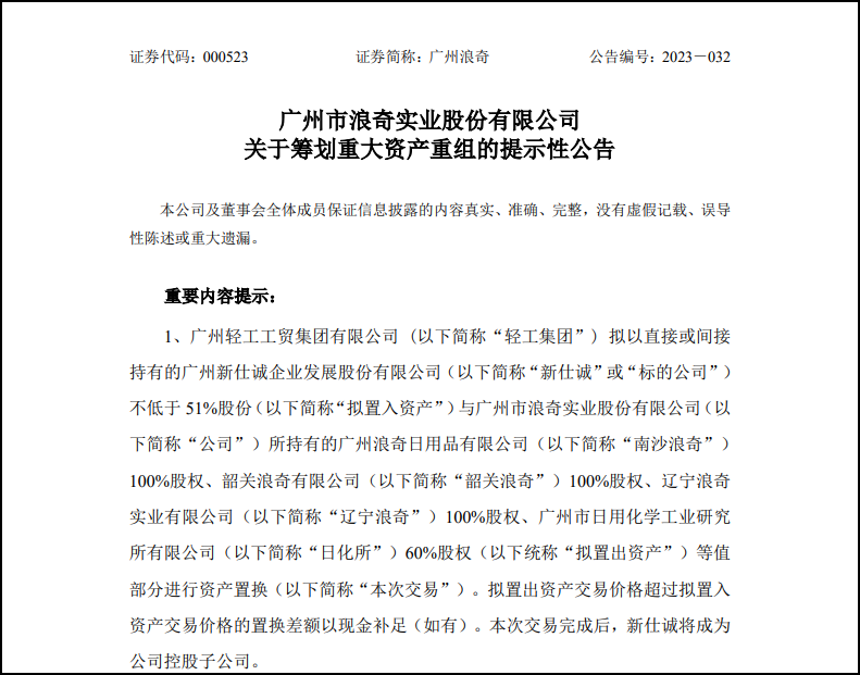 5月12日晚間廣州浪奇正籌劃與控股股東輕工集團(tuán)進(jìn)行重大資產(chǎn)置換,主要業(yè)務(wù)將轉(zhuǎn)變?yōu)槭称芳拔幕瘎?chuàng)意產(chǎn)業(yè)園區(qū)開發(fā)和運(yùn)營,不再經(jīng)營日化業(yè)務(wù)。 5月13日,廣州浪奇發(fā)布公告顯示,控股股東廣州輕工集團(tuán)擬以直接或間接持有的廣州新仕誠企業(yè)發(fā)展股份有限公司(下稱“新仕誠”)不低于51%股份與上市公司所持有的南沙浪奇100%股權(quán)、韶關(guān)浪奇100%股權(quán)、遼寧浪奇100%股權(quán)、廣州市日用化學(xué)工業(yè)研究所有限公司60%股權(quán)等值部分進(jìn)行資產(chǎn)置換。交易擬置出資產(chǎn)交易價(jià)格超過擬置入資產(chǎn)交易價(jià)格的,置換差額以現(xiàn)金補(bǔ)足(如有)。 本次交易完成后,新仕誠成為廣州浪奇的控股子公司。公告稱,本次交易構(gòu)成關(guān)聯(lián)交易,根據(jù)初步測算,構(gòu)成重大資產(chǎn)重組。本次交易不涉及公司發(fā)行股份,也不會(huì)導(dǎo)致公司控制權(quán)變更。不過,本次交易尚處于初步籌劃階段,目前交易雙方尚未簽署任何協(xié)議,交易方案、交易價(jià)格、業(yè)績承諾等核心要素仍需進(jìn)一步論證和協(xié)商。 |