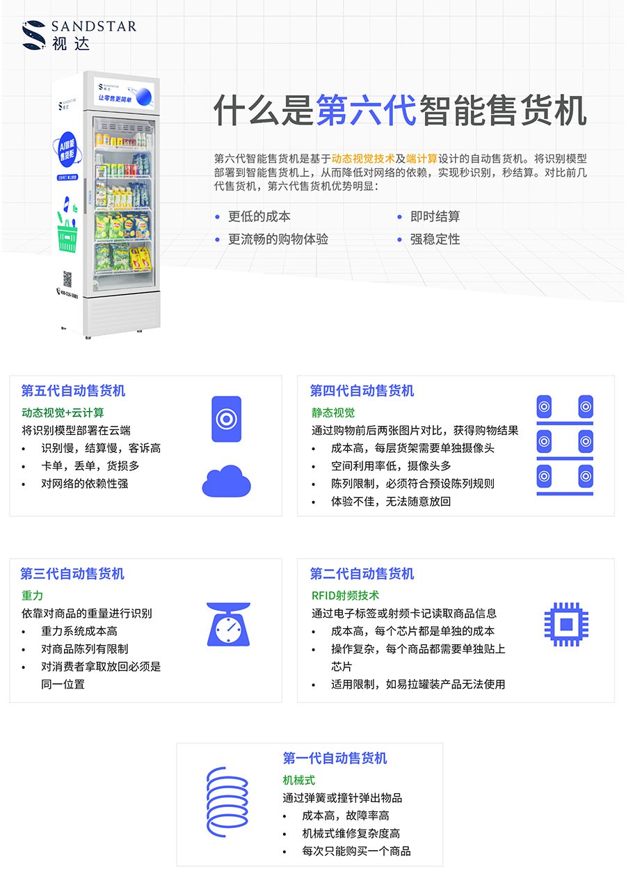 創(chuàng)新在即,第六代售貨機榮耀登場 5月15-17日,2023亞洲自助售貨及智慧零售博覽交易會在廣州隆重舉辦。SandStar視達攜第六代智能售貨機全系產(chǎn)品亮相,基于第六代動態(tài)視覺+端計算技術(shù)的冷藏柜、冷凍柜、雙開門貨柜一經(jīng)亮相備受關注,現(xiàn)場售賣的預制菜、冰淇淋……也吸引了大批觀展游客駐足體驗。 亞洲自助售貨及智慧零售博覽交易會,作為行業(yè)的風向標已成功舉辦九屆,是行業(yè)具有高度影響力的供需對接全生態(tài)B2B平臺,也是一年一度自助售貨及商業(yè)設施屆全方位、多維度交流與合作的橋梁與紐帶。 此次,SandStar視達攜第六代智能售貨機整機和套件兩種產(chǎn)品形態(tài)亮相展會,通過應用于冷藏柜、冷凍柜、雙開門貨柜等環(huán)境,售賣豐富的商品類型,其技術(shù)高度適配和兼容能力得到了有效的驗證。 SandStar視達第六代智能售貨機基于動態(tài)視覺及端計算的設計,將識別模型部署在本地,降低對網(wǎng)絡的依賴,實現(xiàn)秒識別,秒結(jié)算。相比升級前成本更低,系統(tǒng)更穩(wěn)定,體驗更流暢。 - 第一代:機械式,通過彈簧或撞針彈出商品; - 第二代:RFID技術(shù),通過電子標簽/射頻卡讀取商品信息; - 第三代:重力感應,依靠商品重量進行識別; - 第四代:靜態(tài)視覺,通過購買前后商品圖片對比,獲得購物結(jié)果; - 第五代:動態(tài)視覺+云計算時代:將識別模型部署在云端。 SandStar視達第六代智能售貨機在算法、硬件、軟件方面的均取得不同程度的突破: 算法:自研算法可有效識別外觀相似度達95%以上的商品; 硬件:6NM計算核心+自動駕駛相機方案,識別精度和運算速度加成; 軟件:用戶交互和商家運營系統(tǒng)更簡單、更智能。 “動態(tài)視覺+端計算”的設計提高了商品識別與追蹤的效率與精度,這也使得新一代產(chǎn)品更有能力被應用于冷凍柜及雙門智能柜等復雜場景。 智能冷凍柜:在冷凍柜場景中,采用攝像頭加熱功能,避免起霧凝霜,保證識別率。智能溫控根據(jù)售賣商品設定最佳溫度,保證食物口感,減少貨損。 雙門智能柜:結(jié)構(gòu)尺寸加大可容納和識別更多的商品,雙倍的容量,一個計算核心連接四個攝像頭,大大降低了硬件成本。 與此同時,通過對預制菜、冰淇淋等的售賣……迎合了當下消費升級、模式轉(zhuǎn)變和季節(jié)性熱銷品的銷售趨勢,契合了消費者對更加新鮮與營養(yǎng)的需求。使得第六代智能售貨機有能力快速打開豐富多元的商品類別及消費場景。 值得一提的是,SandStar視達研發(fā)的ChatVMS已率先在歐美上線,生成式交互方案,僅通過與聊天機器人對話即可獲得所需商品信息、數(shù)據(jù)報告甚至獲得決策建議,在之前的NAMA展上一經(jīng)推出備受矚目。 在SandStar視達的技術(shù)不斷革新,新產(chǎn)品不斷推陳出新的驅(qū)動下,第六代智能售貨機必將滲透更廣泛的應用場景,為消費者帶來前所未有的高效便捷購物體驗,加速實現(xiàn)人工智能在零售業(yè)的深度應用。 |