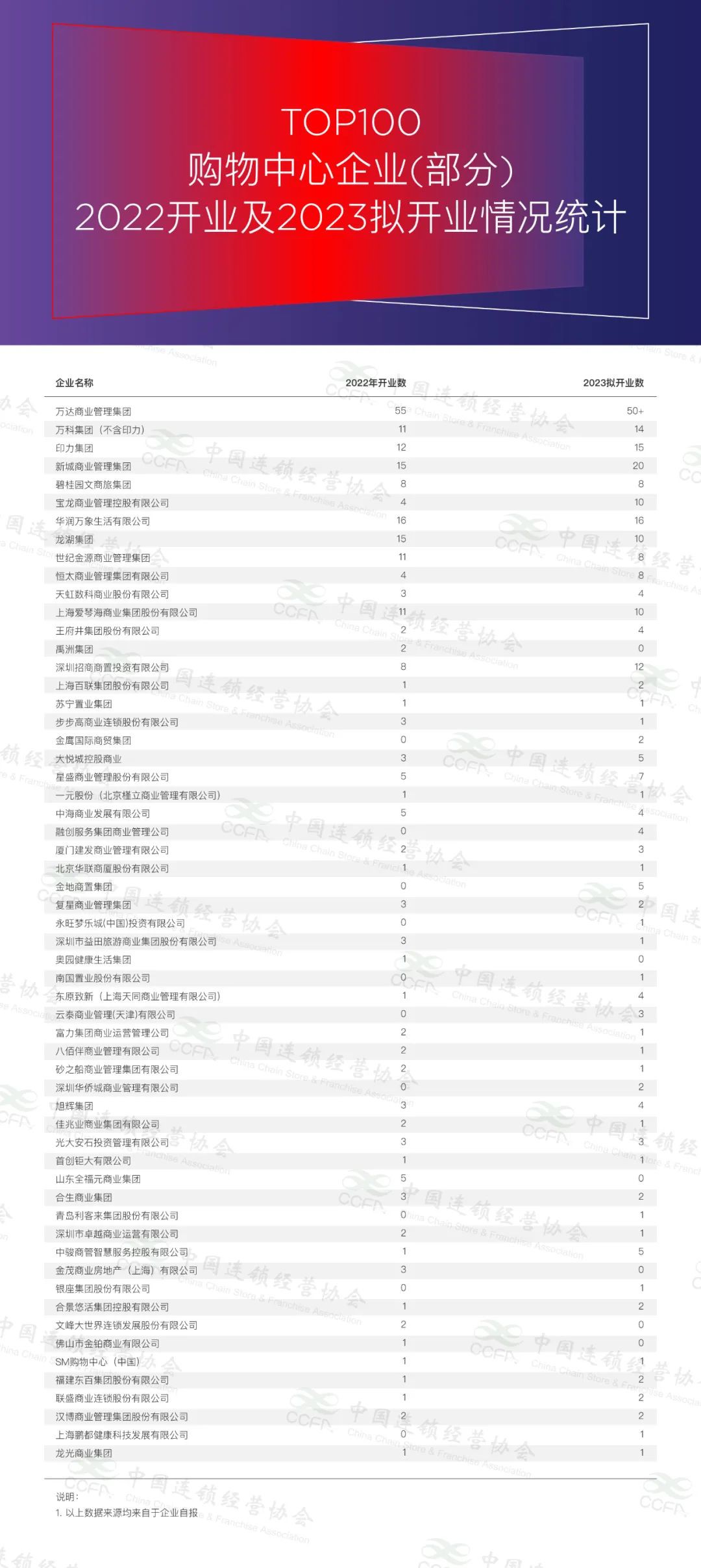 5月18日,中國連鎖經(jīng)營協(xié)會(CCFA)發(fā)布了2022中國購物中心企業(yè)TOP100公示。 從榜單中看出, 企業(yè)已運(yùn)營的購物中心和總建筑面積是兩個衡量維度。 榜單顯示,萬達(dá)集團(tuán)以473個在營購物中心數(shù)量、6556萬平方米的總建筑面積位列榜首。其次是萬科(不含印力)以及印力集團(tuán)。 TOP10還有新城控股、碧桂園文商旅、寶龍商業(yè)、華潤萬象生活、龍湖集團(tuán)、世紀(jì)金源和恒太商業(yè)。 同時還發(fā)布了,2022開業(yè)及2023擬開業(yè)情況統(tǒng)計(jì)。 榜單顯示,萬達(dá)集團(tuán)2022開業(yè)55家,2023將開業(yè)50+;萬科集團(tuán)2022開業(yè)11家,2023將開業(yè)14家... |
