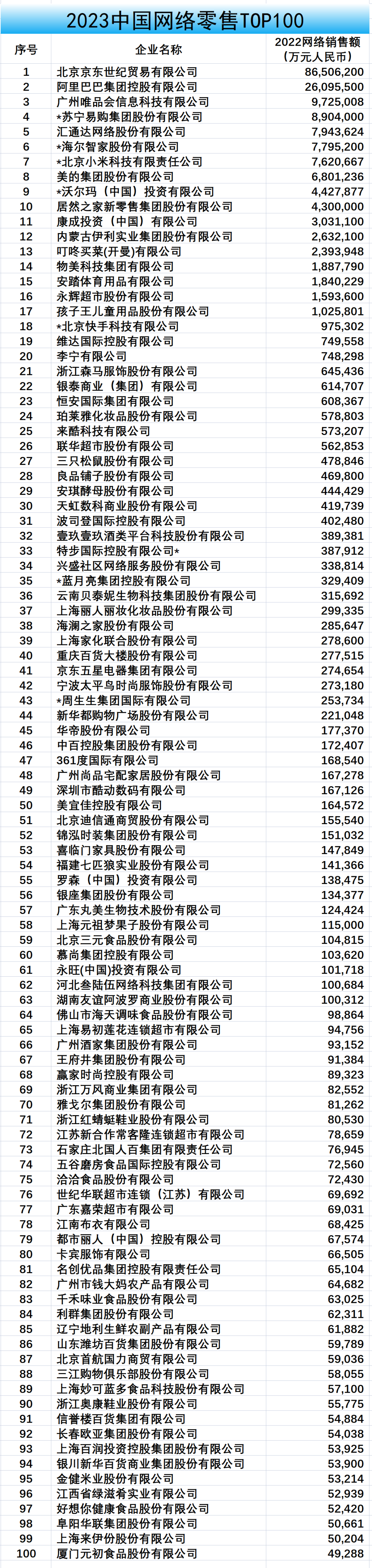 近日,中國連鎖經營協(xié)會發(fā)布《2023年網絡零售TOP100公示》。 公示顯示,京東、阿里巴巴、唯品會、蘇寧易購、匯通達依次排名前五,高鑫零售(大潤發(fā))、沃爾瑪、物美集團、永輝超市等傳統(tǒng)零售超市企業(yè)亦躋身TOP20。 |