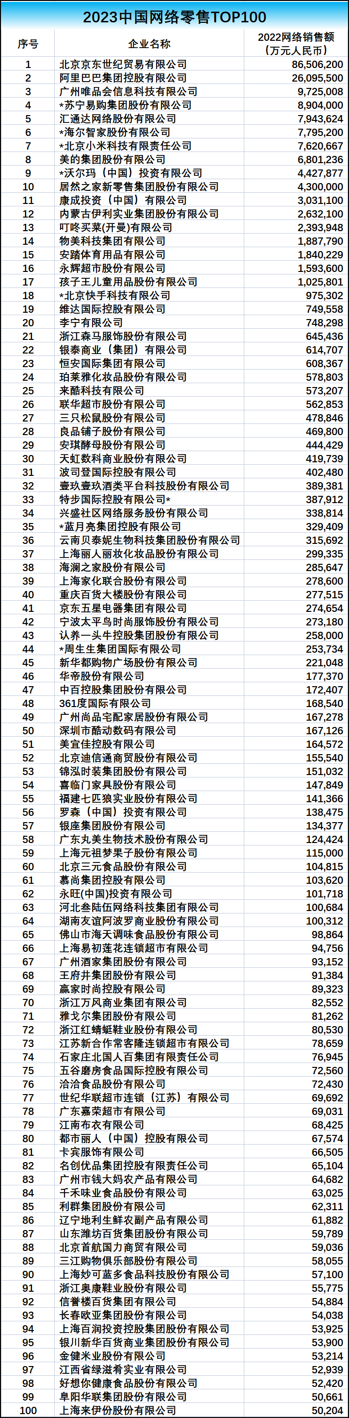 5月25日,中國連鎖經(jīng)營協(xié)會(huì)聯(lián)合德勤發(fā)布2023中國網(wǎng)絡(luò)零售Top 100榜單。 榜單顯示,京東、阿里、唯品會(huì)位居前三名;沃爾瑪、高鑫零售(大潤發(fā))、叮咚買菜、物美、永輝超市紛紛擠進(jìn)20強(qiáng)。 本次企業(yè)總銷售額超2萬億元,同比增長13.19%;其中,來自前20強(qiáng)企業(yè)的網(wǎng)絡(luò)銷售額占比超過九成,top100企業(yè)的網(wǎng)絡(luò)銷售額門檻上漲到了5億。 從企業(yè)類型來看,消費(fèi)品企業(yè)達(dá)50家,占top100網(wǎng)絡(luò)銷售比重為18.6%;非電商零售企業(yè)43家,銷售占比15%。 從地域來看,華東地區(qū)以47家企業(yè)數(shù)量領(lǐng)先全國,網(wǎng)絡(luò)銷售額占比達(dá)33.6%;華北地區(qū)企業(yè)占網(wǎng)絡(luò)銷售額的比重最高,達(dá)52.8%。值得一提的是,2023年新進(jìn)入榜單的企業(yè)大部分為零售新業(yè)態(tài)新模式類型的企業(yè)。 2023年是消費(fèi)提振年,我們相信未來隨著數(shù)字經(jīng)濟(jì)與實(shí)體經(jīng)濟(jì)的深度融合,線上消費(fèi)需求進(jìn)一步恢復(fù)和增長,網(wǎng)絡(luò)零售將進(jìn)一步推動(dòng)消費(fèi)復(fù)蘇。 |