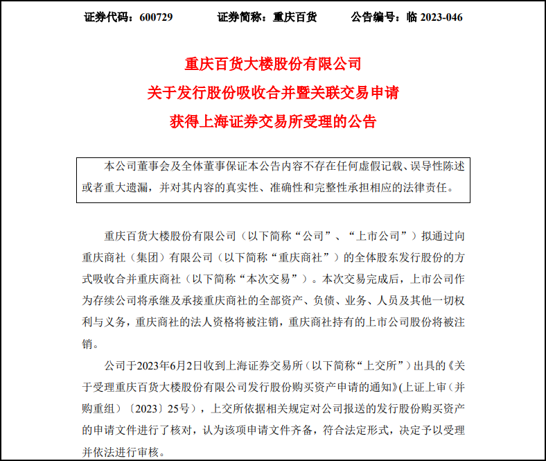 6月5日,重慶百貨大樓股份有限公司發(fā)布關(guān)于發(fā)行股份吸收合并暨關(guān)聯(lián)交易申請獲得上海證券交易所受理的公告。 據(jù)悉,重慶百貨擬通過向重慶商社的全體股東發(fā)行股份的方式吸收合并重慶商社,目前上交所依據(jù)相關(guān)規(guī)定對重慶百貨報送的發(fā)行股份購買資產(chǎn)的申請文件進(jìn)行了核對,認(rèn)為該項申請文件齊備,符合法定形式,決定予以受理并依法進(jìn)行審核。 |
