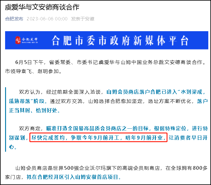 6月6日消息,據(jù)合肥發(fā)布,6月5日,安徽省委常委、合肥市委書記虞愛華與山姆中國(guó)業(yè)務(wù)總裁文安德商談合作。 雙方認(rèn)為,經(jīng)過前期全面深入洽談,山姆會(huì)員商店落戶合肥已進(jìn)入“水到渠成,瓜熟蒂落”階段。通過雙方交流,山姆選擇合肥愈加堅(jiān)定,選址方案不斷優(yōu)化,落戶正當(dāng)其時(shí)、恰到好處。 雙方商定,瞄準(zhǔn)打造全國(guó)最高品質(zhì)會(huì)員商店之一的目標(biāo),根據(jù)特殊定位,進(jìn)行特別謀劃,盡快完成簽約,爭(zhēng)取今年9月前開工,明年9月前開業(yè),讓消費(fèi)者早日開心!堵殬I(yè)零售網(wǎng)》認(rèn)為,這也意味著,山姆會(huì)員店安徽首店正式落子合肥。 資料顯示,山姆會(huì)員商店是世界500強(qiáng)企業(yè)沃爾瑪旗下的高端會(huì)員制商店,在全球擁有800多家門店,中國(guó)第一家山姆于1996年8月12日落戶深圳。截至2022年12月底,山姆會(huì)員店在中國(guó)的門店數(shù)量達(dá)到42家,覆蓋25個(gè)城市,會(huì)員數(shù)量突破400萬人。 據(jù)《職業(yè)零售網(wǎng)》獲悉,隨著5月份上海真如店、福州倉(cāng)山店的開業(yè),山姆會(huì)員店全國(guó)門店已超過44家,按著今年規(guī)劃預(yù)計(jì)還將新開4家門店,屆時(shí)將達(dá)到48家門店。此次山姆會(huì)員店引入的山姆安徽首店項(xiàng)目將在合肥經(jīng)開區(qū)落地。 |