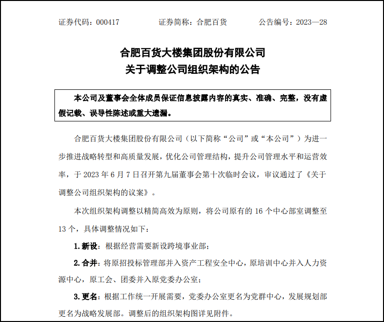 6月7日,合肥百貨大樓集團(tuán)股份有限公司發(fā)布公告稱,為進(jìn)一步推進(jìn)戰(zhàn)略轉(zhuǎn)型和高質(zhì)量發(fā)展,優(yōu)化公司管理結(jié)構(gòu),將公司原有的16個(gè)中心部室調(diào)整至13個(gè)。 其中,根據(jù)經(jīng)營(yíng)需要新設(shè)跨境事業(yè)部;將原招投標(biāo)管理部并入資產(chǎn)工程安全中心,原培訓(xùn)中心并入人力資源中心,原工會(huì)、團(tuán)委并入原黨委辦公室;根據(jù)工作統(tǒng)一開展需要,黨委辦公室更名為黨群中心,發(fā)展規(guī)劃部更名為戰(zhàn)略發(fā)展部。 合肥百貨表示,本次組織架構(gòu)調(diào)整進(jìn)一步強(qiáng)化了公司的管控職能,并對(duì)現(xiàn)有總部職能與經(jīng)營(yíng)的業(yè)務(wù)鏈條再次進(jìn)行了合理規(guī)劃和完善,滿足公司未來戰(zhàn)略布局的組織架構(gòu)需要,不會(huì)對(duì)公司生產(chǎn)經(jīng)營(yíng)活動(dòng)產(chǎn)生重大影響。 |
