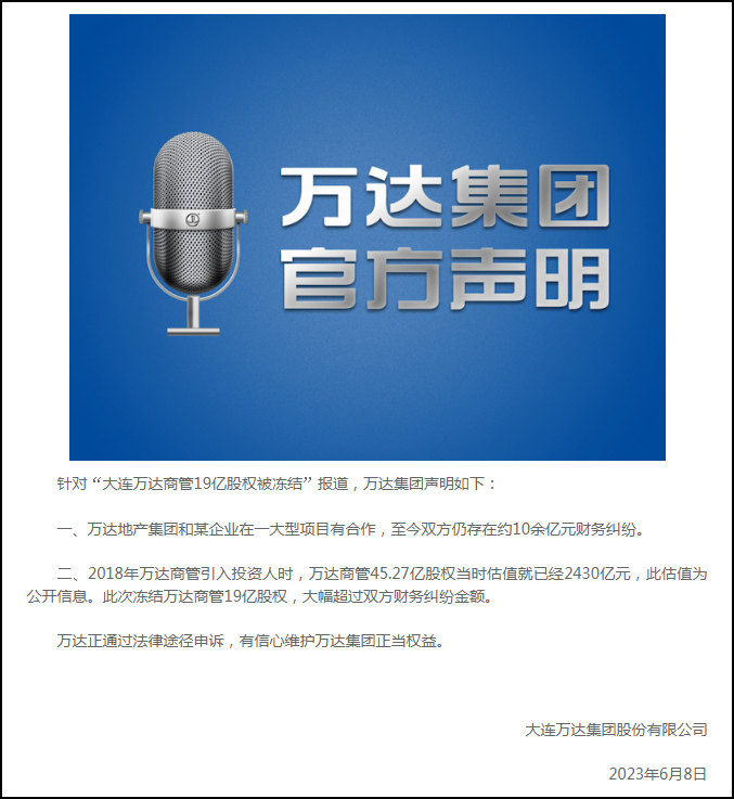 天眼查App顯示,近日,大連萬達集團股份有限公司新增2則股權凍結信息,被執(zhí)行企業(yè)均為大連萬達商業(yè)管理集團股份有限公司,被凍結股權數(shù)額合計約19.8億元,凍結期限自2023年6月5日至2026年6月4日。 6月8日,大連萬達集團針對“大連萬達商管19億股權被凍結”一事,做出了以下聲明。 聲明顯示,其一,萬達地產(chǎn)集團和某企業(yè)在長春一大型項目有合作,至今雙方仍存在10余億元財務糾紛。 其二,2018年萬達商管引入投資人時,萬達商管45.27億股權當時估值就是2430億元,此估值為公開信息。此次凍結萬達商管19億股權,大幅超過雙方財務糾紛金額。 同時,萬達集團表示,該公司正通過法律途徑申訴,有信心維護萬達集團正當權益。 其實就在前不久,市場突然傳出諸多萬達的“負面消息”,比如傳言“萬達需提前歸還13億美元債務”“萬達商管業(yè)績造假”“業(yè)績虧空400億將被收購”“萬達擬出售20個商業(yè)項目”等。 盡管隨后發(fā)布了關于市場傳聞的說明公告,評級機構還是信心不足。6月5日,標普將大連萬達商業(yè)管理集團股份有限公司長期發(fā)行人信用評級由“BB+”下調至“BB”。同時,將萬達商業(yè)地產(chǎn)(香港)有限公司的長期發(fā)行人信用評級以及由萬達香港提供擔保的高級無抵押票據(jù)的長期發(fā)行評級由“BB”下調至“BB-”。所有評級維持在負面評級觀察名單。 標普表示,主要原因是“母公司流動性減弱”。一是由于珠海萬達商管IPO延期,萬達集團融資渠道不斷收窄,風險增大。二是萬達商業(yè)的姊妹公司萬達地產(chǎn)的房地產(chǎn)銷售低于預期,使該集團的情況進一步惡化。 公開資料顯示,萬達集團創(chuàng)立于1988年,已發(fā)展成為以現(xiàn)代服務業(yè)為主的大型企業(yè)集團,旗下包括商管集團、文化集團、投資集團,其中商業(yè)中心、影視、體育、兒童產(chǎn)業(yè)等處于世界行業(yè)領先地位。萬達商管是集團旗下最核心的資產(chǎn)之一,負責萬達旗下470多座萬達廣場和130余家酒店的運營和管理。 據(jù)了解,萬達商管曾于2021年10月21日、2022年4月22日、2022年10月25日先后三次遞表港交所。2023年4月25日,港交所披露的信息顯示,萬達商管招股書第三次顯示失效。萬達集團內部層在4月21日召開了高管會議,萬達集團董事長王健林坦承,珠海萬達商管IPO目前遇到了階段性困難,并表示萬達絕不會躺平、更不會破產(chǎn)。 |