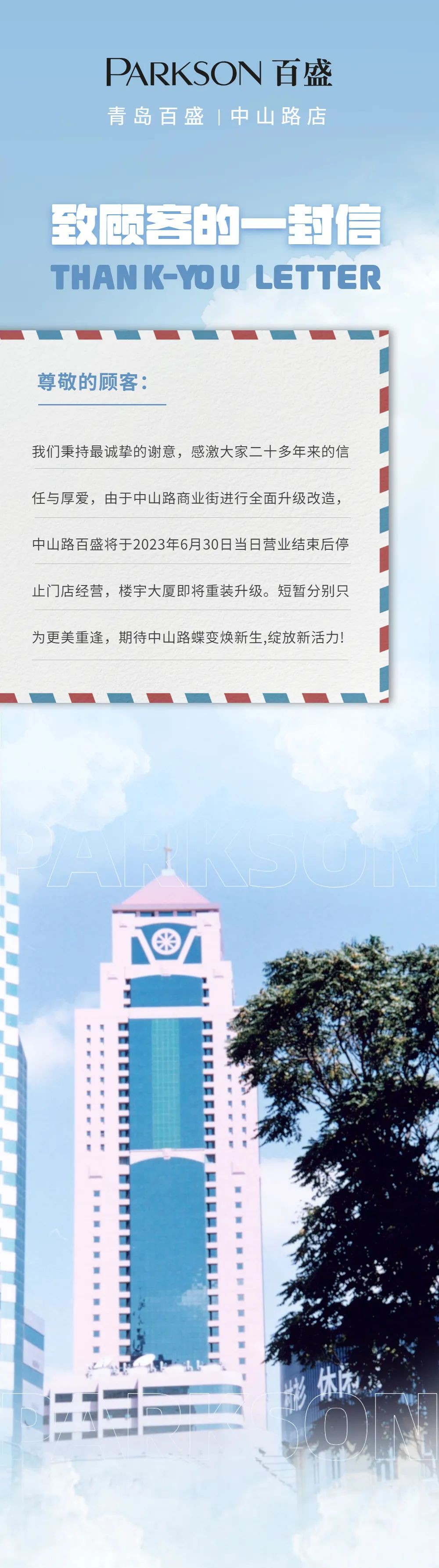 6月16日晚,據(jù)青島百盛中山路店官微消息,由于中山路商業(yè)街進行全面升級改造,中山路百盛將于2023年6月30日當日營業(yè)結(jié)束后停止門店經(jīng)營,樓宇大廈即將重裝升級。 早在今年1月,青島市自然資源和規(guī)劃局發(fā)布了《百盛購物中心裙樓改造提升項目批前公示》。公示內(nèi)容顯示,中山路百盛購物中心建成于2000年10月,原有外立面設(shè)計較為單調(diào)、封閉,已不能適應(yīng)目前新型商業(yè)形態(tài)的經(jīng)營需求,將對百盛購物中心1-11層原有建筑外立面進行改造更新,結(jié)合歷史文化街區(qū)記憶元素,將外立面局部打開,增加通透性,為商業(yè)新功能提供載體,為歷史城區(qū)保護更新注入新活力。 此外,據(jù)百盛集團2023年第一季度財報數(shù)據(jù)顯示,期內(nèi)百盛實現(xiàn)經(jīng)營收益總額為11.06億元,同比下降1.0%;錄得銷售所得款項總額(含增值稅)28.77億元,同比減少0.6%;公司所有人應(yīng)占利潤1989.6萬元,去年同期則虧損3008.3萬元。 |