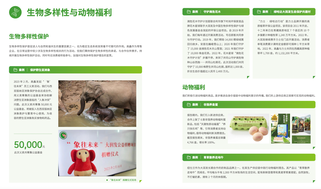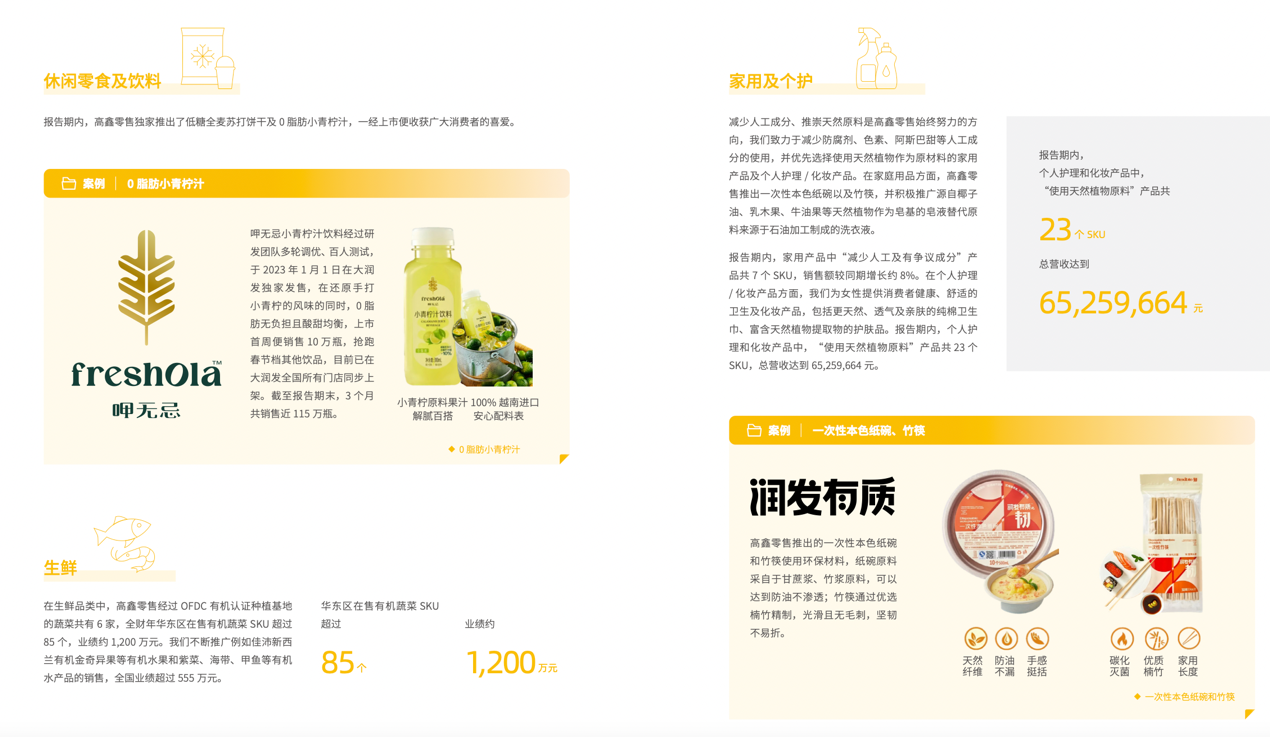 6月29日晚,高鑫零售發(fā)布了2023財(cái)年ESG 報(bào)告:高鑫共減碳約23.5萬(wàn)噸,其中清潔能源貢獻(xiàn)了約5萬(wàn)噸,并在不同治理版塊增加了減碳新舉措。 報(bào)告由“責(zé)任篤行、永續(xù)經(jīng)營(yíng)”和“環(huán)保運(yùn)營(yíng),綠色發(fā)展”等6個(gè)主題,以及“企業(yè)治理”“食品質(zhì)量與安全”“堅(jiān)持可持續(xù)采購(gòu)”“社會(huì)公益”等17個(gè)議題構(gòu)成。 28日,標(biāo)普全球發(fā)布《可持續(xù)發(fā)展年鑒(中國(guó)版)2023》,高鑫零售從橫跨60個(gè)行業(yè)的1590家中國(guó)企業(yè)中勝出,根據(jù)標(biāo)普全球ESG評(píng)分獲得“行業(yè)最佳進(jìn)步企業(yè)”殊榮。在過(guò)去的24年里,標(biāo)普全球企業(yè)可持續(xù)發(fā)展評(píng)估已發(fā)展成為全球領(lǐng)先的企業(yè)可持續(xù)發(fā)展評(píng)估工具和數(shù)據(jù)庫(kù)。全球數(shù)千家主動(dòng)參與CSA的企業(yè)使標(biāo)普全球的ESG評(píng)分更具洞察力和全面性。 “過(guò)去的這一財(cái)年,高鑫零售持續(xù)踐行可持續(xù)發(fā)展理念,從環(huán)境、社會(huì)及管治三個(gè)方面穩(wěn)進(jìn)提升企業(yè)表現(xiàn)水平,努力夯實(shí)集團(tuán)ESG發(fā)展根基,為企業(yè)內(nèi)外部利益相關(guān)方輸出ESG 價(jià)值。”高鑫零售CEO 林小海說(shuō),“優(yōu)質(zhì)的產(chǎn)品及服務(wù)是我們對(duì)消費(fèi)者的重要承諾,食品質(zhì)量與安全是日常管理中的重中之重。高鑫致力于成為零售商超行業(yè)的綠色運(yùn)營(yíng)標(biāo)桿! 2023財(cái)年共減碳約23.5萬(wàn)噸,清潔能源貢獻(xiàn)約5萬(wàn)噸 高鑫零售設(shè)立了溫室氣體減排、能源使用效益、節(jié)約水資源以及廢棄物排放四個(gè)環(huán)境目標(biāo),來(lái)作為環(huán)境管理的重要行動(dòng)方向。 為在2030年,實(shí)現(xiàn)自身運(yùn)營(yíng)所需電力達(dá)到100%碳中和,以及自有車(chē)輛的汽油及柴油實(shí)現(xiàn)100%碳中和的目標(biāo),高鑫開(kāi)展了門(mén)店節(jié)能措施,增加光伏發(fā)電比例,購(gòu)買(mǎi)綠電或綠證,初步嘗試以新能源車(chē)輛替代傳統(tǒng)燃油車(chē)輛方式,降低車(chē)輛行駛所使用的汽油及柴油量。 在本財(cái)年,高鑫共減碳約23.5萬(wàn)噸。從今年1月起,高鑫已在浙江省、江蘇省和廣東省采購(gòu)清潔電力近8400萬(wàn)度,實(shí)現(xiàn)減碳約5萬(wàn)噸。同時(shí),高鑫也持續(xù)擴(kuò)大可再生能源(如太陽(yáng)能)的使用范圍,報(bào)告期內(nèi)已有22家門(mén)店完成光伏屋頂建設(shè),發(fā)電量超過(guò)1300萬(wàn)度。首個(gè)物流中心蘇州倉(cāng)第一期光伏建設(shè)也已竣工,光伏面積達(dá)1.5萬(wàn)平方米。 高鑫通過(guò)開(kāi)展運(yùn)營(yíng)節(jié)能舉措,對(duì)所有門(mén)店蔬菜柜及蛋品柜進(jìn)行了調(diào)整,根據(jù)商品保存溫度進(jìn)行細(xì)化設(shè)置,全年約節(jié)電100萬(wàn)度。70%門(mén)店的樓梯間已經(jīng)安裝感應(yīng)燈,全年可減少用電約200萬(wàn)度。 此外,高鑫減少溫室氣體排放的舉措包括用環(huán)保制冷劑替換傳統(tǒng)制冷劑,在部分城市的外包車(chē)隊(duì)中采用新能源貨車(chē)運(yùn)輸,逐漸增加新能源貨車(chē)的數(shù)量及運(yùn)輸區(qū)域等。 為了節(jié)約水資源,高鑫在純水設(shè)備上通過(guò)安裝廢水儲(chǔ)存、廢水循環(huán)系統(tǒng),將純水系統(tǒng)產(chǎn)生的廢水送達(dá)指定清潔用水點(diǎn),作為清潔用水重新使用。在廢棄物管理上,高鑫首次披露了廚余垃圾減少目標(biāo),要在2024財(cái)年比2023財(cái)年降低3%的目標(biāo);開(kāi)展紙板箱再銷(xiāo)售方式,實(shí)現(xiàn)紙板箱的100%回收;持續(xù)推進(jìn)門(mén)店垃圾分類(lèi)工作,已在35個(gè)城市中的 156 家門(mén)店實(shí)行垃圾分類(lèi)。 提供優(yōu)質(zhì)食品,優(yōu)化購(gòu)物體驗(yàn) 民以食為天,食以安為先。高鑫零售堅(jiān)持為消費(fèi)者提供營(yíng)養(yǎng)健康的食品和產(chǎn)品,不斷優(yōu)化客戶服務(wù)體驗(yàn)。 為進(jìn)一步規(guī)范生鮮產(chǎn)品的采購(gòu)、生鮮倉(cāng)和營(yíng)運(yùn)作業(yè),高鑫在生鮮產(chǎn)品管理制度與規(guī)范基礎(chǔ)上建立“生鮮產(chǎn)品標(biāo)準(zhǔn)卡”,規(guī)定采買(mǎi)、倉(cāng)收和店收標(biāo)準(zhǔn),按照固定比例進(jìn)行抽檢。此外,采取兩端采購(gòu)模式,分批從菜市場(chǎng)和蔬菜基地進(jìn)貨,嚴(yán)格把關(guān)供應(yīng)商的資質(zhì),確保所有蔬菜、水果等品類(lèi)可追溯到生產(chǎn)端。 高鑫堅(jiān)持可持續(xù)采購(gòu)。根據(jù)報(bào)告,高鑫零售旗下通過(guò)OFDC(環(huán)境保護(hù)部有機(jī)食品發(fā)展中心)有機(jī)認(rèn)證的種植基地有6家。華東區(qū)在售有機(jī)蔬菜SKU超過(guò)85個(gè),業(yè)績(jī)約1200萬(wàn)元,有機(jī)水果和水產(chǎn)品全國(guó)業(yè)績(jī)超過(guò)555萬(wàn)元。已實(shí)現(xiàn)可追溯至原產(chǎn)地的海產(chǎn)品和水產(chǎn)品總銷(xiāo)售額已占本集團(tuán)水產(chǎn)業(yè)績(jī)的3.9%;可追溯至原產(chǎn)地的牛肉商品,華東區(qū)達(dá)100%,其中國(guó)產(chǎn)牛肉占比達(dá)到70%。 高鑫也一貫堅(jiān)持優(yōu)質(zhì)產(chǎn)品采購(gòu)。報(bào)告期內(nèi),個(gè)人護(hù)理和化妝產(chǎn)品