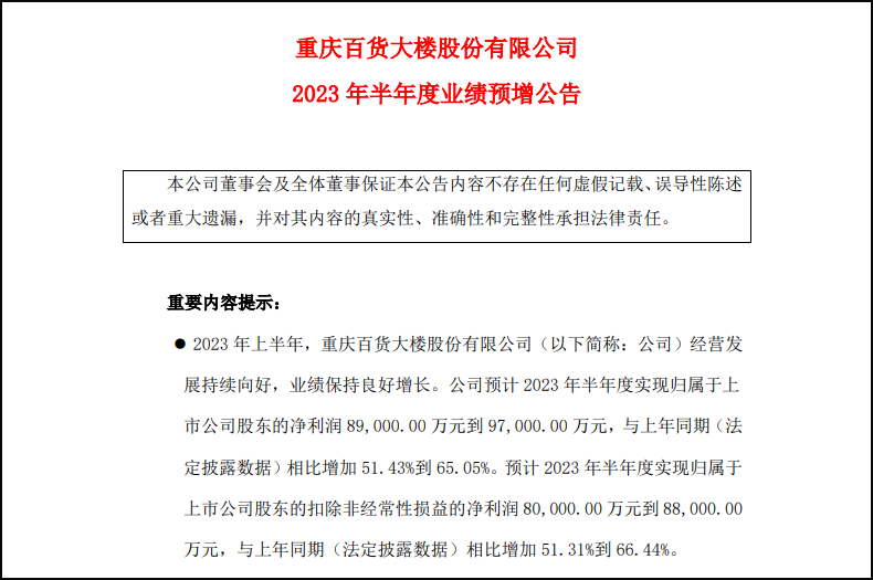 7月5日,重慶百貨發(fā)布2023年半年度業(yè)績預增公告。2023年上半年,重慶百貨大樓股份有限公司(以下簡稱:公司)經(jīng)營發(fā)展持續(xù)向好,業(yè)績保持良好增長。 公司預計2023年半年度實現(xiàn)歸屬于上 市公司股東的凈利潤89,000.00萬元到97,000.00萬元,與上年同期(法定披露數(shù)據(jù))相比增加51.43%到65.05%。預計2023年半年度實現(xiàn)歸屬于上市公司股東的扣除非經(jīng)常性損益的凈利潤80,000.00萬元到88,000.00萬元,與上年同期(法定披露數(shù)據(jù))相比增加51.31%到66.44%。 重慶百貨認為業(yè)績增長是因為:公司回歸商業(yè)本質,融合變革創(chuàng)新,積極探索打造本地生活生態(tài),不斷滿足消費者多元化、高品質的消費需求。同時,加快場店調改升級,推動商文旅融合,開展重百購物節(jié)、家電節(jié)、親友內購會、時尚潮購等特色消費活動,打造線下體驗、線上融合、企業(yè)團購、小店加盟、社區(qū)集市、員工分傭“六大賣場”,形成了重百大樓“時光塔”、世紀新都“生活美學院”等多元化消費新場景,零售主營業(yè)績穩(wěn)定增長。 二是公司持股31.06%的馬上消費金融股份有限公司不斷創(chuàng)新金融服務,滿足消費需求,經(jīng)營業(yè)績持續(xù)增長,進一步提升公司整體業(yè)績。 三是公司投資的重慶登康口腔護理用品股份有限公司于2023年4月10日在深圳證券交易所上市,按照《企業(yè)會計準則第39號—公允價值計量》要求,采取公允價值計量,為公司貢獻利潤較同期大幅增加。 |