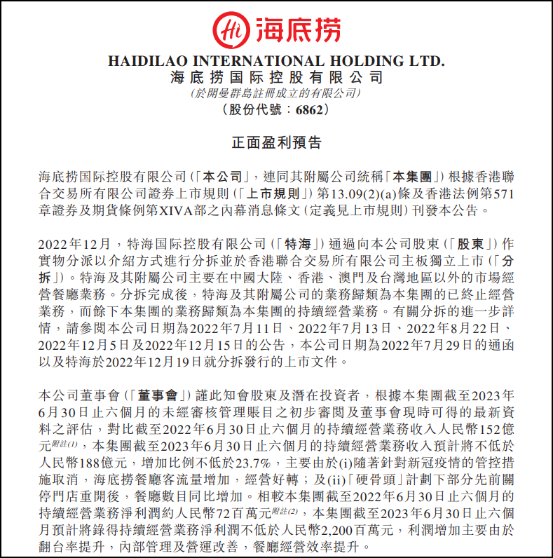 7月30日晚,海底撈(06862.HK)發(fā)布正面盈利預告,公布了2023年上半年的部分預計經(jīng)營數(shù)據(jù)。截至2023年6月30日,海底撈來自持續(xù)經(jīng)營業(yè)務的收入預計不少于188億元人民幣,較上年同期增幅超過23.7%;持續(xù)經(jīng)營業(yè)務凈利潤預計超22億元人民幣。 海底撈表示,收入增加主要由于疫情管控措施取消后,海底撈餐廳客流量增加,經(jīng)營好轉(zhuǎn),以及之前部分關停門店重新開放,餐廳數(shù)量同比增加。利潤增長主要由于翻臺率提升,內(nèi)部管理及營運改善,以及餐廳經(jīng)營效率的提升。 |
