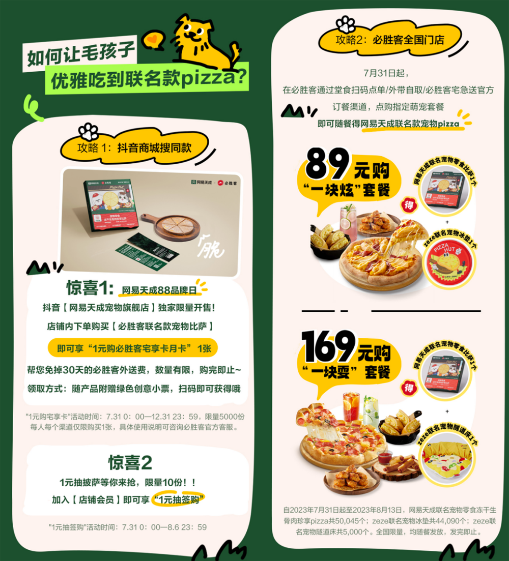 7月31日,網(wǎng)易嚴(yán)選專業(yè)寵物品牌網(wǎng)易天成,攜手西式快餐領(lǐng)導(dǎo)品牌必勝客共同推出“人寵同吃”萌寵套餐,套餐內(nèi)含有人食比薩和寵物零食比薩等產(chǎn)品,在必勝客全國3000多家門店(部分特定餐廳除外)及網(wǎng)易天成抖音官方旗艦店發(fā)售,并在北京、上海、深圳、杭州四城共同打造寵物友好主題店,創(chuàng)造人寵同吃、同玩的陪伴時(shí)刻,探索人寵生活新方式。 “它經(jīng)濟(jì)”火熱,網(wǎng)易天成攜必勝客推“人寵同吃”萌寵套餐 寵物經(jīng)濟(jì)快速發(fā)展,據(jù)艾媒咨詢數(shù)據(jù)顯示,2022年,中國寵物經(jīng)濟(jì)產(chǎn)業(yè)規(guī)模達(dá)到4936億元,預(yù)計(jì)2025年市場(chǎng)規(guī)模將達(dá)8114億元。隨著“它經(jīng)濟(jì)”持續(xù)升溫,人寵關(guān)系受到廣泛關(guān)注,“寵物友好”成為越來越多商業(yè)體、餐廳的新興消費(fèi)場(chǎng)景。 為攜帶寵物出門的消費(fèi)者提供就餐便利,也為打造全新都市養(yǎng)寵生活方式,塑造新型人寵友好關(guān)系。網(wǎng)易天成攜手必勝客,聚焦“人寵同吃”場(chǎng)景,推出人寵“一塊炫”和“一塊!眱煽蠲葘櫶撞汀 其中,適合全階段寵物食用的網(wǎng)易天成寵物零食“凍干生骨肉珍享比薩”,采用生骨肉均衡配比,甄選雞肉、鵪鶉、鱈魚等原料,特別添加乳鐵蛋白和雙重益生元助力腸胃消化,動(dòng)物性原料高達(dá)95%,粗蛋白質(zhì)含量超過AAFCO國際標(biāo)準(zhǔn)的2.1倍,被稱為“海陸空肉食盛宴”。 據(jù)悉,網(wǎng)易天成與必勝客“人寵同吃” 萌寵套餐,在必勝客全國3000多家門店(部分特定餐廳除外)發(fā)售,自7月31日至8月13日,通過堂食掃碼點(diǎn)單、外帶自取、必勝客宅急送等官方訂餐渠道,選購指定萌寵套餐,隨餐得寵物周邊實(shí)物禮品,數(shù)量有限,發(fā)完即止。此外,自7月31日至8月16日,聯(lián)名款寵物零食pizza在網(wǎng)易天成抖音官方旗艦店限量開售,隨單限量獲“1元購必勝客宅享卡月卡”福利。 多場(chǎng)景深化“寵物友好”理念,探索人寵生活新方式 網(wǎng)易天成與必勝客此次合作,還推出寵物友好主題店、PizzaPet喵其林比薩屋快閃店、非人類飯搭子大賞抖音挑戰(zhàn)賽等活動(dòng),從線上線下多場(chǎng)景深化“人寵同吃”的寵物友好理念,讓人與愛寵共食、共享、共歡樂,探索人寵生活新方式。 據(jù)悉,網(wǎng)易天成攜手必勝客在北京、上海、深圳、杭州等城市打造必勝客寵物友好主題店,提供寵物友好外擺專區(qū),并限量放送網(wǎng)易天成寵糧試吃福利。 圖片:必勝客寵物友好主題店(注:必勝客門店暫不提供寵物用餐盤) 8月11日至12日,網(wǎng)易天成聯(lián)合必勝客、抖音電商會(huì)員日共同打造的 “PizzaPet喵其林比薩屋”快閃活動(dòng),也將在杭州保利時(shí)光里限時(shí)營業(yè),活動(dòng)期間攜寵到現(xiàn)場(chǎng)可免費(fèi)領(lǐng)取寵糧試吃盒子、人寵飯搭子套餐等限量福利。 此外,網(wǎng)易天成在抖音發(fā)起“非人類飯搭子大賞”挑戰(zhàn)賽,引發(fā)養(yǎng)寵人群的情感共鳴。通過貼紙?zhí)匦аb扮貓咪和狗狗,可將寵物擬人化,隨機(jī)生成不同的“飯搭子穿搭”,打造人與寵物約會(huì)進(jìn)餐的場(chǎng)景。 “我們想借‘人寵同吃’的場(chǎng)景,打破人和寵物的壁壘,鼓勵(lì)人與寵共同享受治愈、溫暖的小確幸和儀式感!本W(wǎng)易天成相關(guān)負(fù)責(zé)人介紹道:“未來,我們還將從寵物吃、喝、玩、樂等不同生活場(chǎng)景,探索更多人寵生活新方式! 網(wǎng)易天成是網(wǎng)易嚴(yán)選專業(yè)寵物品牌,始終秉持“以天然成就天性”的品牌主張,獲中國農(nóng)業(yè)大學(xué)國家飼料工程技術(shù)研究中心支持,旨在為中國寵物提供健康、安心的天然寵糧。網(wǎng)易天成堅(jiān)持用純正的優(yōu)質(zhì)食材,煥發(fā)寵物更自然的原始天性。嚴(yán)格遵守“甄選好品質(zhì)、嚴(yán)選好食材、專業(yè)好食譜、加工好科技”的四大“好保證”,重塑好糧標(biāo)準(zhǔn)。 必勝客作為享譽(yù)全球的西式休閑餐飲領(lǐng)導(dǎo)品牌,自1990年在北京開出中國第一家餐廳以來,在中國快速發(fā)展,取得了令人矚目的成績(jī),截止2023年7月,必勝客在中國400 多個(gè)城市擁有3000多家必勝客休閑餐廳。必勝客以“比薩”聞名于世,每一個(gè)餅底都堅(jiān)持現(xiàn)點(diǎn)現(xiàn)做,堅(jiān)持產(chǎn)品為王,提供豐富、多樣的美味食物,滿足不同口味消費(fèi)者的需求,無論是經(jīng)典的比薩、意面、牛排,還是可口的小吃、甜點(diǎn)、飲料,都讓人回味無窮。 基于品牌精神的契合和對(duì)彼此產(chǎn)品品質(zhì)的認(rèn)可,網(wǎng)易天成與必勝客攜手合作,共同致力于打造更符合寵物友好理念的服務(wù)和產(chǎn)品。 |