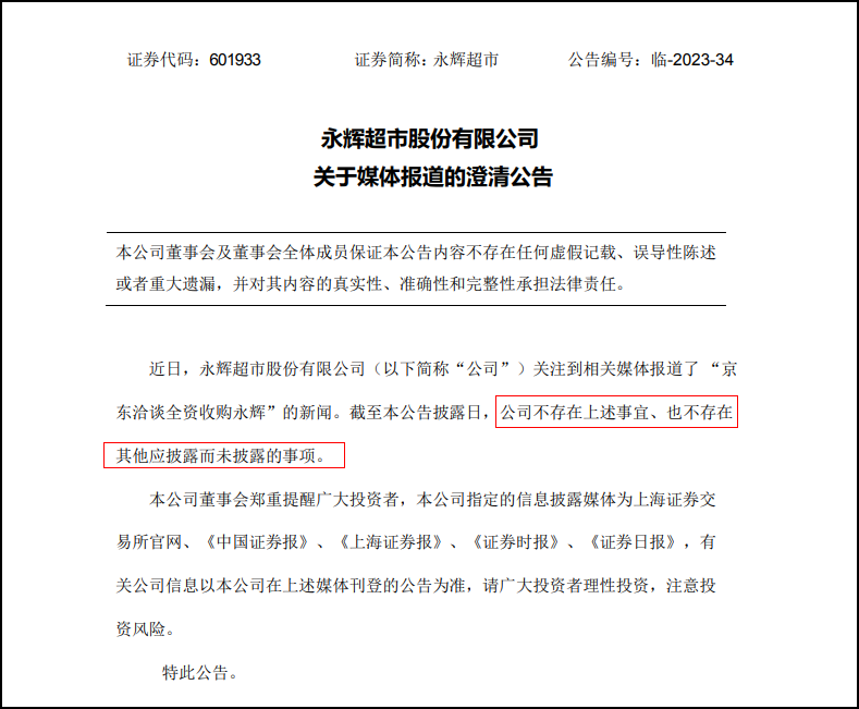 永輝超市澄清:媒體報道“京東洽談全資收購永輝”新聞不實