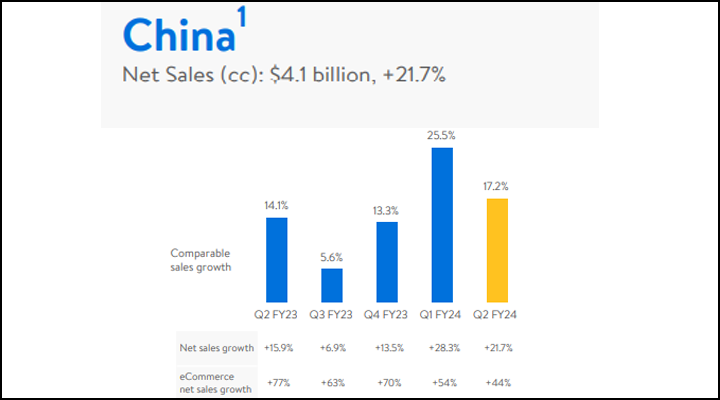 8月17日,沃爾瑪公司發(fā)布2024財(cái)年第二季度業(yè)績(jī)。財(cái)報(bào)顯示,公司總營(yíng)收為1616.3億美元(約為11772.46億元人民幣,下同),同比增長(zhǎng)5.7%;凈利潤(rùn)為78.91億美元(約為574.75億元),同比增長(zhǎng)53.3%;營(yíng)業(yè)利潤(rùn)為73億美元(約為531.70億元),同比增長(zhǎng)6.7%。其中,沃爾瑪美國(guó)業(yè)務(wù)凈銷售額為1109億美元,同比增長(zhǎng)5.4%;沃爾瑪國(guó)際業(yè)務(wù)凈銷售額為276億美元,同比增長(zhǎng)13.3%。 沃爾瑪在第二財(cái)季凈銷售額達(dá)1602.8億美元(約為11674.13億元),同比增長(zhǎng)5.9%;會(huì)員及其他收入為13.52億美元(約為98.47億元),同比降低8.5%。 此外,沃爾瑪中國(guó)Q2凈銷售額為41億美元(約為298.63億元人民幣),同比增長(zhǎng)21.7%,可比銷售額增長(zhǎng)17.2%,電商業(yè)務(wù)凈銷售額增長(zhǎng)44%。 整個(gè)季度山姆業(yè)態(tài)及電商業(yè)務(wù)持續(xù)表現(xiàn)強(qiáng)勁。山姆和沃爾瑪大賣場(chǎng)業(yè)態(tài)線上線下流量呈正向態(tài)勢(shì)。值得一提的是,在強(qiáng)勁的銷售增長(zhǎng)、高效的營(yíng)運(yùn)以及更高的山姆會(huì)員商店滲透率的驅(qū)動(dòng)下,Q2整體的營(yíng)運(yùn)費(fèi)率有所下降。 值得注意的是,沃爾瑪公司連續(xù)第二個(gè)季度提高了年度利潤(rùn)預(yù)期,此前美國(guó)消費(fèi)者在搶購(gòu)便宜貨方面導(dǎo)致了銷售增長(zhǎng)。得益于提貨和送貨的增長(zhǎng),電子商務(wù)業(yè)務(wù)增長(zhǎng)24%。 沃爾瑪首席財(cái)務(wù)官John David Rainey表示,食品收入繼續(xù)強(qiáng)勁增長(zhǎng),百貨業(yè)務(wù)強(qiáng)于公司在第二季度初的預(yù)期。這家零售商還受益于高收入客戶需求的增加。改善的預(yù)測(cè)突顯出沃爾瑪龐大的食品雜貨業(yè)務(wù)的彈性,這使該公司能夠在消費(fèi)者購(gòu)買非必需商品之前三思而后行的情況下獲得更多銷售額。 沃爾瑪預(yù)計(jì)第三季度銷售額將同比增長(zhǎng)3%,調(diào)整后每股收益在1.45美元至1.50美元之間,而市場(chǎng)預(yù)期為1.49美元。 |