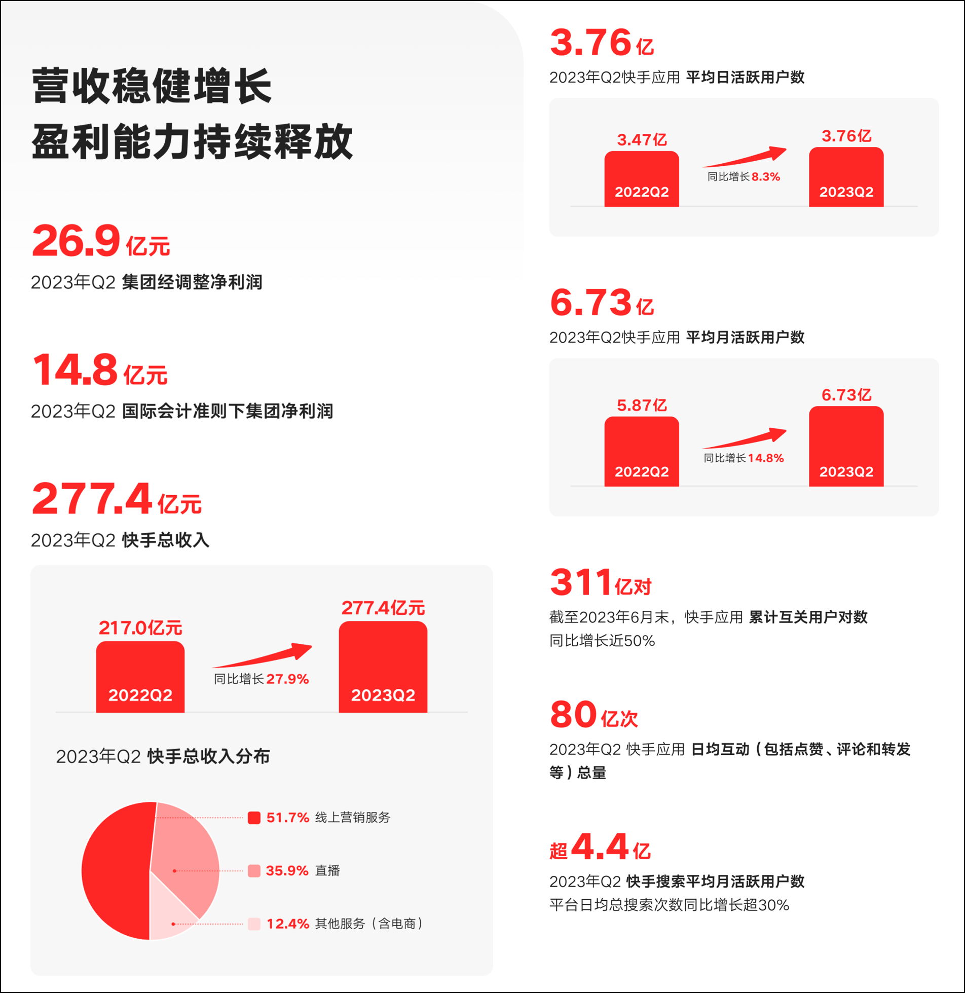 8月22日,快手公布了2023年第二季度財報數(shù)據(jù)顯示,二季度,快手營收 277.4 億元,同比增長 27.9%;調(diào)整后凈利潤 26.9 億元,同比扭虧,去年同期為凈虧損 13.1 億元;毛利為139.3億元,同比上升42.6%。 具體業(yè)務(wù)方面,根據(jù)財報披露數(shù)據(jù),二季度,快手在線營銷服務(wù)收入達(dá) 143.5億元,同比增長 30.4%,占總收入的比例達(dá)到 51.7%;直播收入為99.7億元,同比增長16.4%;其他服務(wù)收入達(dá)34.3億元,同比增長61.4%。值得一提的是,快手GMV(電商商品交易總額)已經(jīng)達(dá)到了2654.6億元,同比增長了38.9%。 用戶指標(biāo)方面,二季度,快手平均日活躍用戶為3.8億,去年同時期為3.5億;平均月活躍用戶為6.7億,而去年同期為5.9億,同比增長14.8%。此外,二季度快手應(yīng)用的每位日活躍用戶日均使用時長為 117.2 分鐘。 |