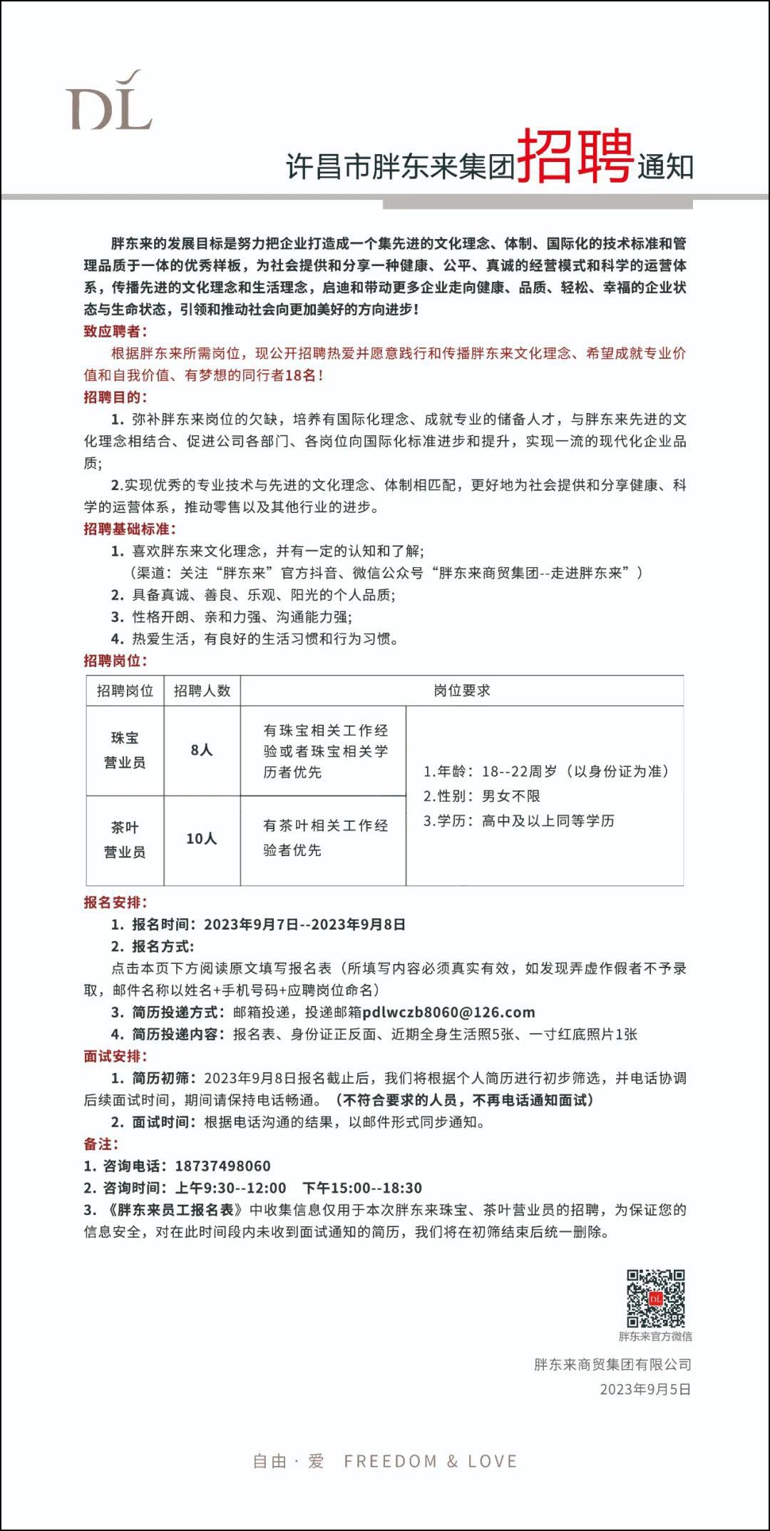 9月4日,胖東來商貿(mào)集團(tuán)在其官方公眾號(hào)上發(fā)布了《許昌市胖東來集團(tuán)招聘通知》,宣布正在招聘18名崗位人才。具體招聘的職位包括珠寶營業(yè)員8名和茶葉營業(yè)員10名。 具體招聘內(nèi)容如下: 胖東來的發(fā)展目標(biāo)是努力把企業(yè)打造成一個(gè)集先進(jìn)的文化理念、體制、國際化的技術(shù)標(biāo)準(zhǔn)和管理品質(zhì)于一體的優(yōu)秀樣板,為社會(huì)提供和分享一種健康、公平、真誠的經(jīng)營模式和科學(xué)的運(yùn)營體系,傳播先進(jìn)的文化理念和生活理念,啟迪和帶動(dòng)更多企業(yè)走向健康、品質(zhì)、輕松、幸福的企業(yè)狀態(tài)與生命狀態(tài),引領(lǐng)和推動(dòng)社會(huì)向更加美好的方向進(jìn)步! 致應(yīng)聘者: 根據(jù)胖東來所需崗位,現(xiàn)公開招聘熱愛并愿意踐行和傳播胖東來文化理念、希望成就專業(yè)價(jià)值和自我價(jià)值、有夢想的同行者18名! 招聘目的: 1、彌補(bǔ)胖東來崗位的欠缺,培養(yǎng)有國際化理念、成就專業(yè)的儲(chǔ)備人才,與胖東來先進(jìn)的文化理念相結(jié)合、促進(jìn)公司各部門、各崗位向國際化標(biāo)準(zhǔn)進(jìn)步和提升,實(shí)現(xiàn)一流的現(xiàn)代化企業(yè)品質(zhì); 2、實(shí)現(xiàn)優(yōu)秀的專業(yè)技術(shù)與先進(jìn)的文化理念、體制相匹配,更好地為社會(huì)提供和分享健康、科學(xué)的運(yùn)營體系,推動(dòng)零售以及其他行業(yè)的進(jìn)步。 招聘基礎(chǔ)標(biāo)準(zhǔn): 1、喜歡胖東來文化理念,并有一定的認(rèn)知和了解; (渠道:關(guān)注“胖東來”官方抖音、微信公眾號(hào)“胖東來商貿(mào)集團(tuán)--走進(jìn)胖東來”) 2、具備真誠、善良、樂觀、陽光的個(gè)人品質(zhì); 3、性格開朗、親和力強(qiáng)、溝通能力強(qiáng); 4、熱愛生活,有良好的生活習(xí)慣和行為習(xí)慣。 招聘崗位: 報(bào)名安排: 1.報(bào)名時(shí)間:2023年9月7日--2023年9月8日 2.報(bào)名方式: 點(diǎn)擊本頁下方閱讀原文填寫報(bào)名表(所填寫內(nèi)容必須真實(shí)有效,如發(fā)現(xiàn)弄虛作假者不予錄取,郵件名稱以姓名+手機(jī)號(hào)碼+應(yīng)聘崗位命名) 3.簡歷投遞方式:郵箱投遞,投遞郵箱pdlwczb8060@126.com 4.簡歷投遞內(nèi)容:報(bào)名表、身份證正反面、近期全身生活照5張、一寸紅底照片1張 面試安排: 1. 簡歷初篩:2023年9月8日?qǐng)?bào)名截止后,我們將根據(jù)個(gè)人簡歷進(jìn)行初步篩選,并電話協(xié)調(diào)后續(xù)面試時(shí)間,期間請(qǐng)保持電話暢通。(不符合要求的人員,不再電話通知面試) 2. 面試時(shí)間:根據(jù)電話溝通的結(jié)果,以郵件形式同步通知。 備注: 1. 咨詢電話:18737498060 2. 咨詢時(shí)間:上午9:30--12:00 下午15:00--18:30 3. 《胖東來員工報(bào)名表》中收集信息僅用于本次胖東來珠寶、茶葉營業(yè)員的招聘,為保證您的信息安全,對(duì)在此時(shí)間段內(nèi)未收到面試通知的簡歷,我們將在初篩結(jié)束后統(tǒng)一刪除。 胖東來商貿(mào)集團(tuán)有限公司 2023年9月5日 |