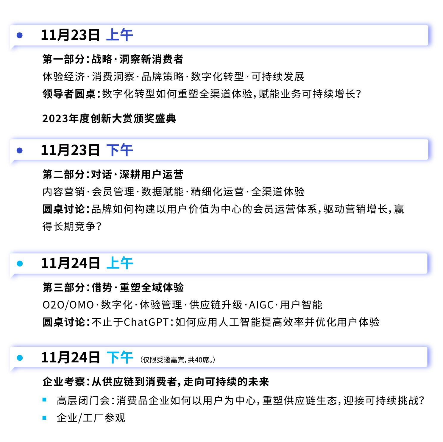 2023第十一屆消費(fèi)者體驗(yàn)創(chuàng)新大會(CX Innovation 2023)由CDMC決策者智庫和CRRI決策者零售研究院主辦,BCG波士頓咨詢公司提供智力支持,將于11月23-24日在蘇州舉行。組委會誠摯歡迎您的出席,并加入零售&消費(fèi)品行業(yè)社群!本屆峰會以“以人為本,科技賦能”為主題,期待與各位業(yè)內(nèi)專家共同展望未來消費(fèi),拓寬認(rèn)知視野,解讀新興趨勢,并探索體驗(yàn)創(chuàng)新增長之道。 2023年已過大半,在經(jīng)歷了三年疫情之后,消費(fèi)市場開始溫和復(fù)蘇,總體向好。與此同時,在存量競爭和經(jīng)濟(jì)下行的內(nèi)外部形勢下,消費(fèi)品牌的生長環(huán)境愈加復(fù)雜多元,市場結(jié)構(gòu)正在快速分化,量變驅(qū)動的紅利逐漸消弭,各行各業(yè)掀起新一輪洗牌浪潮,整個行業(yè)正面臨著巨大挑戰(zhàn)。不可否認(rèn)的是,消費(fèi)者心態(tài)和需求已然發(fā)生了無法扭轉(zhuǎn)的變化——理性與感性并重,實(shí)用與品質(zhì)兼需,個性與多元結(jié)合,品牌價值回歸到產(chǎn)品和服務(wù)本身。 盡管當(dāng)前消費(fèi)市場供過于求,新品類、新產(chǎn)品層出不窮,供給側(cè)產(chǎn)品卻不足以滿足用戶端更快速和精細(xì)化的需求更迭,兩者之間存在鴻溝。消費(fèi)企業(yè)如何迎接未來品牌爆發(fā)的十年,把握機(jī)會人群,借勢技術(shù)創(chuàng)新,提高增長質(zhì)量和能力,真正踐行“以消費(fèi)者為中心”的業(yè)務(wù)升級和企業(yè)轉(zhuǎn)型,打造產(chǎn)品、文化、商業(yè)三位一體的卓越品牌,是企業(yè)穿越周期、走向長期的核心議題。消費(fèi)者體驗(yàn)則融入了產(chǎn)品和服務(wù)、消費(fèi)者心智轉(zhuǎn)換、精細(xì)化運(yùn)營以及品牌和用戶的全渠道觸點(diǎn)中。 CX Innovation 2023將立足于消費(fèi)者體驗(yàn),審視零售和消費(fèi)品行業(yè)最新趨勢,聚焦人本價值和科技賦能,深入討論體驗(yàn)創(chuàng)新領(lǐng)域前沿話題,探索BANI時代變局下的發(fā)展之道,并為業(yè)界人士搭建學(xué)習(xí)、交流和社交的國際化、高端、專業(yè)平臺。屆時,450余位來自消費(fèi)品及零售品牌、電商、平臺、協(xié)會、科技公司、投資機(jī)構(gòu)、咨詢公司等機(jī)構(gòu)的業(yè)內(nèi)嘉賓將蒞臨此次盛會。 組委會期待與您相約蘇州,共赴CX Innovation 2023年終盛會! 核心議題 1、消費(fèi)升級OR消費(fèi)分級,如何解讀消費(fèi)市場的變與不變? 2、如何以消費(fèi)者體驗(yàn)為戰(zhàn)略錨點(diǎn),重塑品牌和消費(fèi)者之間的連接,建立深度對話? 3、面對多渠道、新場景,企業(yè)如何通過精細(xì)化運(yùn)營,推動全渠道業(yè)務(wù)增長并打造無縫體驗(yàn)? 4、數(shù)字浪潮下,企業(yè)如何重新定義消費(fèi)者旅程,推動業(yè)務(wù)升級? 5、AIGC如何賦能數(shù)字營銷,優(yōu)化消費(fèi)體驗(yàn)? 6、從供應(yīng)鏈到消費(fèi)者,企業(yè)如何真正以用戶為中心,落地可持續(xù)戰(zhàn)略? CX Innovation 2023日程框架 兩天峰會涵蓋3大主題論壇、年度創(chuàng)新大賞頒獎盛典、2場圓桌對話、1場企業(yè)考察、品牌體驗(yàn)劇場、先鋒科技路演等多項(xiàng)活動,以期為您創(chuàng)造多樣化且有價值的學(xué)習(xí)平臺與社交場合。 CX年度創(chuàng)新大賞頒獎盛典 CX年度創(chuàng)新大賞由決策者零售研究院發(fā)起,旨在表彰在零售及消費(fèi)品領(lǐng)域有著卓越表現(xiàn)和創(chuàng)新動力的團(tuán)隊(duì)和企業(yè),為行業(yè)發(fā)展樹立新的標(biāo)桿,技術(shù)創(chuàng)新提供優(yōu)質(zhì)案例,為商務(wù)合作引領(lǐng)新機(jī)遇。它是對在過去一年中銳意創(chuàng)新、積極實(shí)踐的團(tuán)隊(duì)和企業(yè)的鼓勵,有利于激發(fā)產(chǎn)業(yè)創(chuàng)新潛能,促進(jìn)行業(yè)的持續(xù)發(fā)展。 表彰先進(jìn),鼓勵新生,CX Innovation 2023期待與您分享成就,攜手未來! CX INNOVATION創(chuàng)想展區(qū) 品牌體驗(yàn)劇場: 消費(fèi)者的價值需求和體驗(yàn)感知越來越重要,除了實(shí)用功能,他們更為關(guān)注產(chǎn)品或服務(wù)所帶來的體驗(yàn)感,精神滿足感,乃至品牌文化等附加價值。CX Innovation 2023特設(shè)品牌體驗(yàn)劇場,誠邀來自食飲酒水、鞋服時尚、美妝日化、家居生活、寵物等品牌主參與體驗(yàn)劇場現(xiàn)場展示。僅限10席,詳情請咨詢組委會。 *參與品牌需滿足: 1)關(guān)注產(chǎn)品創(chuàng)新、消費(fèi)體驗(yàn)和可持續(xù)性; 2)設(shè)置現(xiàn)場體驗(yàn)、場景創(chuàng)新或品牌故事專區(qū),如酒水品牌設(shè)置品鑒環(huán)節(jié)。 先鋒科技路演: 遇見先鋒科技路演專區(qū)是CDMC決策者零售及消費(fèi)品系列會議的常規(guī)保留項(xiàng)目,旨在支持行業(yè)前沿技術(shù)的應(yīng)用發(fā)展。CX Innovation 2023誠邀來自數(shù)字化、AI、AR/VR等前沿科技創(chuàng)新領(lǐng)域的優(yōu)秀項(xiàng)目參與展示與現(xiàn)場互動,構(gòu)想未來創(chuàng)新,助力行業(yè)發(fā)展。企業(yè)可以獲得機(jī)會在11月23-24日的茶歇時段展示創(chuàng)新技術(shù)或解決方案。席位有限,有意從速。 新地點(diǎn)·新主題·新形式,消費(fèi)者體驗(yàn)主題NO. 1論壇,不可錯過!CX Innovation 2023期待您的加入! 詳情咨詢: 王欣雨 Rita 手機(jī):18019177420 郵箱:ritaw@cdmc.org.cn |