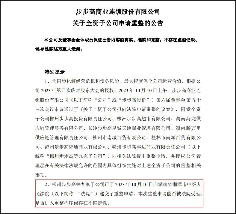 10月11日,步步高商業(yè)連鎖股份有限公司發(fā)布關(guān)于全資子公司申請(qǐng)重整的公告。 為同步化解經(jīng)營(yíng)危機(jī)和債務(wù)風(fēng)險(xiǎn),郴州步步高等九家子公司已于2023年10月10日向湖南省湘潭市中級(jí)人民法院遞交了重整申請(qǐng),本次重整申請(qǐng)能否被法院受理,是否進(jìn)入重整程序尚存在不確定性。 步步高表示,如郴州步步高等九家子公司能夠?qū)嵤┲卣⒑筒讲礁吖煞輩f(xié)同重整,統(tǒng)籌利用償債資源對(duì)債務(wù)進(jìn)行重組,并通過(guò)引入投資人注入增量資源等方式盤活資產(chǎn),改善經(jīng)營(yíng)狀況,可以最大限度保全公司核心運(yùn)營(yíng)價(jià)值,全面化解債務(wù)和經(jīng)營(yíng)風(fēng)險(xiǎn)。 鑒于郴州步步高等九家子公司本次申請(qǐng)重整能否被法院受理,是否進(jìn)入重整程序尚存在不確定性,對(duì)公司的具體影響也需待重整方案明確后方能確定。 |