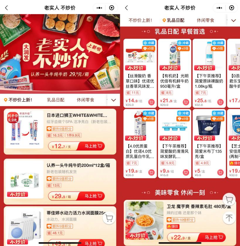 職業(yè)零售網(wǎng)獲悉,臨近雙11大促,零售商超率先發(fā)起預熱。10月15日,大潤發(fā)推出 “老實人不炒價”優(yōu)惠活動,覆蓋乳制日配、休閑零食、個護家清、糧油干雜、酒水飲料等多個品類1000多款商品。 (大潤發(fā)上海門店“老實人不炒價”) 據(jù)了解,大潤發(fā)“老實人不炒價”延續(xù)了此前“不吵價”的質價比理念,鮮奶、酸奶、常溫高端奶,洋酒、奶酪等作為讓利主打,約千款商品將持續(xù)低價。從29.9元1箱的認養(yǎng)一頭牛純牛奶,到179元1瓶的芝華士 12年蘇格蘭威士忌,更有像簡愛酸奶滑滑、獅王牙膏、自有品牌呷無忌freshOla芒果干等低至9.9元的好價商品。 大潤發(fā)優(yōu)鮮APP活動頁面 大潤發(fā)相關負責人表示, “老實人不炒價”并非只是為了雙11而做。“相比降價,我們更強調不炒作價格。大潤發(fā)在日常經(jīng)營中會持續(xù)回饋消費者,“雙11囤貨季” “低價風暴”“年貨大街”“公司周年慶”“均一價”等一年內不同的主題活動,都有很低折扣的優(yōu)惠讓利,覆蓋不同的品類。 據(jù)了解,大潤發(fā)每半月就會針對時令,新品,爆款等打造主題促銷活動,一年24-26檔,全年無休。此外,每檔主題活動中的印花商品更是質價比最優(yōu)的商品。從“不吵價”到“老實人不炒價”,這背后展示的是大潤發(fā)作為老牌民生商超的堅持。 從線上大潤發(fā)優(yōu)鮮APP到線下門店,大潤發(fā)“老實人不炒價”首發(fā)在上海、南京、蘇州、昆山、無錫和南通6個城市同步啟動,未來或將覆蓋更多城市和門店。秉承“好的商品,不貴的價格”,讓更多的消費者能夠買到實惠。 |