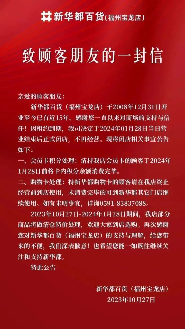 繼剝離零售業(yè)務(wù)后,福州一家新華都百貨宣布閉店。 新華都百貨福州寶龍店 宣布將于明年閉店 10月27日,新華都百貨福州寶龍店發(fā)布停業(yè)公告。 停業(yè)公告顯示,由于租約到期,該店決定在2024年1月28日當(dāng)日營(yíng)業(yè)結(jié)束后正式閉店,不再經(jīng)營(yíng)。 對(duì)于會(huì)員卡和購(gòu)物卡的處理,公告也給出了明確的處理方式。首先,對(duì)于會(huì)員卡積分,顧客需要在2024年1月28日前將卡內(nèi)積分余額消費(fèi)完畢。其次,對(duì)于購(gòu)物卡持有者,需要在該店終止經(jīng)營(yíng)前到店使用,未消費(fèi)完畢的可到新華都其他門(mén)店繼續(xù)使用。 圖來(lái)源:新華都百貨福州寶龍店 現(xiàn)場(chǎng)多個(gè)品牌降價(jià) 據(jù)福州晚報(bào)記者現(xiàn)場(chǎng)報(bào)道,新華都百貨(福州寶龍店)百貨內(nèi)部眾多品牌店的門(mén)口,都放著“閉店出清 本品牌X折起”的招牌,折扣從3.8折到5折不等。 圖來(lái)源:福州晚報(bào)。 附近有消費(fèi)者告訴記者,“很難相信,這家店陪我們快15年了!睋(jù)了解,新華都百貨福州寶龍店于2008年12月31日開(kāi)業(yè),至今已有近15年。 在公告中還表示,將于2023年10月27日—2024年1月28日期間,對(duì)新華都百貨(福州寶龍店)部分商品將做清倉(cāng)特價(jià)處理。 網(wǎng)友表示:實(shí)體店不好做 得知該店將關(guān)閉后,許多網(wǎng)友紛紛表示:“以前大商圈都以低租金給超市引流,現(xiàn)在沒(méi)了超市,同質(zhì)化又嚴(yán)重,難搞哦~”;也有網(wǎng)友表示,“實(shí)體店不好做啊” 最后, 資料顯示,新華都是福建本土的零售企業(yè),1999年,新華都超市在福州五四路開(kāi)業(yè),成為福建省首家超大型一站式綜合購(gòu)物廣場(chǎng)。此后短短幾年,它就在福州城區(qū)開(kāi)出了8家門(mén)店。2012年,新華都購(gòu)物廣場(chǎng)以109.98億的年銷(xiāo)售規(guī)模居第二位,僅次于永輝。 新華都主要有超市和百貨兩大業(yè)態(tài)。其中超市門(mén)店分布在福州、廈門(mén)、漳州、泉州、三明、龍巖、南平、寧德等地市。而新華都百貨旗下門(mén)店主要分布福州、泉州。 曾經(jīng)的輝煌還歷歷在目,如今除了新華都福州寶龍店,福州市民熟悉的沃爾瑪福州東街分店、新華都福新店、新華都超市華林店等多家大型商超,也在此前相繼停止?fàn)I業(yè)。 記者了解到,新華都百貨(福州寶龍店)停業(yè)后,福州的新華都系商超,僅剩4家超市繼續(xù)營(yíng)業(yè)。 事實(shí)上,早在2021年11月,新華都購(gòu)物廣場(chǎng)股份有限公司發(fā)布公告,擬出售零售業(yè)務(wù)板塊的全部資產(chǎn)(商標(biāo)除外),包括福建各地的新華都購(gòu)物廣場(chǎng)以及福建新華都綜合百貨等。 |