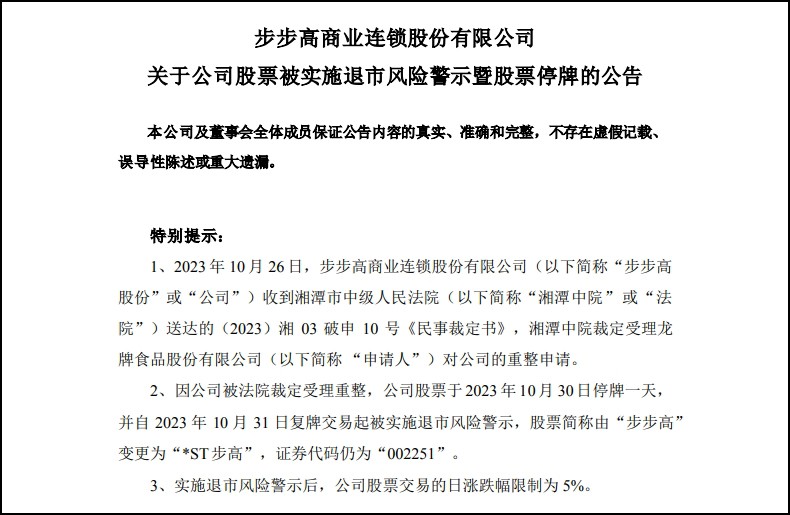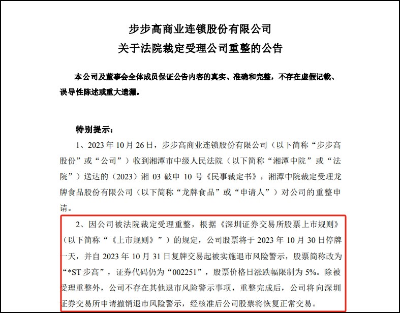 《職業(yè)零售網(wǎng)》獲悉,步步高10月29日公告,10月26日,公司收到湘潭市中級(jí)人民法院送達(dá)的《民事裁定書(shū)》,湘潭中院裁定受理龍牌食品股份有限公司對(duì)公司的重整申請(qǐng)。 因公司被法院裁定受理重整,根據(jù)規(guī)定,公司股票將于2023年10月30日停牌一天,并自2023年10月31日復(fù)牌交易起被實(shí)施退市風(fēng)險(xiǎn)警示,股票簡(jiǎn)稱改為“*ST步高”,證券代碼仍為“002251”,股票價(jià)格日漲跌幅限制為5%。 除被受理重整外,公司不存在其他退市風(fēng)險(xiǎn)警示事項(xiàng)。一旦重整完成后,公司將向深圳證券交易所申請(qǐng)撤銷退市風(fēng)險(xiǎn)警示,經(jīng)核準(zhǔn)后公司股票將恢復(fù)正常交易。并于同日發(fā)布《關(guān)于公司股票被實(shí)施退市風(fēng)險(xiǎn)警示暨股票停牌的公告》。 在此公告中,步步高進(jìn)行了風(fēng)險(xiǎn)提示,如公司順利實(shí)施重整并執(zhí)行完畢重整計(jì)劃,將有利于優(yōu)化公司資產(chǎn)負(fù)債結(jié)構(gòu),扭轉(zhuǎn)公司經(jīng)營(yíng)頹勢(shì),恢復(fù)持續(xù)盈利能力;如重整失敗,公司存在被清算的風(fēng)險(xiǎn)。 步步高表示,公司在超市、百貨業(yè)務(wù)領(lǐng)域深耕多年,在湖南、廣西等地零售市場(chǎng)占有較大市場(chǎng)份額,門(mén)店位于所在城市的核心商圈或具有良好發(fā)展?jié)摿Φ纳虡I(yè)中心,地理位置優(yōu)越,具有一定的市場(chǎng)競(jìng)爭(zhēng)優(yōu)勢(shì)。預(yù)重整期間,各項(xiàng)工作有序推進(jìn),投資人招募進(jìn)展順利,可認(rèn)定具有重整價(jià)值和拯救可能性。 進(jìn)入重整程序后,公司董事會(huì)將全力配合法院及管理人開(kāi)展重整工作,依法履行債務(wù)人的法定義務(wù),爭(zhēng)取多方支持,力爭(zhēng)盡快完成重整,并向深圳證券交易所申請(qǐng)撤銷退市風(fēng)險(xiǎn)警示。 此外,記者注意到,在步步高10月11日發(fā)布的《關(guān)于全資子公司申請(qǐng)重整的公告》中顯示,除了步步高本身之外,步步高旗下的郴州步步高等9家全資子公司也向相關(guān)法院提出了重整申請(qǐng),重整申請(qǐng)能否被法院受理,是否進(jìn)入重整程序尚存在不確定性。 步步高集團(tuán)于1995年3月創(chuàng)立于湖南湘潭,總部位于湖南長(zhǎng)沙。目前已成長(zhǎng)為擁有超市、便利店、購(gòu)物中心、商業(yè)綜合體、物流運(yùn)輸?shù)榷鄻I(yè)態(tài)的商業(yè)集團(tuán)。 業(yè)績(jī)方面,步步高發(fā)布的半年度業(yè)績(jī)報(bào)告顯示,公司2023年上半年?duì)I業(yè)收入約17.88億元,同比減少69.29%;歸屬于上市公司股東的凈利潤(rùn)虧損約4.49億元,公司還在半年報(bào)中介紹稱,因受消費(fèi)復(fù)蘇緩慢等因素影響,以及公司戰(zhàn)略調(diào)整閉店、流動(dòng)資金緊張,導(dǎo)致公司及各子公司業(yè)績(jī)出現(xiàn)不同程度的下降。 值得注意的是,10月20日,步步高超市宣布長(zhǎng)沙和南寧22家門(mén)店全面恢復(fù)正常營(yíng)業(yè)。其中,長(zhǎng)沙地區(qū)的門(mén)店數(shù)量為15家,南寧地區(qū)的門(mén)店數(shù)量為7家。在此之前,9月28日,步步高已重新啟動(dòng)了湘潭地區(qū)的11家門(mén)店。目前,步步高超市恢復(fù)正常營(yíng)業(yè)的門(mén)店總數(shù)已經(jīng)達(dá)到33家。 步步高集團(tuán)董事長(zhǎng)王填表示,已對(duì)整個(gè)供應(yīng)鏈做了重大改造,步步高的商品比以往更豐富、價(jià)錢更便宜。我們平均售價(jià) 下調(diào)了15%左右,實(shí)際上售價(jià)是以前的八五折。然后,逐步在11月30號(hào)之前完成全國(guó)的步步高超市重啟。此外,公司還將在線上業(yè)務(wù)和折扣店等業(yè)務(wù)方面有新的發(fā)展。 截至10月27日收盤(pán),步步高漲2.95%,報(bào)5.23元,總市值45.18億元。 |
