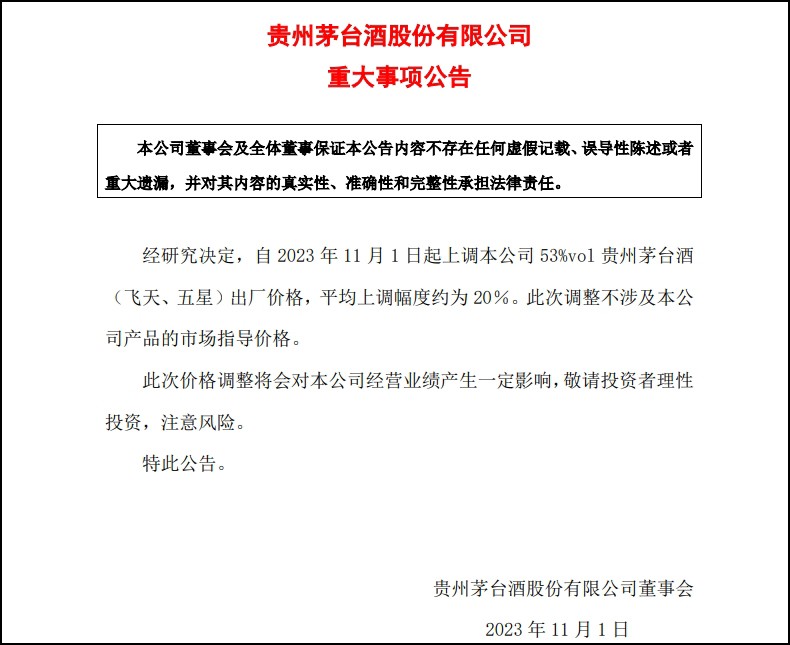 本文來源:21世紀(jì)經(jīng)濟(jì)報(bào)道、證券時報(bào) 10月31日深夜,貴州茅臺發(fā)布重大事項(xiàng)公告,經(jīng)研究決定,自2023年11月1日起上調(diào)該公司53%vol貴州茅臺酒(飛天、五星)出廠價格,平均上調(diào)幅度約為20%。 貴州茅臺表示,此次調(diào)整不涉及公司產(chǎn)品的市場指導(dǎo)價格(1499元/瓶),此次價格調(diào)整將會對貴州茅臺經(jīng)營業(yè)績產(chǎn)生一定影響。 需要指出的是,53度/500ml飛天茅臺出廠價常年維持在969元/瓶,針對市場廠家的建議零售價為1499元/瓶。但眾所周知,由于需求大于供應(yīng),導(dǎo)致飛天茅臺的價格出現(xiàn)雙軌,真實(shí)的市場價遠(yuǎn)比廠家建議零售價溢價太多。 根據(jù)今日酒價數(shù)據(jù)顯示,2023年出廠53度500ml的原箱飛天茅臺市場價約為2900元/瓶,散瓶茅臺則為2600元左右。相比之下,飛天茅臺市場價格與出廠價差額極大,由此,外界人士常常質(zhì)疑茅臺價格管控不到位,導(dǎo)致上市公司巨額利潤空間流失。根據(jù)最新公告所述,此次出廠價上調(diào)幅度約為20%,以53度500ml飛天茅臺酒為例,上調(diào)約200元/瓶。 6年來首次漲價 據(jù)了解,此次提價是茅臺將近6年來的首次提價。自2018年1月53度500ml飛天茅臺出廠價由819元提高到969元、終端零售價格調(diào)整到1499元以來,“飛天”提價預(yù)期一直在資本市場發(fā)酵,但一直未獲明確回應(yīng)。 據(jù)證券時報(bào)記者不完全統(tǒng)計(jì),此前貴州茅臺在2006年、2009年、2010年、2012年和2017年底對產(chǎn)品進(jìn)行過提價,其中2006年主要是針對茅臺年份酒,并不涉及市場最關(guān)注的飛天茅臺酒。 誰沒想到,這一次的提價竟會來的如此突然。若按20%漲幅來看,“飛天”茅臺酒的出廠價格或?qū)⑦_(dá)到1162.8元左右。 事實(shí)上,在今年6月13日,貴州茅臺2022年度股東大會上,針對股東最關(guān)心的茅臺提價、分紅等問題,貴州茅臺董事長丁雄軍和時任貴州茅臺總經(jīng)理李靜仁都一一做了回應(yīng)。 在現(xiàn)場,丁雄軍表示,白酒產(chǎn)業(yè)在中國永遠(yuǎn)是一個好的產(chǎn)業(yè),是可以長期存在和持續(xù)發(fā)展的產(chǎn)業(yè)!霸谧暮芏喙蓶|長期持有一些白酒的股票,特別是像茅臺的這種股票,我認(rèn)為是對的。” 對于茅臺提價,丁雄軍坦言,和投資者一樣,茅臺提價是管理層每天都在追求的。但何時提價、如何提價,需要智慧。現(xiàn)場有投資者呼吁茅臺進(jìn)一步提升分紅比例,李靜仁回應(yīng),目前的分紅比例是最佳比例。 茅臺為什么要提高出廠價? 據(jù)證券時報(bào)報(bào)道,面對貴州茅臺突然深夜提價,知趣咨詢總經(jīng)理、酒類分析師蔡學(xué)飛表示:“價格是市場供需關(guān)系決定的,茅臺已經(jīng)是‘消費(fèi)品’、‘奢侈品’與‘投資品’三品合一,在商務(wù)、禮品與高端宴席市場具有極強(qiáng)的剛需屬性! 蔡學(xué)飛進(jìn)一步指出,隨著相關(guān)經(jīng)濟(jì)政策的不斷落地,以及國內(nèi)社會消費(fèi)的逐步恢復(fù),可以說茅臺的市場需求依然旺盛,結(jié)合茅臺的有限產(chǎn)能現(xiàn)狀,以及目前四季度白酒消費(fèi)旺季和春節(jié)備貨情況,應(yīng)該說茅臺的漲價是有一定市場基礎(chǔ)的,也是符合茅臺掌握市場主動權(quán),提升企業(yè)經(jīng)營效益的手段。 中國酒業(yè)評論人肖竹青對證券時報(bào)·e公司記者表示,市場經(jīng)濟(jì)規(guī)律特點(diǎn)是:供過于求,價格下跌;供不應(yīng)求,價格上漲。茅臺酒長期以來供不應(yīng)求,整箱茅臺酒行情價長期在2900~3000/瓶左右,本次茅臺提高出廠價格是在近六年未做價格調(diào)整的情況下進(jìn)行的,兼顧企業(yè)長遠(yuǎn)發(fā)展和市場長期穩(wěn)定的基礎(chǔ)上,適度調(diào)整部分產(chǎn)品出廠價格是正常合理企業(yè)經(jīng)營行為。 從茅臺酒市場表現(xiàn)來看,肖竹青認(rèn)為,目前消費(fèi)需求持續(xù)旺盛,在五年多未進(jìn)行價格調(diào)整的情況下,提高出廠價順應(yīng)國家大力推進(jìn)消費(fèi)復(fù)蘇趨勢,利于提振白酒行業(yè)發(fā)展信心,符合投資者期望,有力提振資本市場對茅臺以及白酒板塊的信心。實(shí)際上,茅臺酒供不應(yīng)求代表著民營企業(yè)家社會交流的活躍指數(shù),也代表著中國經(jīng)濟(jì)觸底反彈的信心指數(shù)。 |