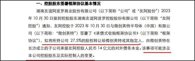 友阿股份近期發(fā)布公告稱,控股股東湖南友誼阿波羅控股股份有限公司友阿控股于10月30日與微創(chuàng)英特半導體(中國)有限公司(簡稱:“微創(chuàng)英特”)簽署了《承債式收購框架協議書》。 根據框架協議,友阿控股擬將所持友阿股份27.5%的股權轉讓給微創(chuàng)英特或其指定人,由微創(chuàng)英特在長沙成立的子公司承接友阿控股14億元的對外債務本金。該事項可能涉及友阿股份控股股東及實際控制人的變更。 在友阿股份的股權轉讓給微創(chuàng)英特后,友阿控股在重大決策事宜方面與微創(chuàng)英特保持一致,友阿控股配合微創(chuàng)英特以友阿股份或子公司名義對外展開收購或并購的相關業(yè)務。微創(chuàng)英特必須在3至12個月內完成不低于10億元市值的儲能、光伏、新能源、大數據、充電樁等相關業(yè)務的資產注入,友阿股份原有業(yè)務版塊以租賃或承包經營的方式交給原團隊負責運營。 資料顯示,微創(chuàng)英特的是微創(chuàng)集團有限公司的全資子公司。友阿股份在投資者互動平臺稱:微創(chuàng)英特為控股股東交易對手方,公司對其財務情況不了解。同時表示,微創(chuàng)英特與港股上市公司微創(chuàng)醫(yī)療不存在關聯關系。 |