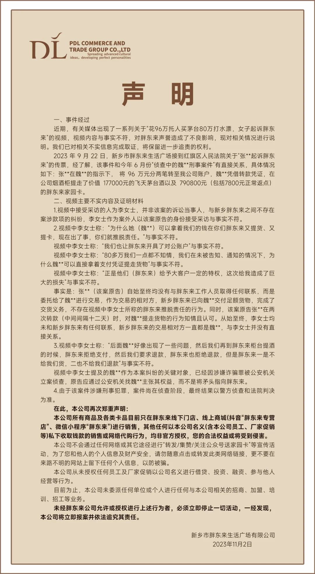 《零售網(wǎng)》獲悉,11月3日,胖東來官方公眾號“胖東來商貿(mào)集團(tuán)”發(fā)布《聲明》稱,近期,有關(guān)媒體出現(xiàn)了一系列關(guān)于“花96萬托人買茅臺(tái)80萬打水漂,女子起訴胖東來”的視頻,視頻內(nèi)容與事實(shí)不符,對胖東來聲譽(yù)造成了不良影響,現(xiàn)對相關(guān)情況進(jìn)行說明。我們已對相關(guān)不實(shí)信息完成取證,將保留進(jìn)一步追責(zé)的權(quán)利。 具體聲明如下: |