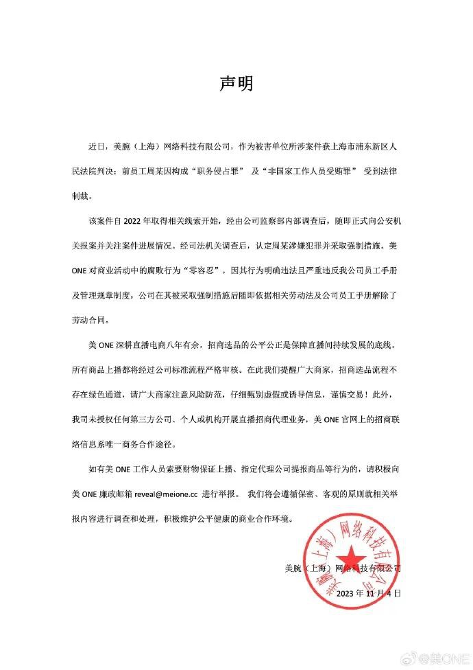 11月4日,美腕公司通過微博發(fā)布聲明稱,近日,美腕(上海)網(wǎng)絡(luò)科技有限公司作為被害單位所涉案件獲上海市浦東新區(qū)人民法院判決:前員工周某因構(gòu)成“職務(wù)侵占罪”及“非國家工作人員受賄罪”受到法律制裁。 該案件自2022年取得相關(guān)線索開始,經(jīng)由公司監(jiān)察部內(nèi)部調(diào)查后,隨即正式向公安機(jī)關(guān)報案并關(guān)注案件進(jìn)展情況。經(jīng)司法機(jī)關(guān)調(diào)查后,認(rèn)定周某涉嫌犯罪并采取強(qiáng)制措施。 美ONE對商業(yè)活動中的腐敗行為“零容忍”,因其行為明確違法且嚴(yán)重違反該公司員工手冊及管理規(guī)章制度,公司在其被采取強(qiáng)制措施后隨即依據(jù)相關(guān)勞動法及公司員工手冊解除了勞動合同。 此前有消息稱,美ONE公司一名“90后”招商專員為商家提供商品選送、直播排期等幫助,并收取好處費超百萬一事,一度登上微博熱搜。 11月4日,澎湃新聞記者獲悉,上海市浦東新區(qū)人民法院審理了這起直播公司招商專員利用職務(wù)便利犯罪的案件。該案被害企業(yè)美腕(上海)網(wǎng)絡(luò)科技有限公司(以下簡稱“美腕公司”)為美ONE品牌所屬公司,該企業(yè)孵化并運營了李佳琦直播間。 判決書顯示,被告人周某,男,1994年生。法院經(jīng)審理查明:2020年7月至2022年9月期間,周某在擔(dān)任美腕公司招商專員期間利用商務(wù)合作談判、商品選送、合同簽訂、排期溝通的職務(wù)便利,在明知美腕公司向美學(xué)(天津)科技有限公司(以下簡稱美學(xué)公司)收取的服務(wù)費用比例情況下,以美學(xué)公司產(chǎn)品未被選上為由,伙同同案關(guān)系人鄧某,經(jīng)合謀虛設(shè)上海瓊星文化傳媒工作室的中間環(huán)節(jié)向美學(xué)公司提供代理服務(wù),共計侵占公司費用55萬元。 2020年8月至2022年6月期間,周某在美腕公司任職招商專員期間,利用其職務(wù)便利,為廣州某公司與美腕公司之間的業(yè)務(wù)往來提供商品選送、直播排期等幫助,并多次收受廣州某公司相關(guān)人員送的好處費共計109萬元。 2023年4月18日,被告人周某因職務(wù)侵占事實被公安機(jī)關(guān)抓獲到案,后如實供述了職務(wù)侵占事實,并主動交代了公安機(jī)關(guān)尚未掌握的非國家工作人員受賄事實。案發(fā)后,被告人周某、鄧某分別向美腕公司退賠20萬元、35萬元。案件審理過程中,被告人周某向法院退繳109萬元。 上海市浦東新區(qū)人民法院認(rèn)為,被告人周某身為公司工作人員,利用職務(wù)上的便利,伙同他人將本單位財物非法占為己有,數(shù)額較大,其行為已構(gòu)成職務(wù)侵占罪,被告人周某又利用職務(wù)上的便利,在業(yè)務(wù)往來中非法收受他人財物,為他人謀取利益,數(shù)額巨大,其行為已構(gòu)成非國家工作人員受賄罪;被告人周某在判決宣告前犯兩罪,應(yīng)當(dāng)數(shù)罪并罰。同時,因其在職務(wù)侵占犯罪中具有坦白情節(jié),在非國家工作人員受賄犯罪中具有自首情節(jié),且自愿認(rèn)罪認(rèn)罰,退出全部賄賂款,且同他人共同退出全部職務(wù)侵占款,法院依法對其酌情從輕處罰。 10月20日,法院對此案作出一審判決:被告人周某犯非國家工作人員受賄罪,判處有期徒刑二年三個月,并處罰金人民幣十五萬元;犯職務(wù)侵占罪,判處有期徒刑一年三個月,并處罰金人民幣十萬元,決定執(zhí)行有期徒刑三年,緩刑四年,并處罰金人民幣二十五萬元。退繳在案的賄賂款,予以沒收;退繳的職務(wù)侵占款,發(fā)還被害單位。 美ONE聲明稱,招商選品的公平公正是保障直播間持續(xù)發(fā)展的底線。所有商品上播都將經(jīng)過公司標(biāo)準(zhǔn)流程嚴(yán)格審核。該公司提醒廣大商家,招商選品流程不存在綠色通道,請廣大商家注意風(fēng)險防范,仔細(xì)甄別虛假或誘導(dǎo)信息,謹(jǐn)慎交易!聲明稱,該公司未授權(quán)任何第三方公司、個人或機(jī)構(gòu)開展直播招商代理業(yè)務(wù),美ONE官網(wǎng)上的招商聯(lián)絡(luò)信息系唯一商務(wù)合作途徑。 聲明最后稱,“如有美ONE工作人員索要財物保證上播、指定代理公司提報商品等行為的,請積極向美ONE廉政郵箱reveal@meione.cc進(jìn)行舉報。我們將會遵循保密、客觀的原則就相關(guān)舉報內(nèi)容進(jìn)行調(diào)查和處理,積極維護(hù)公平健康的商業(yè)合作環(huán)境! |