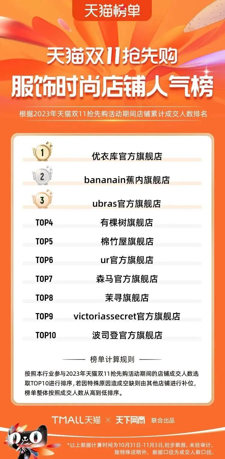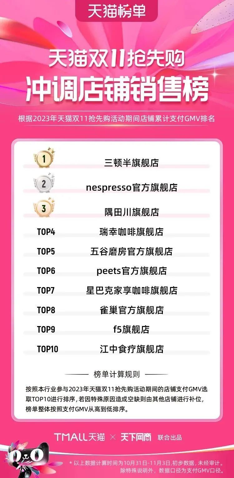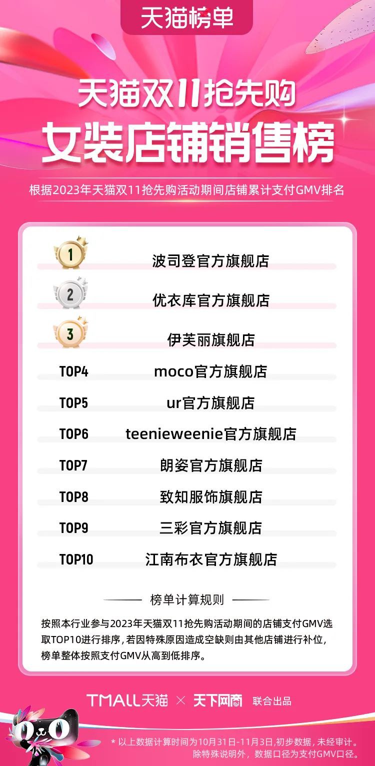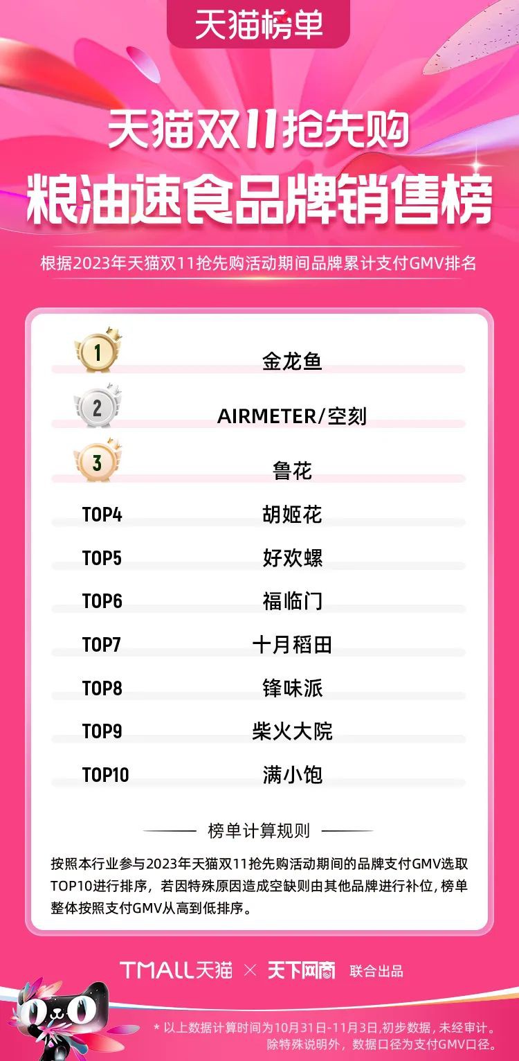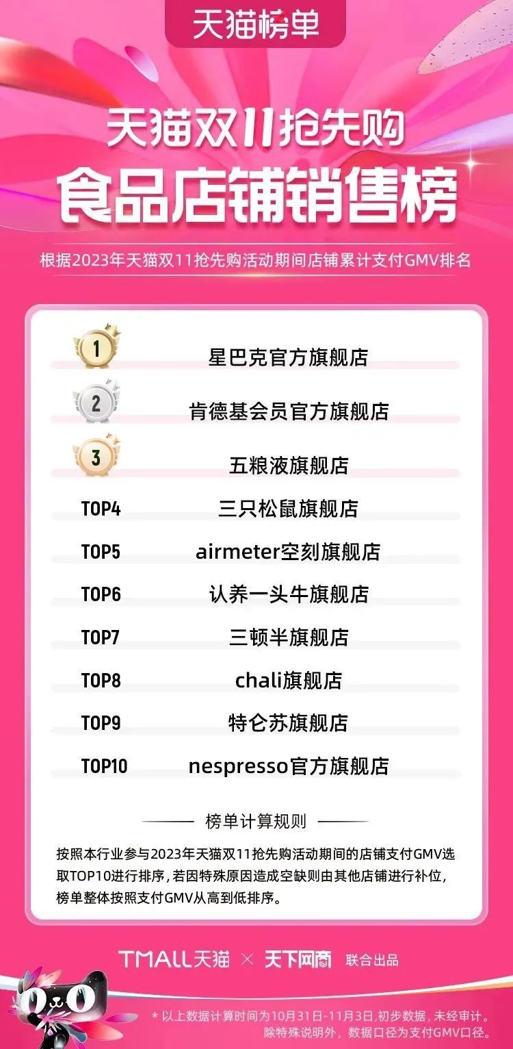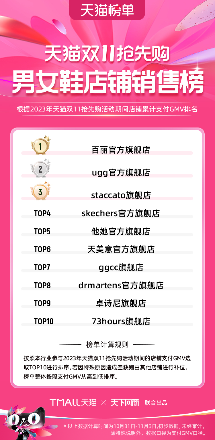 2023年天貓雙11強(qiáng)勁開局,第一波剛開售155個(gè)品牌開賣成交即破億,開售首小時(shí)7.19萬(wàn)個(gè)品牌成交額超去年首日全天。 11月4日,天貓雙11發(fā)布第一階段(10月31日-11月3日)品牌商家成交金額排行榜及品牌商家成交人數(shù)排行榜,大快消、服飾、運(yùn)動(dòng)戶外、消費(fèi)電子、家裝家居、玩具潮玩、食品生鮮、汽車等行業(yè)的“領(lǐng)跑者”出爐。 星圖最新數(shù)據(jù)顯示,2023年雙11正式開售首日,淘寶天貓份額占比近6成,市場(chǎng)份額相比去年進(jìn)一步擴(kuò)大。此外,QuestMobile數(shù)據(jù)顯示,2023年10月24日雙11預(yù)售當(dāng)天,淘寶APP活躍用戶數(shù)達(dá)5.07億,為行業(yè)第一,DAU同比增幅超5%。 作為品牌線上經(jīng)營(yíng)的主陣地,天貓雙11前,天貓投入總額20億的“真金白銀”,用于品牌商家經(jīng)營(yíng)激勵(lì),支持品牌以最小的投入,獲得最大的增長(zhǎng)。 以下為天貓雙11第一階段(10月31日-11月3日)榜單: 快消銷售榜 快消人氣榜 服飾時(shí)尚銷售榜 服飾時(shí)尚人氣榜 運(yùn)動(dòng)戶外銷售榜 運(yùn)動(dòng)戶外人氣榜 消費(fèi)電子銷售榜 消費(fèi)電子人氣榜 家裝家居銷售榜 家裝家居人氣榜 玩具潮玩銷售榜 玩具潮玩人氣榜 香氛香薰銷售榜 香氛香薰人氣榜 寵物銷售榜 寵物人氣榜 食品銷售榜 食品人氣榜 汽車人氣榜 汽車銷售榜 生鮮銷售榜 生鮮人氣榜 文教銷售榜 文教人氣榜 珠寶飾品銷售榜 珠寶飾品人氣榜 企業(yè)服務(wù)銷售榜 企業(yè)服務(wù)人氣榜 健康銷售榜 |
