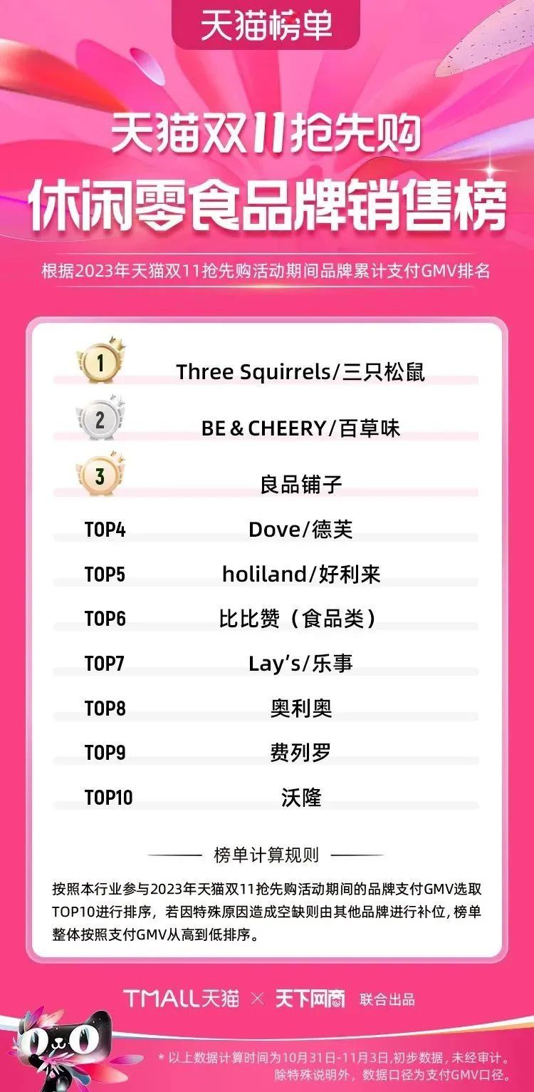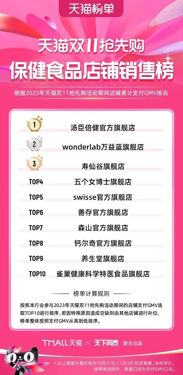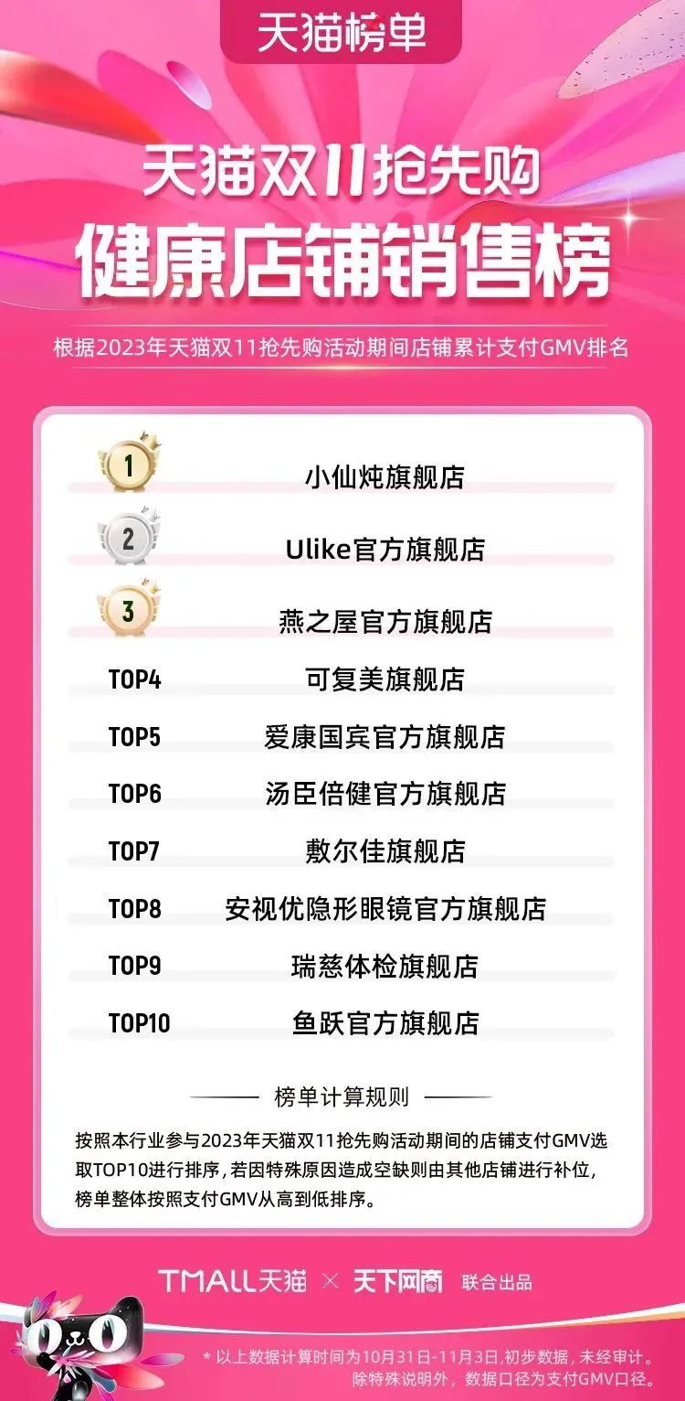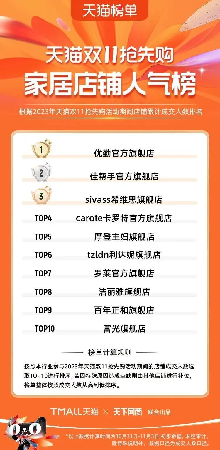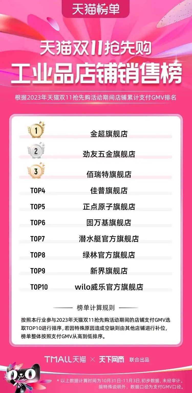 2023年天貓雙11強(qiáng)勁開局,第一波剛開售155個(gè)品牌開賣成交即破億,開售首小時(shí)7.19萬(wàn)個(gè)品牌成交額超去年首日全天。 11月4日,天貓雙11發(fā)布第一階段(10月31日-11月3日)品牌商家成交金額排行榜及品牌商家成交人數(shù)排行榜,大快消、服飾、運(yùn)動(dòng)戶外、消費(fèi)電子、家裝家居、玩具潮玩、食品生鮮、汽車等行業(yè)的“領(lǐng)跑者”出爐。 星圖最新數(shù)據(jù)顯示,2023年雙11正式開售首日,淘寶天貓份額占比近6成,市場(chǎng)份額相比去年進(jìn)一步擴(kuò)大。此外,QuestMobile數(shù)據(jù)顯示,2023年10月24日雙11預(yù)售當(dāng)天,淘寶APP活躍用戶數(shù)達(dá)5.07億,為行業(yè)第一,DAU同比增幅超5%。 作為品牌線上經(jīng)營(yíng)的主陣地,天貓雙11前,天貓投入總額20億的“真金白銀”,用于品牌商家經(jīng)營(yíng)激勵(lì),支持品牌以最小的投入,獲得最大的增長(zhǎng)。 以下為天貓雙11第一階段(10月31日-11月3日)榜單: 快消銷售榜 快消人氣榜 服飾時(shí)尚銷售榜 服飾時(shí)尚人氣榜 運(yùn)動(dòng)戶外銷售榜 運(yùn)動(dòng)戶外人氣榜 消費(fèi)電子銷售榜 消費(fèi)電子人氣榜 家裝家居銷售榜 家裝家居人氣榜 玩具潮玩銷售榜 玩具潮玩人氣榜 香氛香薰銷售榜 香氛香薰人氣榜 寵物銷售榜 寵物人氣榜 食品銷售榜 食品人氣榜 汽車人氣榜 汽車銷售榜 生鮮銷售榜 生鮮人氣榜 文教銷售榜 文教人氣榜 珠寶飾品銷售榜 珠寶飾品人氣榜 企業(yè)服務(wù)銷售榜 企業(yè)服務(wù)人氣榜 健康銷售榜 |