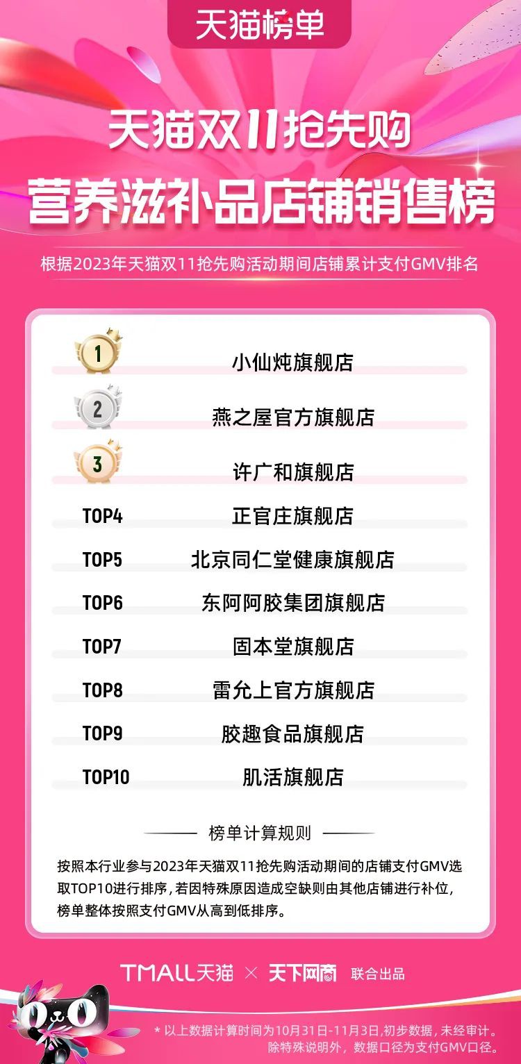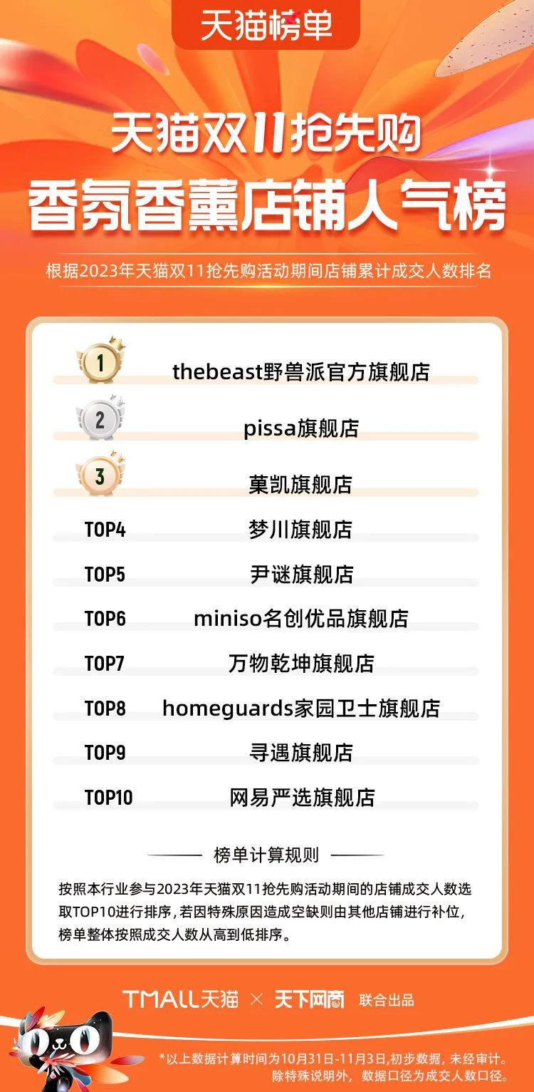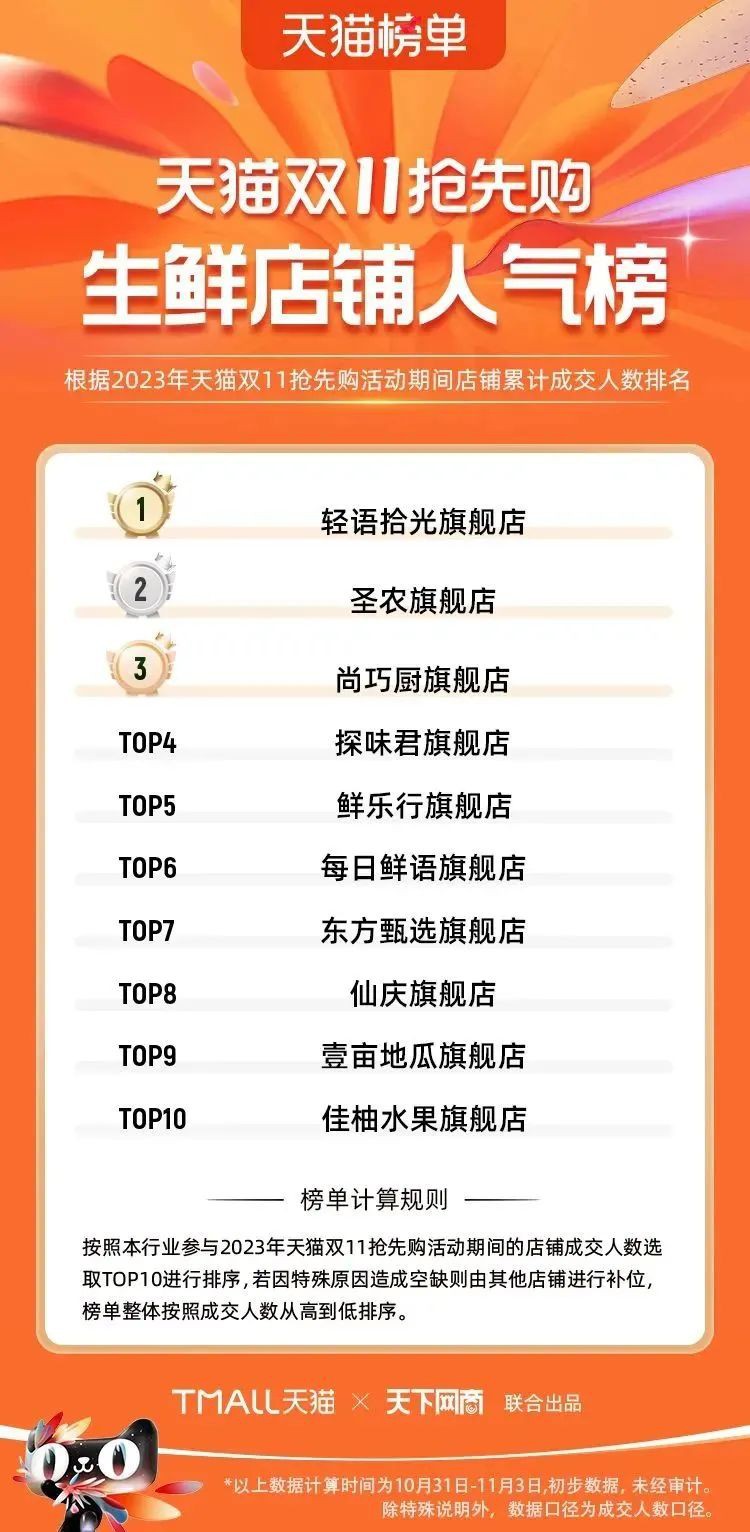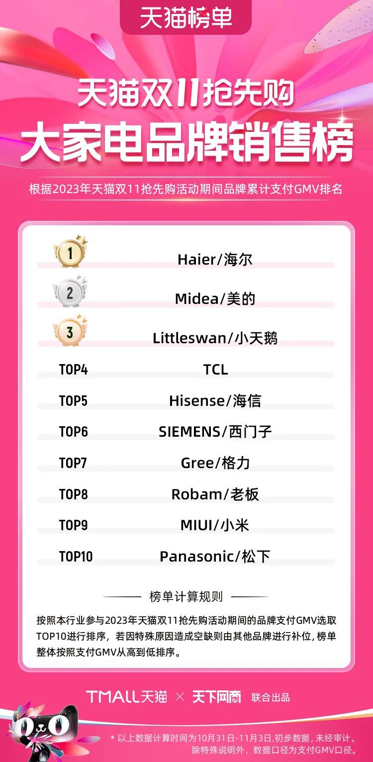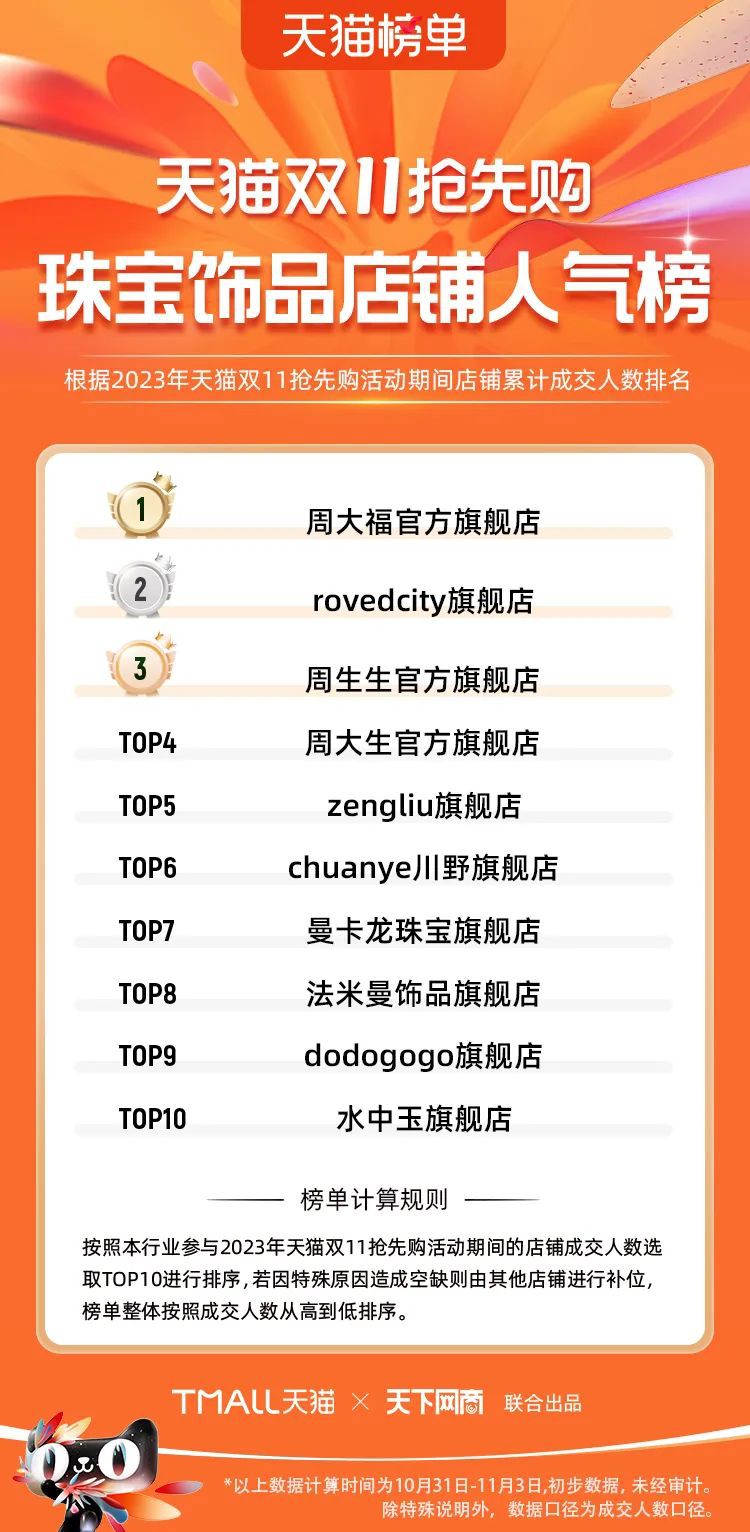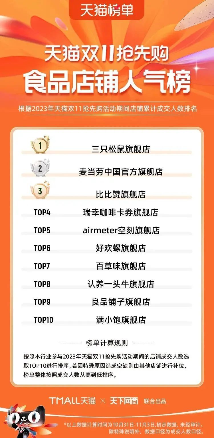 2023年天貓雙11強(qiáng)勁開局,第一波剛開售155個(gè)品牌開賣成交即破億,開售首小時(shí)7.19萬(wàn)個(gè)品牌成交額超去年首日全天。 11月4日,天貓雙11發(fā)布第一階段(10月31日-11月3日)品牌商家成交金額排行榜及品牌商家成交人數(shù)排行榜,大快消、服飾、運(yùn)動(dòng)戶外、消費(fèi)電子、家裝家居、玩具潮玩、食品生鮮、汽車等行業(yè)的“領(lǐng)跑者”出爐。 星圖最新數(shù)據(jù)顯示,2023年雙11正式開售首日,淘寶天貓份額占比近6成,市場(chǎng)份額相比去年進(jìn)一步擴(kuò)大。此外,QuestMobile數(shù)據(jù)顯示,2023年10月24日雙11預(yù)售當(dāng)天,淘寶APP活躍用戶數(shù)達(dá)5.07億,為行業(yè)第一,DAU同比增幅超5%。 作為品牌線上經(jīng)營(yíng)的主陣地,天貓雙11前,天貓投入總額20億的“真金白銀”,用于品牌商家經(jīng)營(yíng)激勵(lì),支持品牌以最小的投入,獲得最大的增長(zhǎng)。 以下為天貓雙11第一階段(10月31日-11月3日)榜單: 快消銷售榜 快消人氣榜 服飾時(shí)尚銷售榜 服飾時(shí)尚人氣榜 運(yùn)動(dòng)戶外銷售榜 運(yùn)動(dòng)戶外人氣榜 消費(fèi)電子銷售榜 消費(fèi)電子人氣榜 家裝家居銷售榜 家裝家居人氣榜 玩具潮玩銷售榜 玩具潮玩人氣榜 香氛香薰銷售榜 香氛香薰人氣榜 寵物銷售榜 寵物人氣榜 食品銷售榜 食品人氣榜 汽車人氣榜 汽車銷售榜 生鮮銷售榜 生鮮人氣榜 文教銷售榜 文教人氣榜 珠寶飾品銷售榜 珠寶飾品人氣榜 企業(yè)服務(wù)銷售榜 企業(yè)服務(wù)人氣榜 健康銷售榜 |