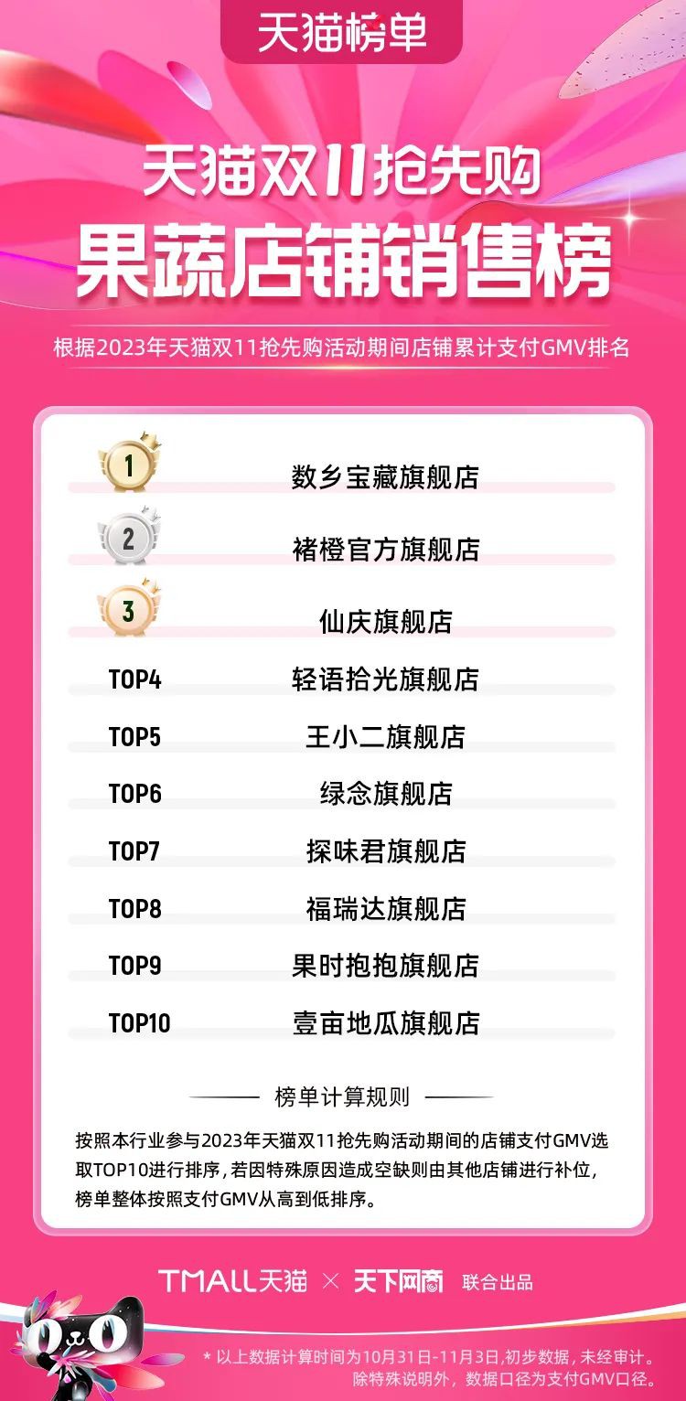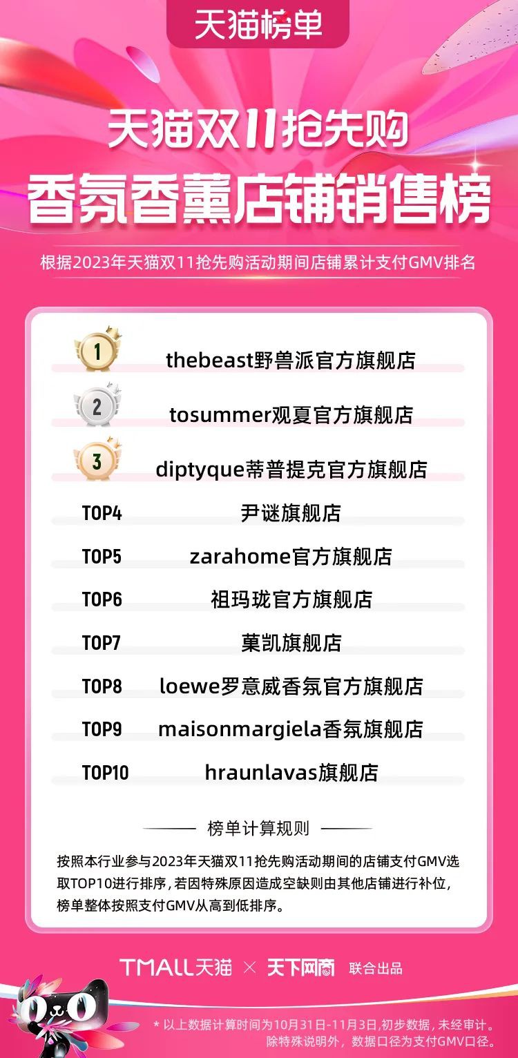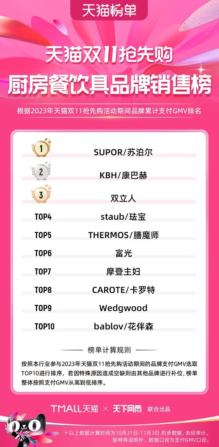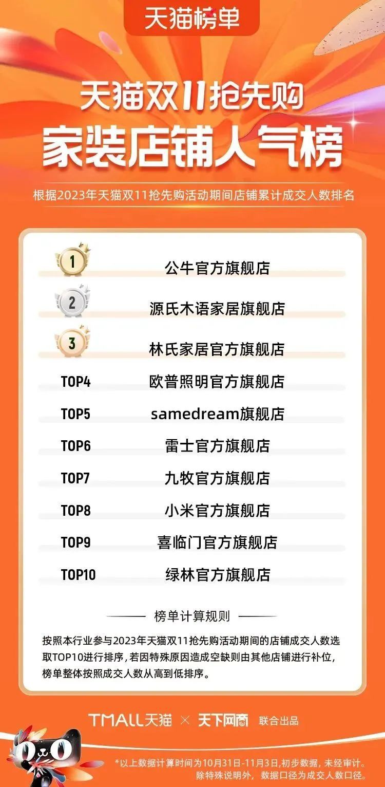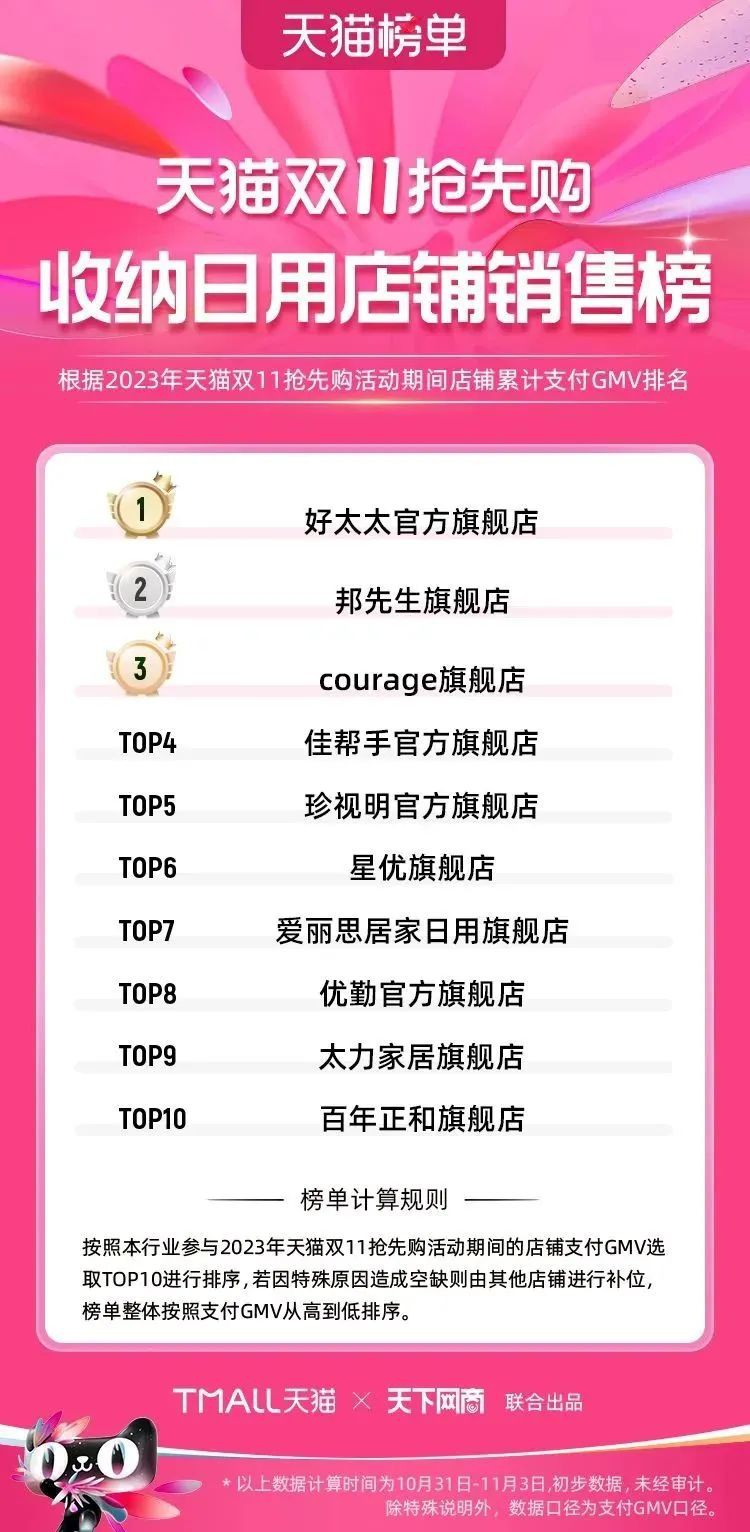 2023年天貓雙11強(qiáng)勁開局,第一波剛開售155個(gè)品牌開賣成交即破億,開售首小時(shí)7.19萬(wàn)個(gè)品牌成交額超去年首日全天。 11月4日,天貓雙11發(fā)布第一階段(10月31日-11月3日)品牌商家成交金額排行榜及品牌商家成交人數(shù)排行榜,大快消、服飾、運(yùn)動(dòng)戶外、消費(fèi)電子、家裝家居、玩具潮玩、食品生鮮、汽車等行業(yè)的“領(lǐng)跑者”出爐。 星圖最新數(shù)據(jù)顯示,2023年雙11正式開售首日,淘寶天貓份額占比近6成,市場(chǎng)份額相比去年進(jìn)一步擴(kuò)大。此外,QuestMobile數(shù)據(jù)顯示,2023年10月24日雙11預(yù)售當(dāng)天,淘寶APP活躍用戶數(shù)達(dá)5.07億,為行業(yè)第一,DAU同比增幅超5%。 作為品牌線上經(jīng)營(yíng)的主陣地,天貓雙11前,天貓投入總額20億的“真金白銀”,用于品牌商家經(jīng)營(yíng)激勵(lì),支持品牌以最小的投入,獲得最大的增長(zhǎng)。 以下為天貓雙11第一階段(10月31日-11月3日)榜單: 快消銷售榜 快消人氣榜 服飾時(shí)尚銷售榜 服飾時(shí)尚人氣榜 運(yùn)動(dòng)戶外銷售榜 運(yùn)動(dòng)戶外人氣榜 消費(fèi)電子銷售榜 消費(fèi)電子人氣榜 家裝家居銷售榜 家裝家居人氣榜 玩具潮玩銷售榜 玩具潮玩人氣榜 香氛香薰銷售榜 香氛香薰人氣榜 寵物銷售榜 寵物人氣榜 食品銷售榜 食品人氣榜 汽車人氣榜 汽車銷售榜 生鮮銷售榜 生鮮人氣榜 文教銷售榜 文教人氣榜 珠寶飾品銷售榜 珠寶飾品人氣榜 企業(yè)服務(wù)銷售榜 企業(yè)服務(wù)人氣榜 健康銷售榜 |