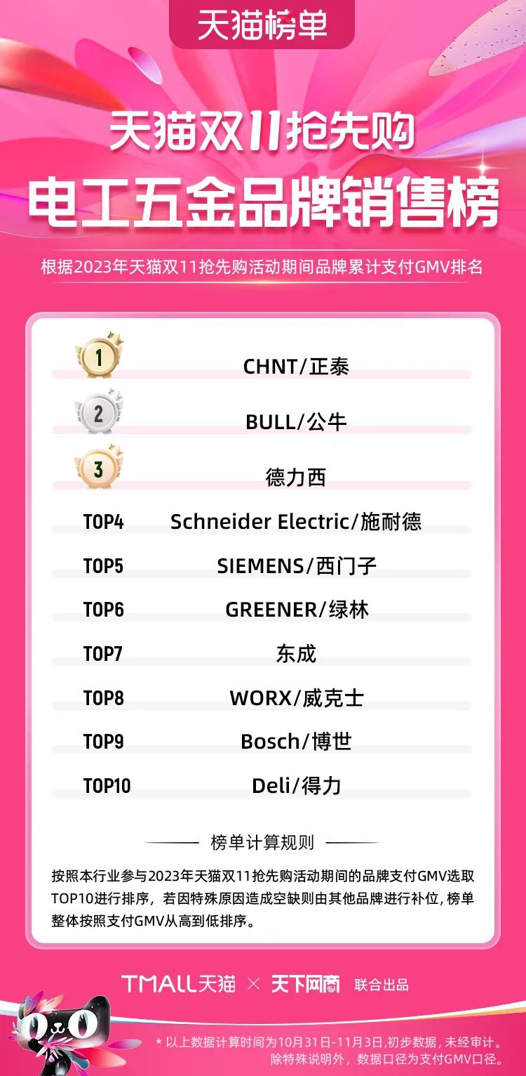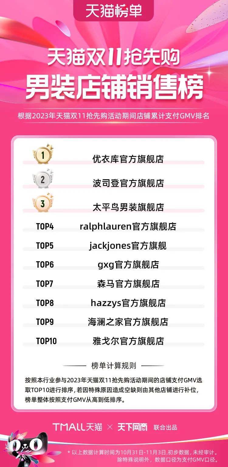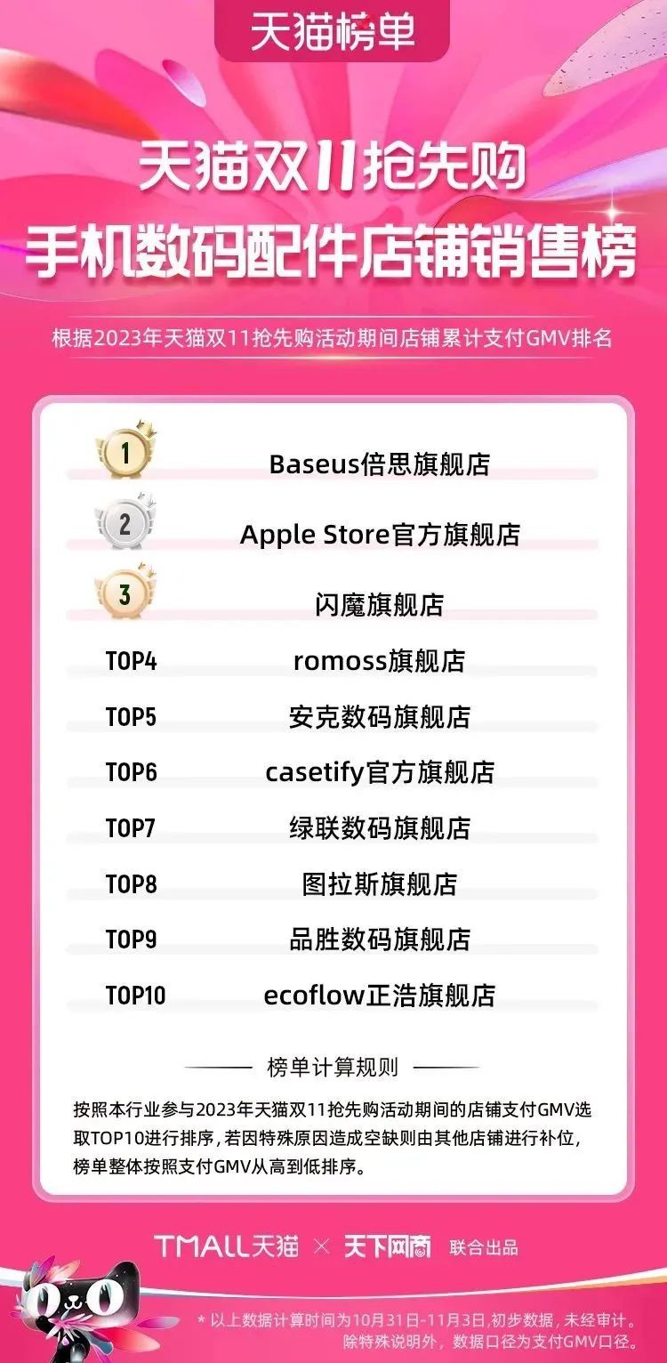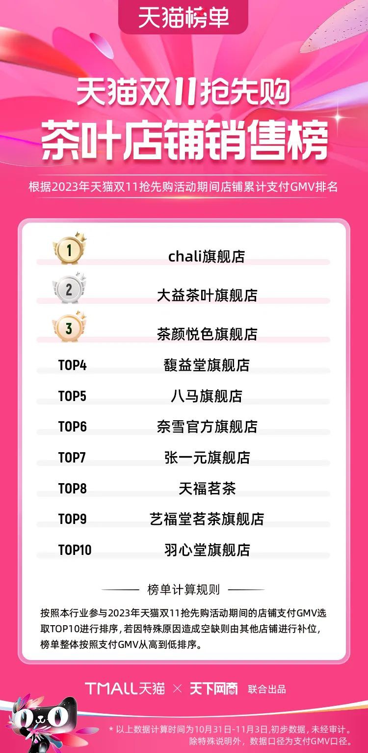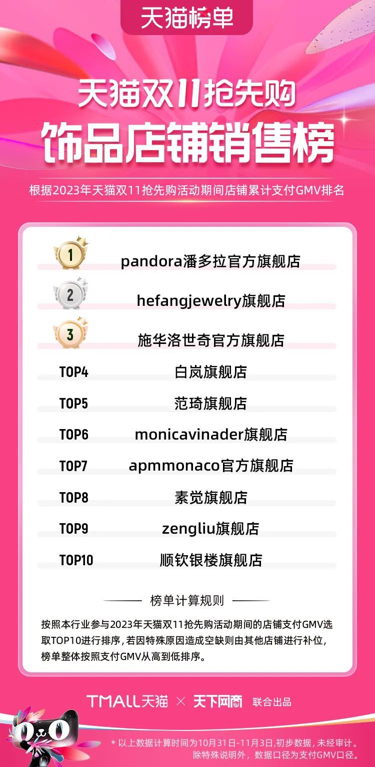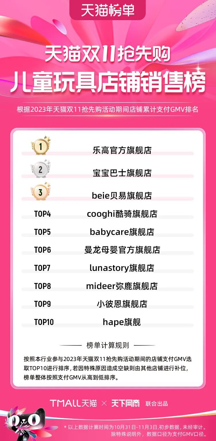 2023年天貓雙11強(qiáng)勁開局,第一波剛開售155個(gè)品牌開賣成交即破億,開售首小時(shí)7.19萬(wàn)個(gè)品牌成交額超去年首日全天。 11月4日,天貓雙11發(fā)布第一階段(10月31日-11月3日)品牌商家成交金額排行榜及品牌商家成交人數(shù)排行榜,大快消、服飾、運(yùn)動(dòng)戶外、消費(fèi)電子、家裝家居、玩具潮玩、食品生鮮、汽車等行業(yè)的“領(lǐng)跑者”出爐。 星圖最新數(shù)據(jù)顯示,2023年雙11正式開售首日,淘寶天貓份額占比近6成,市場(chǎng)份額相比去年進(jìn)一步擴(kuò)大。此外,QuestMobile數(shù)據(jù)顯示,2023年10月24日雙11預(yù)售當(dāng)天,淘寶APP活躍用戶數(shù)達(dá)5.07億,為行業(yè)第一,DAU同比增幅超5%。 作為品牌線上經(jīng)營(yíng)的主陣地,天貓雙11前,天貓投入總額20億的“真金白銀”,用于品牌商家經(jīng)營(yíng)激勵(lì),支持品牌以最小的投入,獲得最大的增長(zhǎng)。 以下為天貓雙11第一階段(10月31日-11月3日)榜單: 快消銷售榜 快消人氣榜 服飾時(shí)尚銷售榜 服飾時(shí)尚人氣榜 運(yùn)動(dòng)戶外銷售榜 運(yùn)動(dòng)戶外人氣榜 消費(fèi)電子銷售榜 消費(fèi)電子人氣榜 家裝家居銷售榜 家裝家居人氣榜 玩具潮玩銷售榜 玩具潮玩人氣榜 香氛香薰銷售榜 香氛香薰人氣榜 寵物銷售榜 寵物人氣榜 食品銷售榜 食品人氣榜 汽車人氣榜 汽車銷售榜 生鮮銷售榜 生鮮人氣榜 文教銷售榜 文教人氣榜 珠寶飾品銷售榜 珠寶飾品人氣榜 企業(yè)服務(wù)銷售榜 企業(yè)服務(wù)人氣榜 健康銷售榜 |