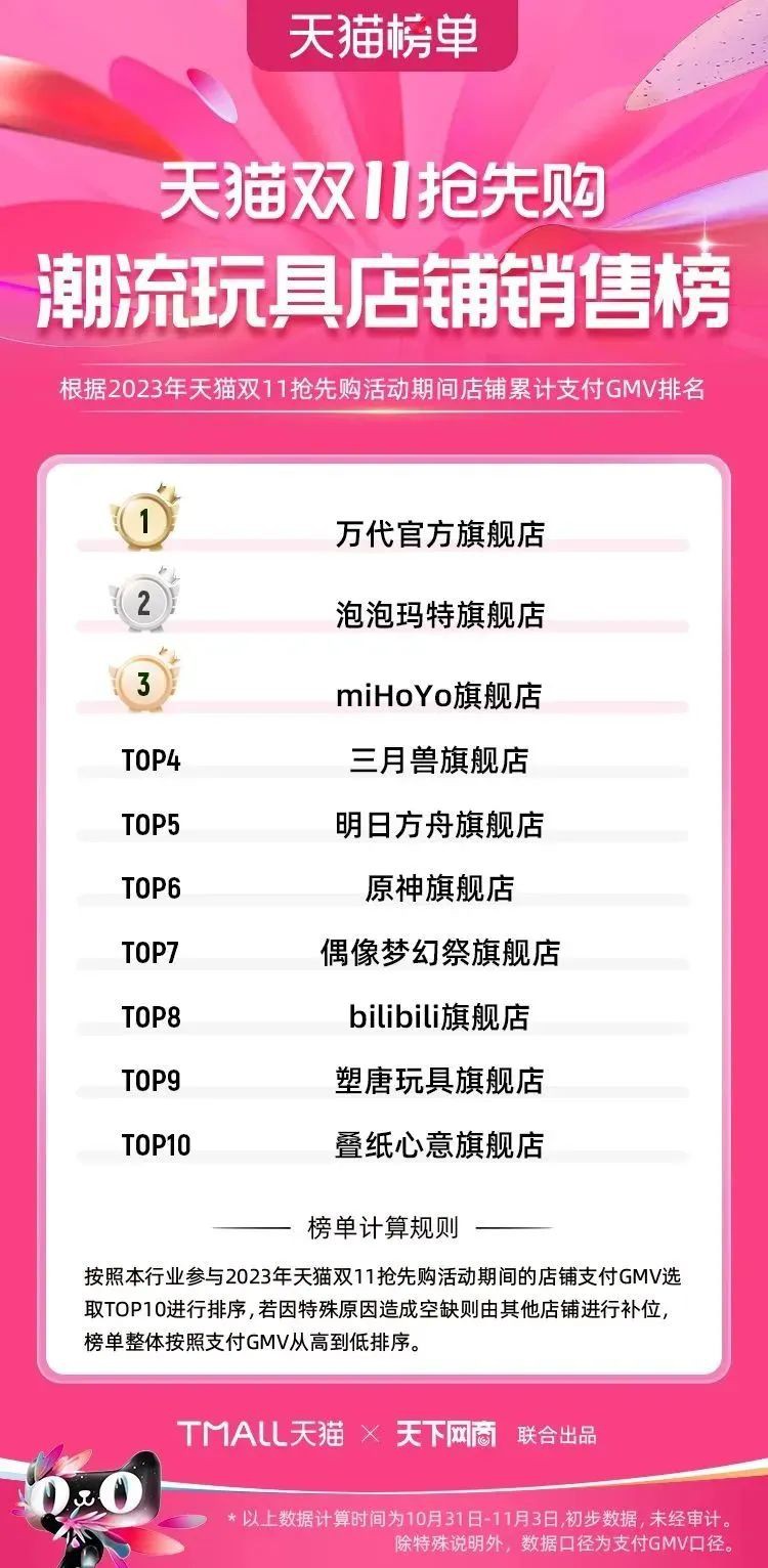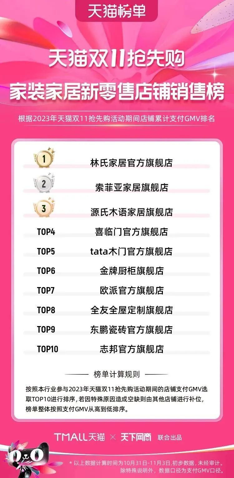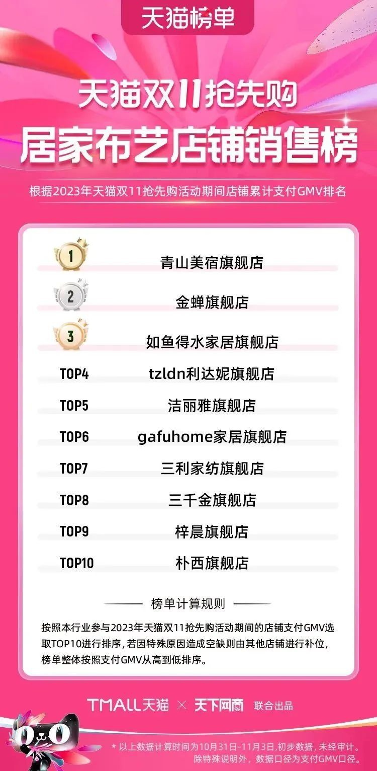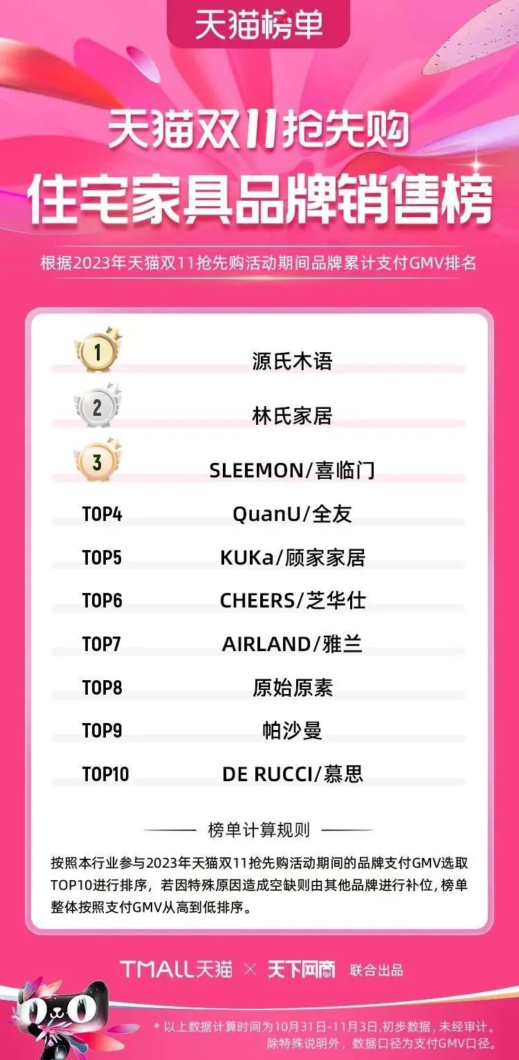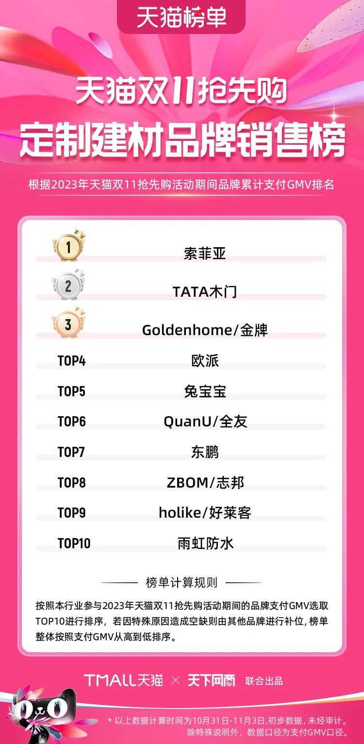 2023年天貓雙11強(qiáng)勁開局,第一波剛開售155個(gè)品牌開賣成交即破億,開售首小時(shí)7.19萬(wàn)個(gè)品牌成交額超去年首日全天。 11月4日,天貓雙11發(fā)布第一階段(10月31日-11月3日)品牌商家成交金額排行榜及品牌商家成交人數(shù)排行榜,大快消、服飾、運(yùn)動(dòng)戶外、消費(fèi)電子、家裝家居、玩具潮玩、食品生鮮、汽車等行業(yè)的“領(lǐng)跑者”出爐。 星圖最新數(shù)據(jù)顯示,2023年雙11正式開售首日,淘寶天貓份額占比近6成,市場(chǎng)份額相比去年進(jìn)一步擴(kuò)大。此外,QuestMobile數(shù)據(jù)顯示,2023年10月24日雙11預(yù)售當(dāng)天,淘寶APP活躍用戶數(shù)達(dá)5.07億,為行業(yè)第一,DAU同比增幅超5%。 作為品牌線上經(jīng)營(yíng)的主陣地,天貓雙11前,天貓投入總額20億的“真金白銀”,用于品牌商家經(jīng)營(yíng)激勵(lì),支持品牌以最小的投入,獲得最大的增長(zhǎng)。 以下為天貓雙11第一階段(10月31日-11月3日)榜單: 快消銷售榜 快消人氣榜 服飾時(shí)尚銷售榜 服飾時(shí)尚人氣榜 運(yùn)動(dòng)戶外銷售榜 運(yùn)動(dòng)戶外人氣榜 消費(fèi)電子銷售榜 消費(fèi)電子人氣榜 家裝家居銷售榜 家裝家居人氣榜 玩具潮玩銷售榜 玩具潮玩人氣榜 香氛香薰銷售榜 香氛香薰人氣榜 寵物銷售榜 寵物人氣榜 食品銷售榜 食品人氣榜 汽車人氣榜 汽車銷售榜 生鮮銷售榜 生鮮人氣榜 文教銷售榜 文教人氣榜 珠寶飾品銷售榜 珠寶飾品人氣榜 企業(yè)服務(wù)銷售榜 企業(yè)服務(wù)人氣榜 健康銷售榜 |